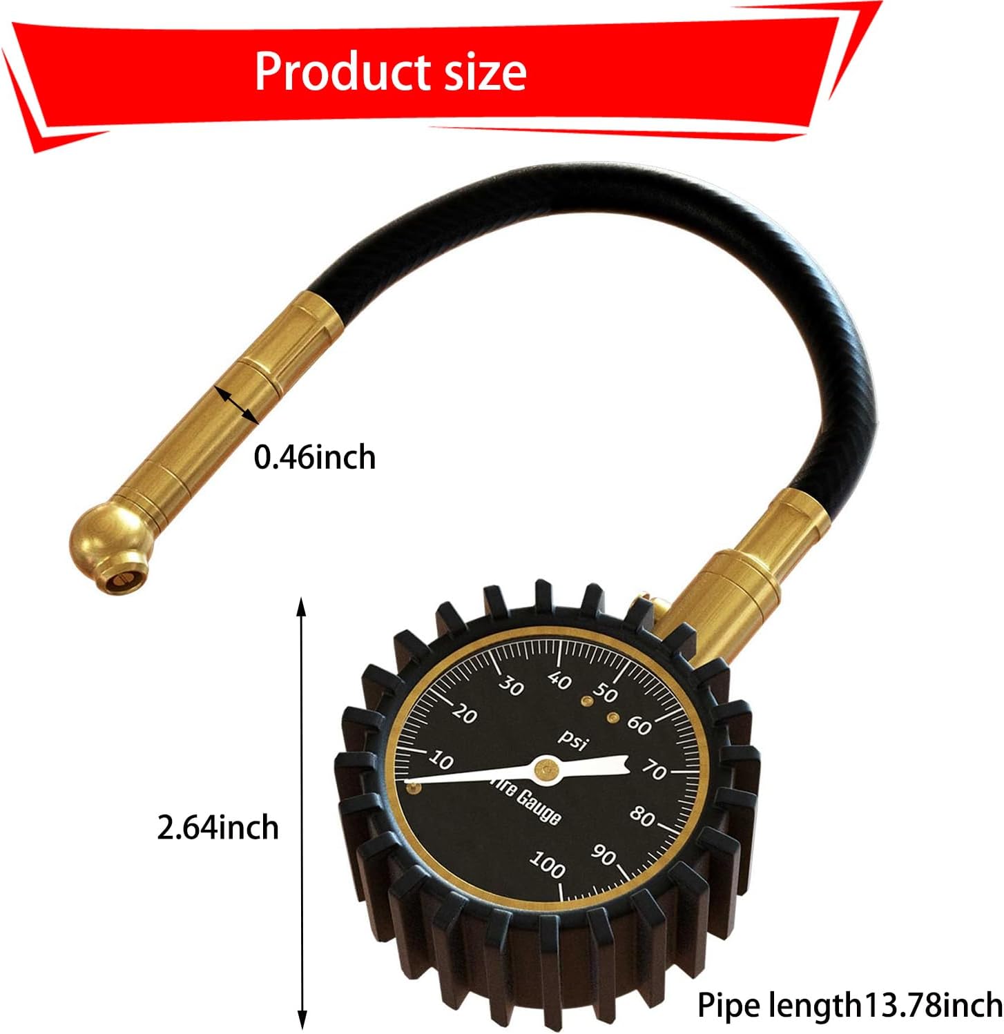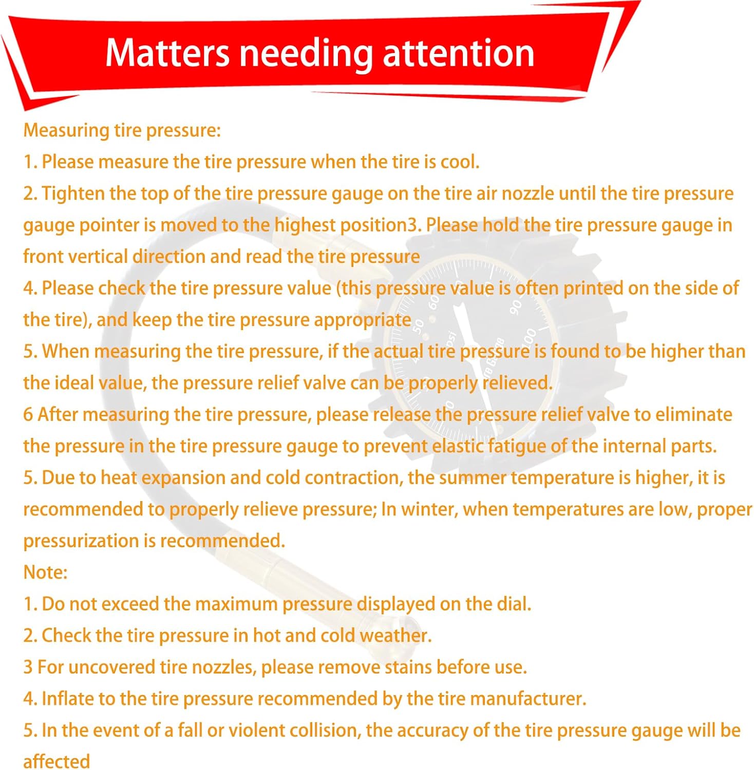 Materiales de alta calidad: el dial del manómetro de los neumáticos está hecho de material de goma, que puede proteger la estructura interna del dial en la mayor medida. La interfaz inferior del medidor de presión de neumáticos está hecha de material metálico. El material metálico no se deforma fácilmente y proporciona lecturas rápidas y precisas., Prueba: El dial del manómetro de los neumáticos utiliza un espejo acrílico transparente para hacer que la pantalla sea más precisa. Para asegurarse de que sus neumáticos están conduciendo correctamente, se recomienda verificar la presión de los neumáticos de su vehículo semanalmente. Los medidores de presión de los neumáticos funcionan mejor cuando se comprueba regularmente la presión de los neumáticos. Los manómetros de presión de neumáticos proporcionan lecturas ultra precisas en cualquier lugar., Ajuste cero: el dial cuenta con una conexión de válvula giratoria que facilita la medición de la presión en cualquier ángulo de neumático. Al mismo tiempo, se diseña una válvula en el medio de la tubería para facilitar la descarga de materiales o el reinicio cero. Las válvulas facilitan la inspección. Los medidores de presión de neumáticos no requieren energía para verificar fácilmente., Fácil instalación: solo un clic para mantener la presión en tus neumáticos equilibrada. Presione el conector del manómetro de los neumáticos contra la válvula hasta que el puntero del manómetro de presión de los neumáticos se mueva a la posición más alta. Tenga en cuenta que el manómetro de los neumáticos debe restablecerse a cero después de su uso., Nota: Al medir, asegúrese de que la presión en los neumáticos del vehículo no exceda la presión máxima que se muestra en el dial. Para válvulas de neumáticos sin tapas, limpia la superficie de la válvula antes de usar. En colisiones severas, la precisión de las lecturas del manómetro de los neumáticos puede verse afectada.