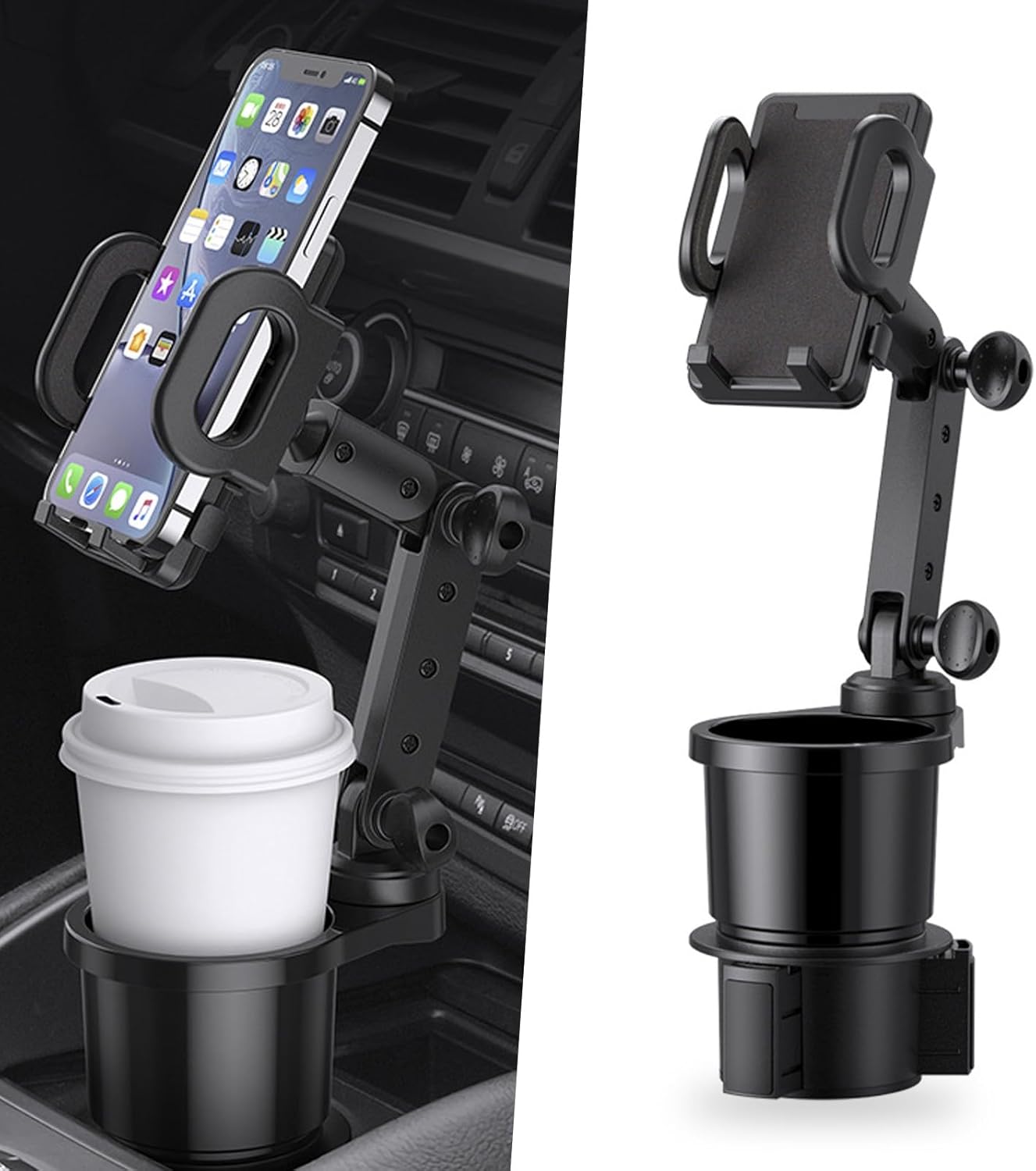Portavasos 2 en 1: Este producto combina un portavasos y un soporte para teléfono móvil, que se puede usar al mismo tiempo, ahorrando espacio interno y puede colocar teléfonos móviles y vasos de agua al mismo tiempo. Material duradero que se puede utilizar durante mucho tiempo con tranquilidad. El brazo de soporte del teléfono móvil se puede extender y puede ser utilizado tanto por el conductor como por el pasajero., Antideslizante estable: el soporte para teléfono móvil está equipado con algodón antideslizante, y la parte inferior del portavasos está equipada con espuma antigolpes. Durante giros bruscos, frenado de emergencia, etc., el soporte puede proteger eficazmente el cuerpo del teléfono móvil y evitar que se caiga. Evita el ruido causado por el deslizamiento de la taza y añade problemas innecesarios, y mejora la estabilidad durante la conducción., Rotación de 360 grados: la parte inferior del brazo mecánico del soporte del teléfono móvil se puede girar 360 grados sin sacudidas fuertes, y se puede ajustar y apretar manualmente. Los ángulos arriba, abajo, izquierdo y recto se pueden ajustar libremente de acuerdo a las necesidades del soporte, lo que te brinda una experiencia de conducción segura y cómoda. Hay un pequeño botón en el lado derecho del soporte del teléfono móvil, que se puede abrir presionándolo., Ajuste universal: el portavasos es adecuado para tazas de menos de 2.8 pulgadas y puede contener la mayoría de tazas de agua, bebidas y café. El soporte para teléfono se adapta a teléfonos de 1.8 pulgadas a 3.9 pulgadas, adecuado para la mayoría de iPhones y la mayoría de otros teléfonos inteligentes. El teléfono móvil es fácil de instalar, conectar y usar, y se puede quitar en cualquier momento cuando no esté en uso. Adecuado para la mayoría de los coches., Fácil de instalar: Coloque la base del portavasos en el portavasos del automóvil, luego gire el portavasos para sacar la llave de fijación en la base hasta que se fije. Ten en cuenta que este portavasos es adecuado para automóviles cuyos portavasos originales son redondos. Esto proporciona un mejor ajuste y estabilidad.