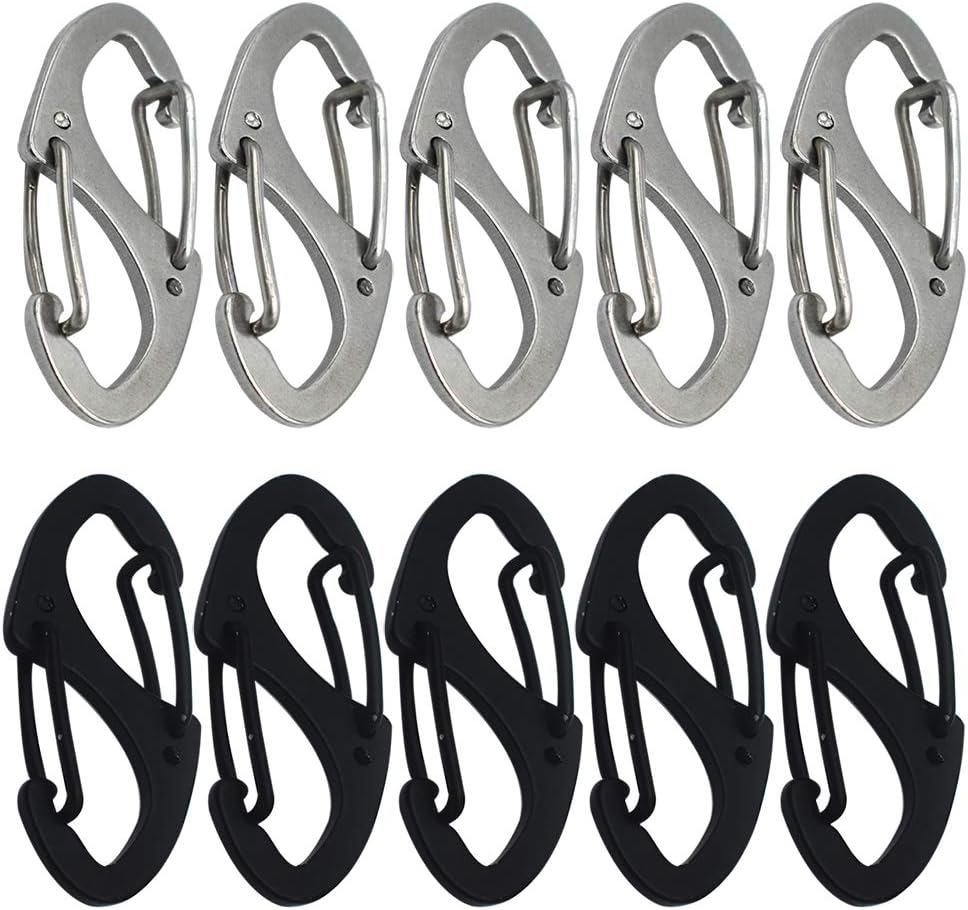 Mosquetón pequeño doble de acero inoxidable. Nota, pequeños ganchos a presión. Longitud total: 1.6 pulgadas, ancho 0.6 pulgadas, grosor 0.059 in. y la trampa es pequeña (puerta de apertura de 0.39 pulgadas), por lo que la cuerda más grande puede ser difícil de meter en el gancho, Diseño de doble hebilla con 2 ganchos de puerta de resorte. Bloqueo deslizante de resorte, permite una rápida conexión/desconexión de cuerdas, cadenas y llaves, o etiquetas de identificación de mascotas. Nota: la tensión del alambre de resorte es pequeña, no puede soportar cargas pesadas, Hecho de material duradero de alta calidad. Clips de cable fuertes y duraderos, sin bordes afilados ni dentados, Clips deslizantes dobles multiusos. Ambos extremos pueden colgar artículos, gran accesorio para organizar e identificar llaves u otros objetos pequeños, 5 piezas negras y 5 piezas de mosquetón dobles de acero inoxidable pequeños plateados incluidos