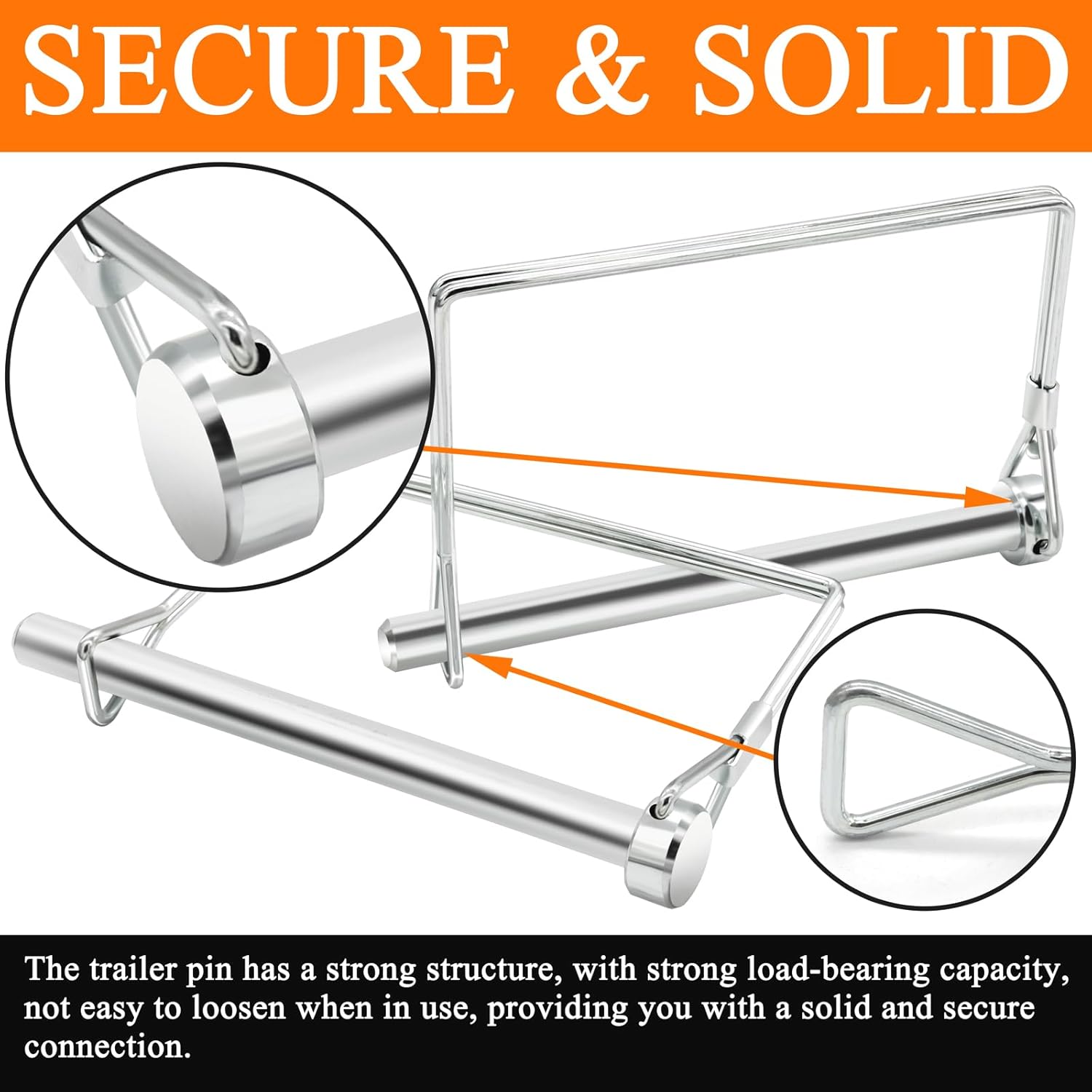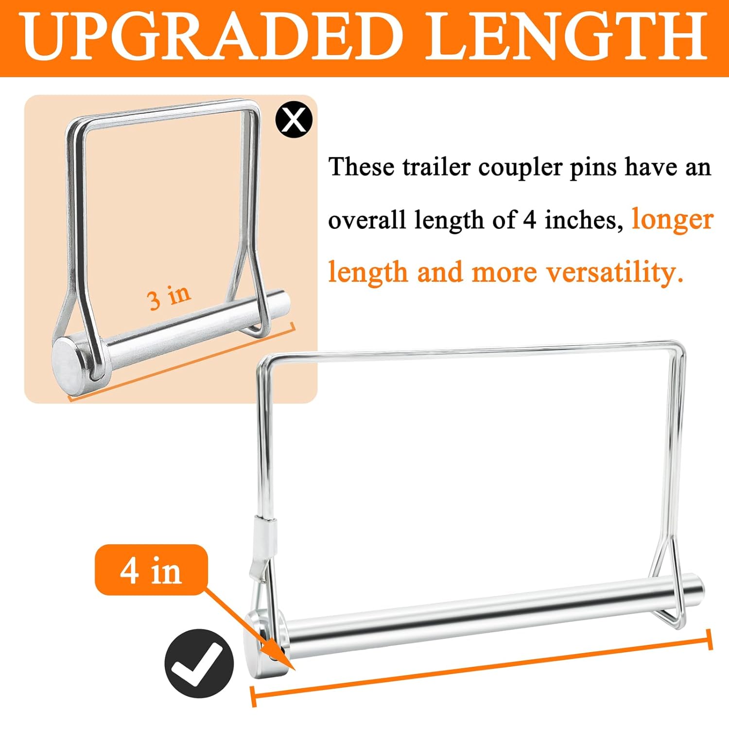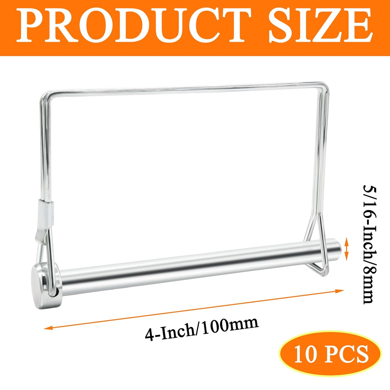 Tamaño: cada pasador de bloqueo de eje cuadrado es de 5/16 pulgadas de diámetro y 4 pulgadas de largo., Material: hecho de acero al carbono de alta calidad con acabado galvanizado duradero para una excelente resistencia al óxido y a la corrosión, adecuado para uso en exteriores a largo plazo., Longitud mejorada: estos pasadores de acoplador de remolque tienen una longitud total de 4 pulgadas, longitud más larga y más versatilidad., FÁCIL DE USAR: Simplemente abra o cierre el pestillo con resorte al instalar o quitar. Diseñados para una instalación rápida y fácil, estos pasadores proporcionan una solución conveniente para fijación y fijación., Seguro y sólido: el pasador del remolque tiene una estructura fuerte, con una fuerte capacidad de carga, no es fácil de aflojar cuando está en uso, lo que le proporciona una conexión sólida y segura., APLICACIONES: Ideal para granja, jardín, camión, barco, acoplador de remolque, accesorios de toma de fuerza y muchas otras aplicaciones de bloqueo.