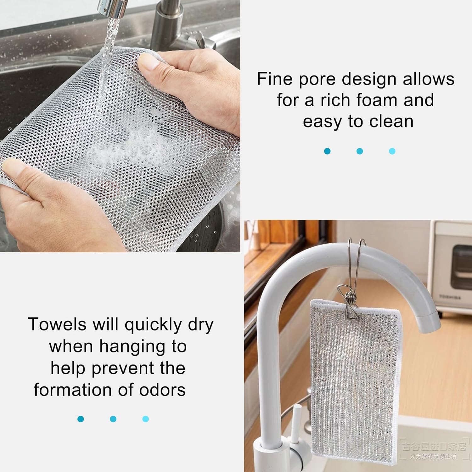Potente efecto de limpieza: el paño multifuncional de alambre antiarañazos adopta tecnología avanzada de tejido de celosía en forma de diamante y material de alambre de metal de alta calidad, manchas de aceite limpias eficientes. No daña la olla ni la mano., Fácil de enjuagar y reutilizar: a diferencia de muchos paños de malla para fregar platos, la superficie de tejido de celosía en forma de diamante es más fácil de enjuagar y de secado rápido, evitando olores sucios, fabricado con bordes cosidos overlock y diseño de doble capa, por lo que no se desmoronarán en el lavado., 【Tamaño multifuncional del paño de cocina】Los trapos de cocina miden 7.87 x 7.87 pulgadas, ligeramente más grandes que las esponjas de cocina, duran más que las esponjas, son súper suaves, no rayan y sin pelusas, seguros y eficaces para la limpieza., Uso húmedo y seco: el diseño de agujeros finos hace que sea rica fácilmente en espuma, se puede utilizar para limpiar platos, ollas y sartenes, se puede utilizar como un trapo para limpiar parrillas, estufas, barbacoas, etc. Un buen ayudante en tu limpieza diaria., Ampliamente utilizado: el paño de microfibra está hecho de poliéster y material de alambre de acero, seguro para todas las superficies de cocina y todos los materiales de ollas, sartenes, platos, encimeras y encimeras, también se puede utilizar para raspar la piel de los ingredientes y lavar frutas.