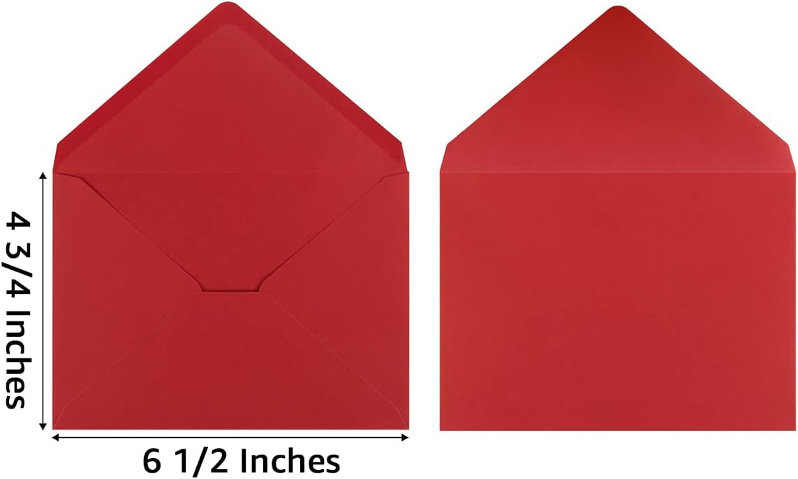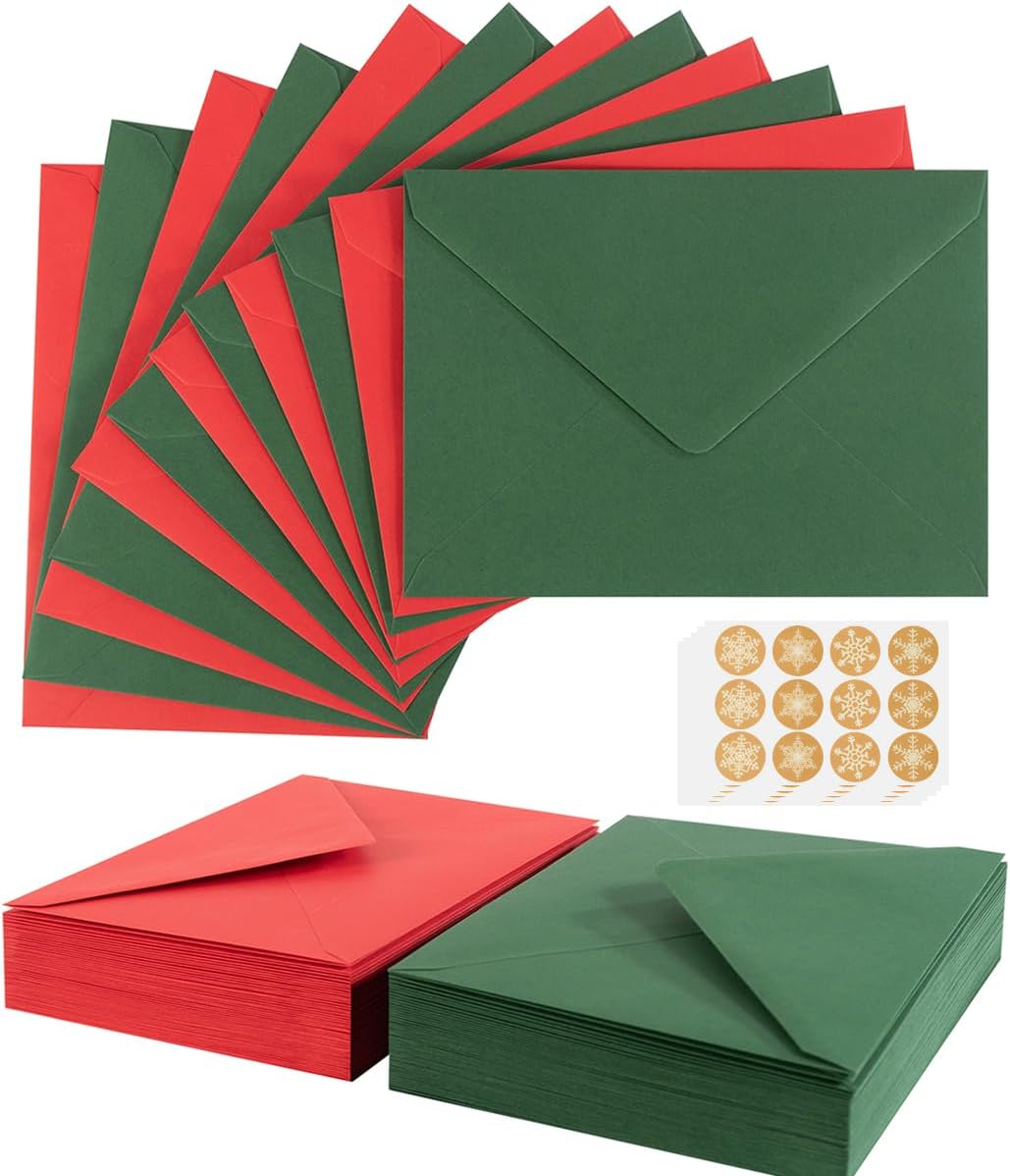 El paquete incluye: el paquete de 100 sobres A6 de Navidad (50 verdes + 50 rojos) y 120 calcomanías son perfectos para tus tarjetas de felicitación de 4 x 6, cumpleaños, baby showers, tarjetas de invitación de fiesta de vacaciones, Material: los sobres de Navidad A6 de 6 1/2 x 4 3/4 pulgadas están hechos de papel de 3.88 oz/m²; los sobres con grosor moderado, no son fáciles de romper, pueden satisfacer todas tus necesidades de 4 x 6 tarjetas;, Cómodo de usar: Al usarlos, humedezca el pegamento en el área de sellado del sobre; Luego doble el sellador y manténgalo durante aproximadamente un minuto; este diseño también reduce la cantidad de basura;, Los sobres de Navidad A6 traerán buen humor a tus amigos; comparte tu alegría con tus amigos;, Multiusos: estos sobres A6 se pueden utilizar en muchas ocasiones, como cumpleaños, invitaciones de boda, invitaciones de graduación, baby showers, tarjetas de felicitación de vacaciones, tarjetas de visita, correos personales regulares, etc.