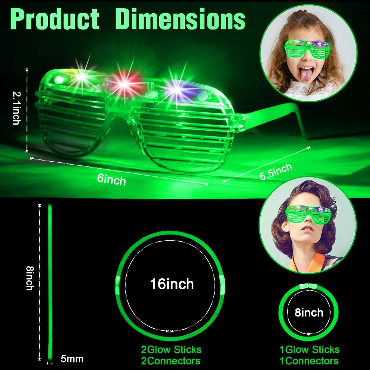 Especificaciones: Suministros de fiesta brillantes: 15 lentes de iluminación verde LED y 100 varillas brillantes verdes que obtendrás, sea cual sea la boda, la noche de soltero o la fiesta temática, hace que tu fiesta sea fresca y divertida. Con diseño de persianas para gafas LED y barras brillantes superbrillantes, elegantes y populares, son grandes juguetes para iluminar mejor el ambiente de tu fiesta. 3 pilas LED en el interior, 3 modos de iluminación diferentes, flash rápido, flash lento y flash normal, simplemente presiona el interruptor para cambiarlo, fácil de usar. Los lentes con luz LED y las varillas luminosas se utilizan material plástico de alta calidad, seguro y duradero. Estos interesantes y divertidos juguetes de luz LED son decoraciones especiales y te ayudan a convertirte en la estrella más atractiva de la fiesta. Nota: Puede haber ligeras diferencias de tamaño debido a la medición manual. Puede haber una ligera diferencia de color debido a las diferentes pantallas.