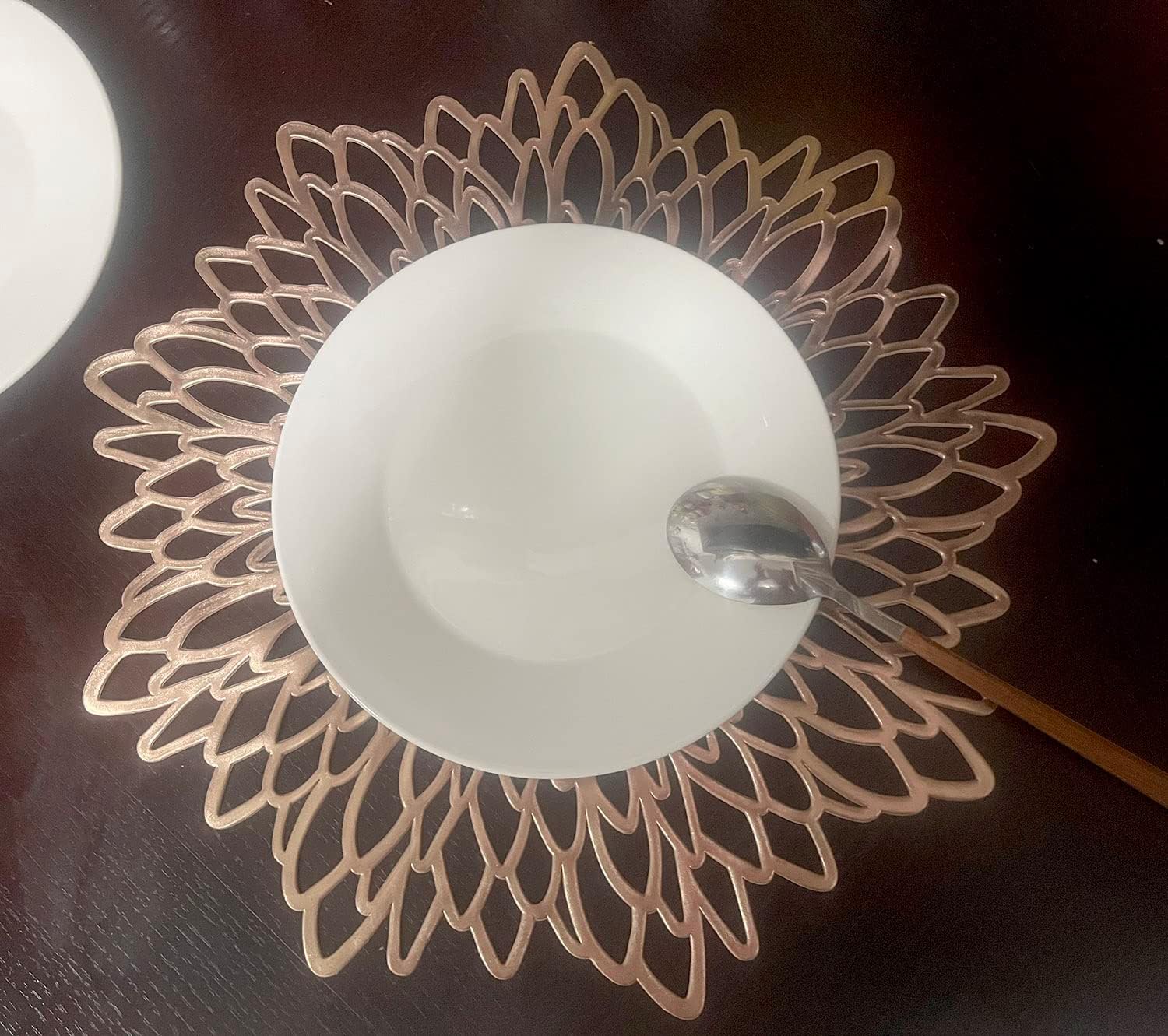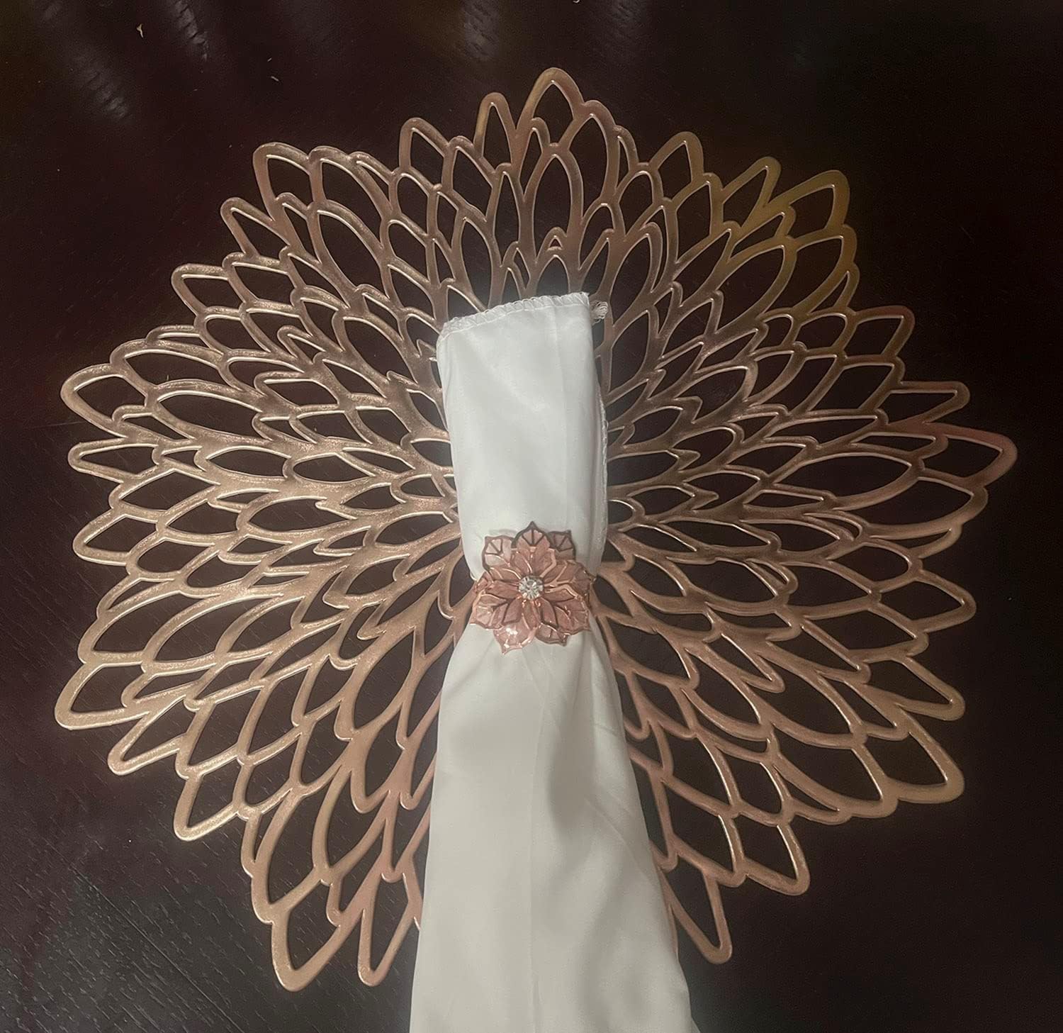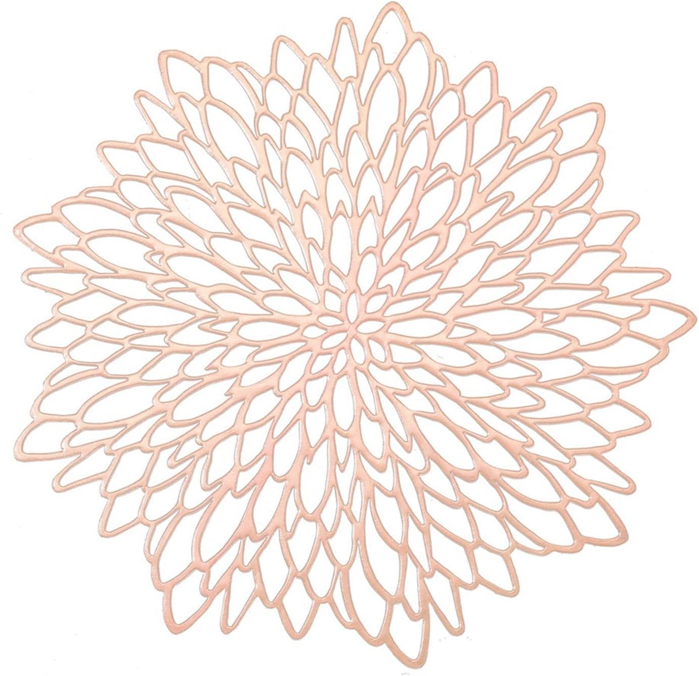 Nombre: mantel individual de flores Paquete: Juego de 12 Material: vinilo ecológico. Tamaño: Diámetro 15” (15.0 in) Color: oro rosa Uso: viste y protege las mesas. Características: hermoso, duradero, no se decolora, antideslizante, aislamiento térmico Lavado: limpie con un paño húmedo.