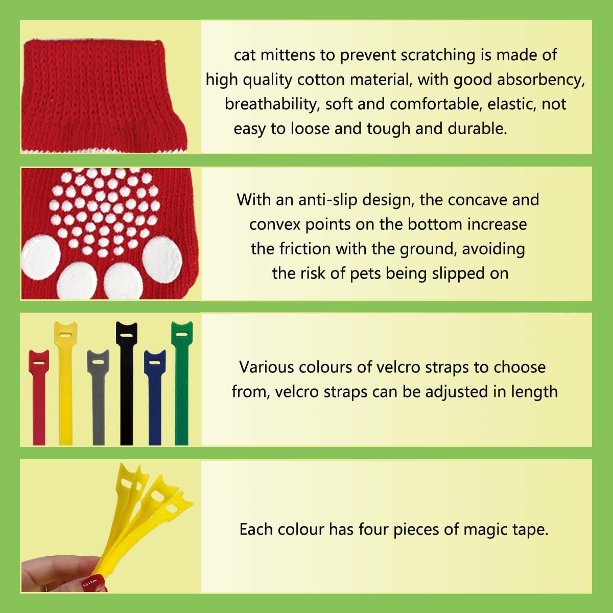 Algodón: los guantes para gatos para evitar arañazos están hechos de material de algodón de alta calidad, con absorción de humedad y transpirable, suave y cómodo, elástico para no estrangular las pequeñas patas de carne, no es fácil de aflojar y resistente y duradero, puede ser seguro para contactar, puede servir a tu mascota durante mucho tiempo, y luego las mascotas activas también pueden soportar, Antideslizante y protección: estos zapatos para mascotas resuelven los problemas de la mayoría de las personas, cuando bañas a tu gato o recortas las uñas, deja que use zapatos para mascotas, hará que el gato se calme y evitará que te raye el gato, y la parte inferior está diseñada con antideslizante, los puntos cóncavos y convexos en la parte inferior aumentan la fricción con el suelo, lo que evita eficazmente que tu mascota se caiga, es muy práctico, Ayudante de sofá: en el proceso de tener un gato, inevitablemente sucederá que los gatos arañen los costosos sofás, los guantes para gatos para evitar arañazos pueden resolver sus problemas, deje que su gato use estos botines para gatos, que pueden evitar eficazmente que los muebles se rayen, para que usted y sus queridas mascotas puedan disfrutar de la coexistencia del tiempo en armonía, Bonito patrón: estos zapatos para gatos tienen un total de 6 patrones interesantes, puedes de acuerdo a tu estado de ánimo, con diferentes vestidos para tu mascota, deja que tu mascota sea siempre el centro de atención de toda la escena, pero también para que tu mascota prepare 6 colores de velcro, se puede utilizar para sujetar los zapatos de gato, Servicio atento: Si tiene alguna pregunta durante el uso de botines para gatos, no dude en contactarnos, estaremos 24 horas para su servicio, estamos comprometidos a proporcionar a cada cliente una experiencia de compra agradable