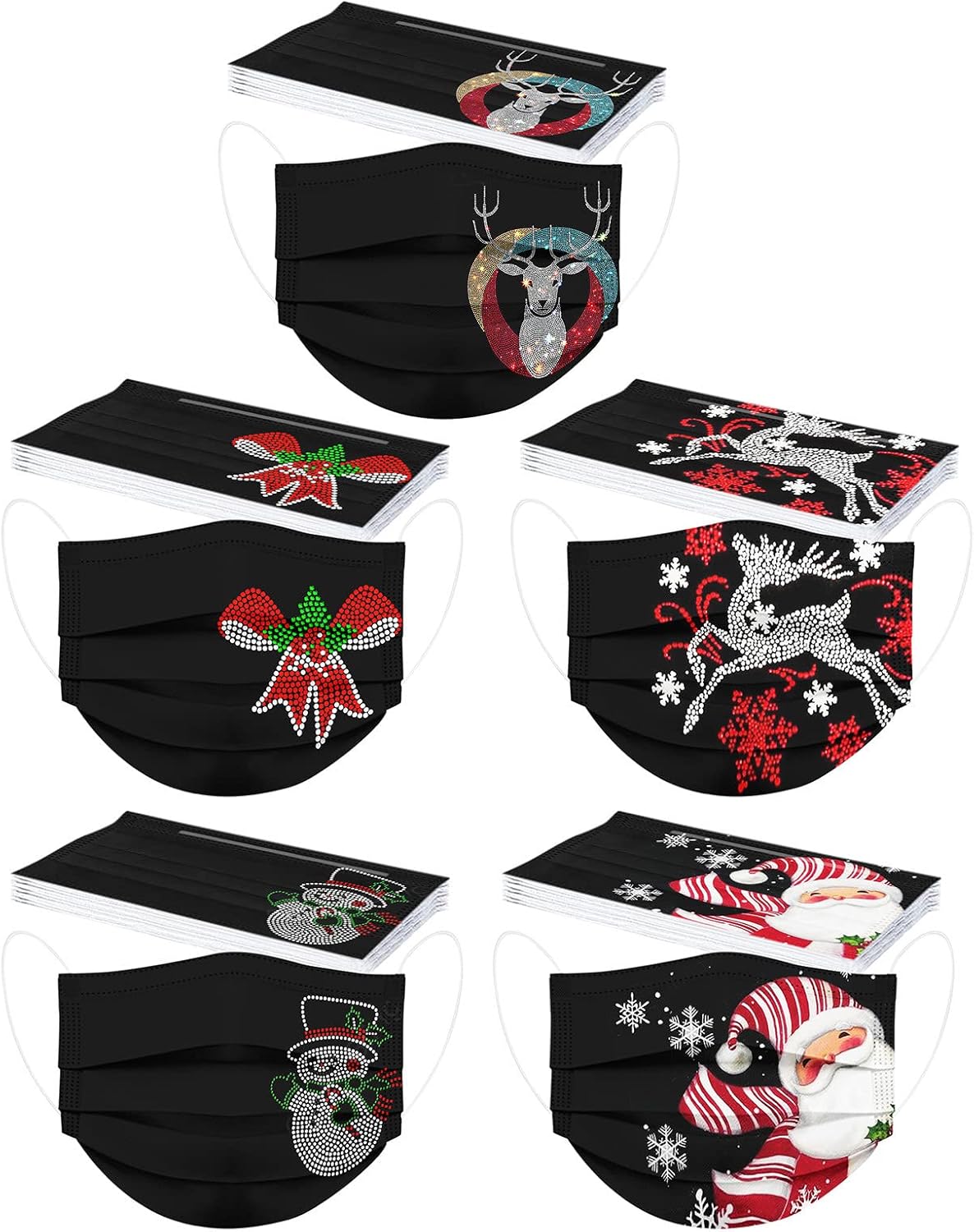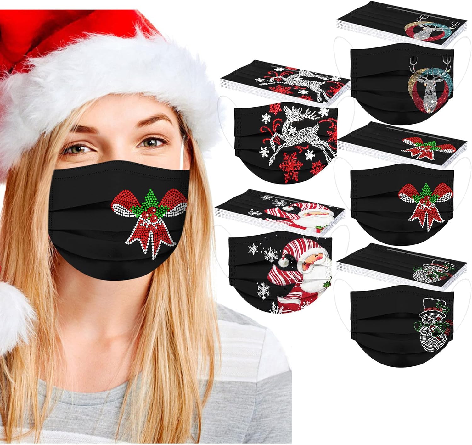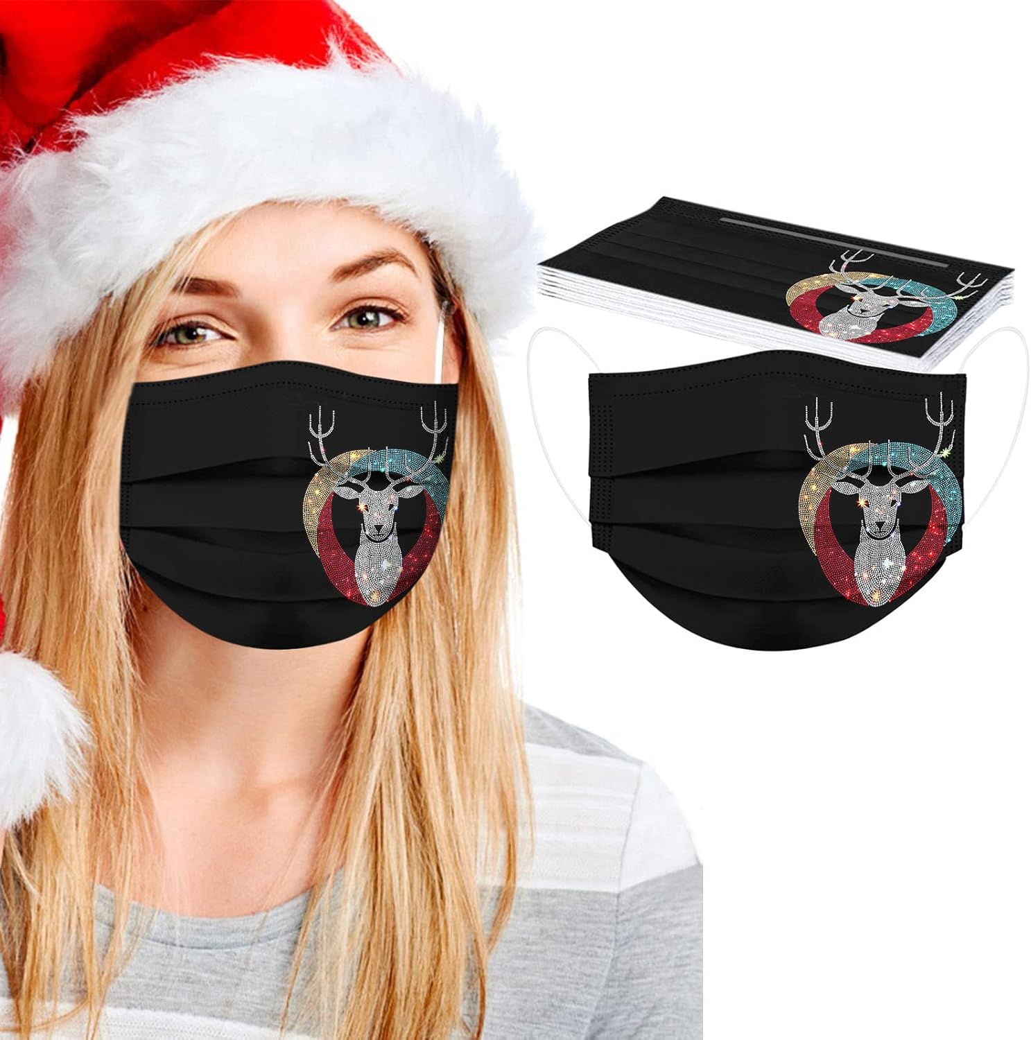50 cubrebocas desechables de invierno para adultos, 3 capas con alambre para la nariz, diseño de copos de nieve, Papá Noel, renos