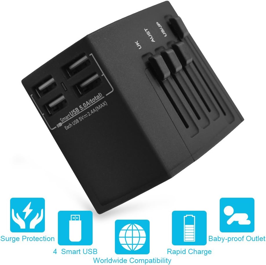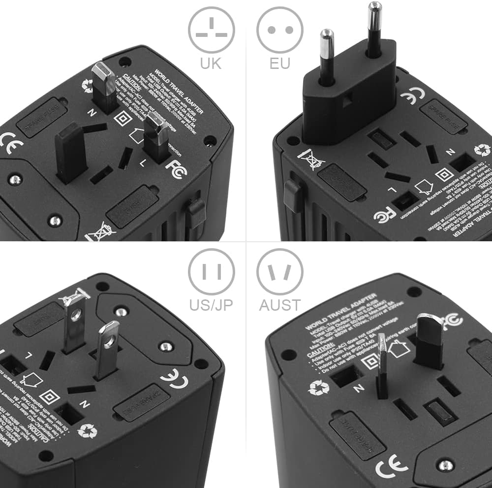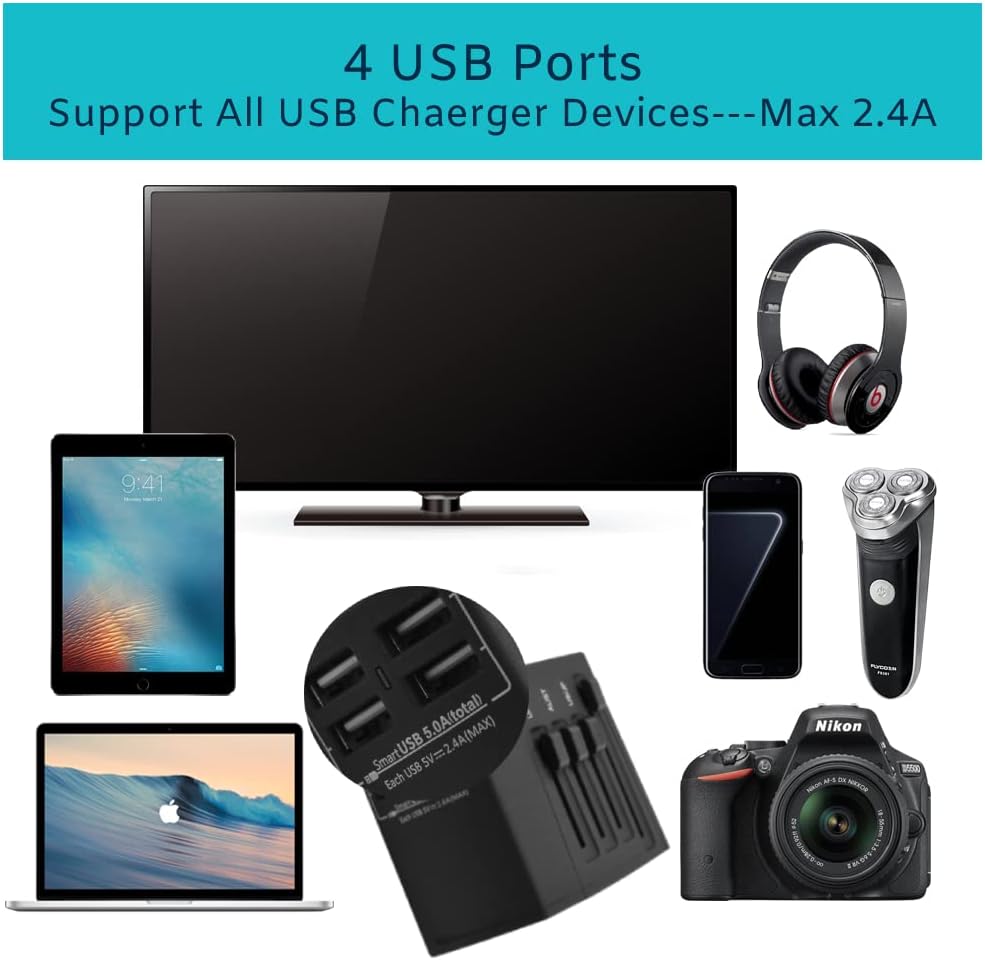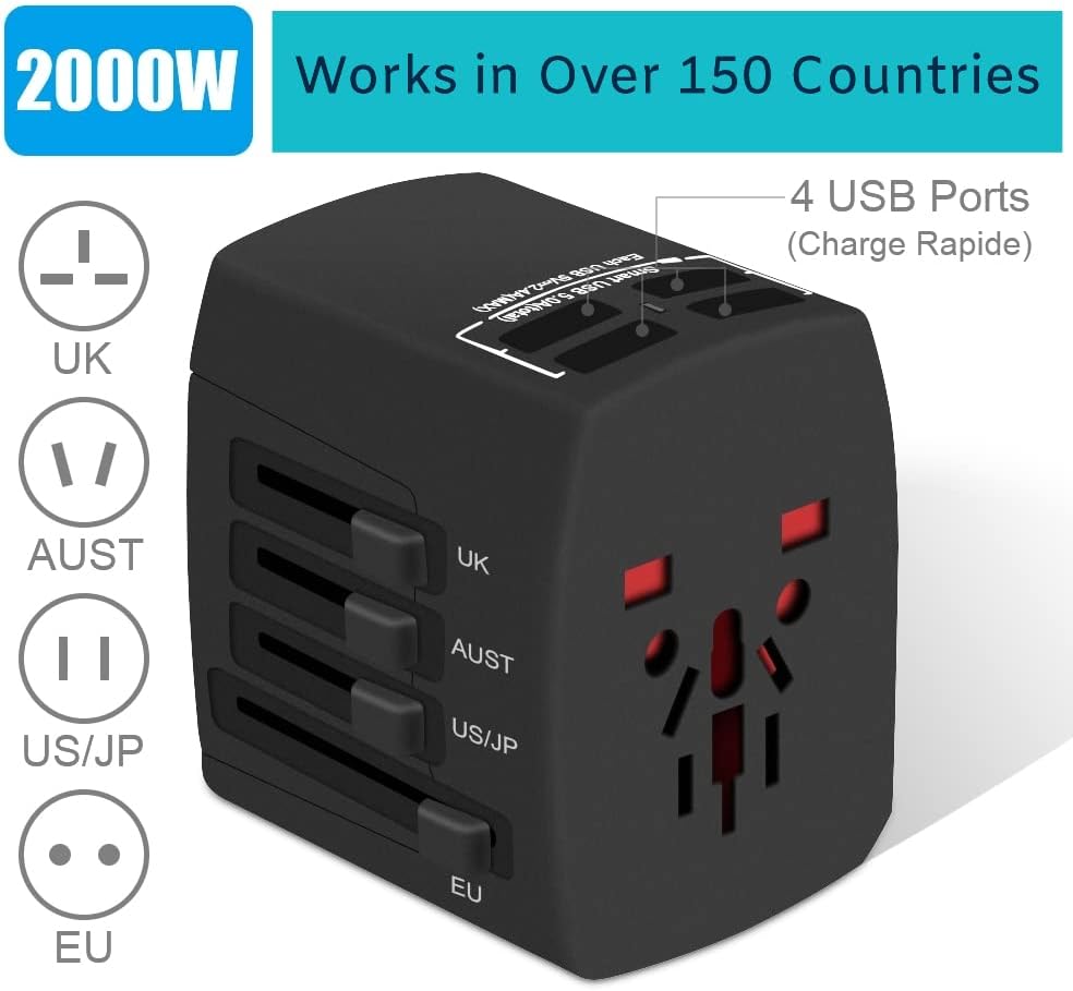 Adaptador de corriente de viaje universal en todo el mundo, adaptador internacional de 2000 W con 4 puertos USB, Reino UnidoUEAUEE. UU. (más de 200
