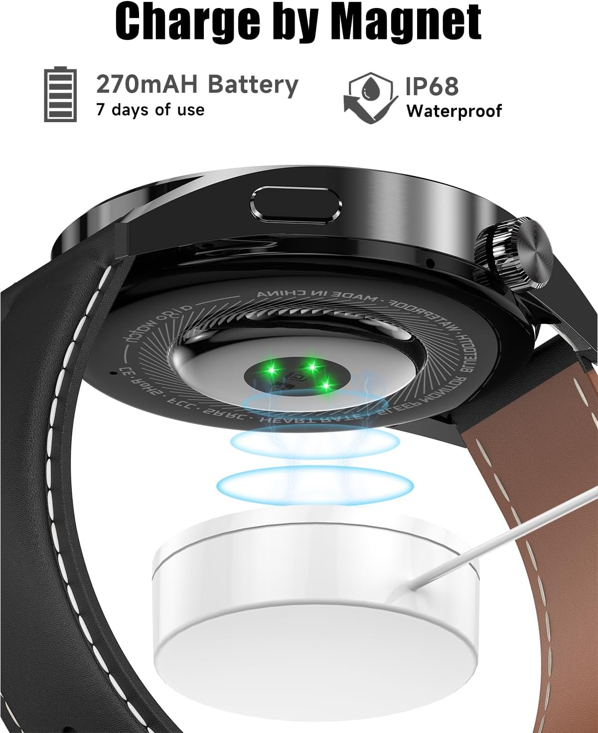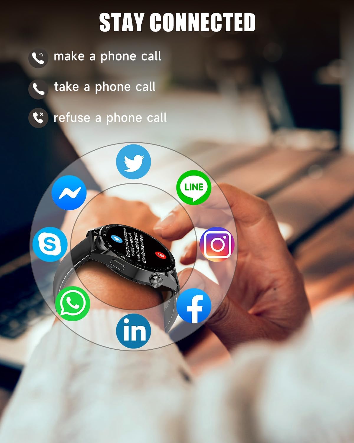 Estilo atemporal, núcleo inteligente: el UM98 combina a la perfección el encanto clásico de un reloj redondo con un núcleo robusto de tecnología moderna: una verdadera obra maestra del reloj inteligente. Hecho de acero inoxidable duradero, este reloj inteligente no solo ofrece estética, sino que también está construido para soportar condiciones difíciles. Navegue sin esfuerzo en la amplia pantalla táctil completa de 1.45 pulgadas para una experiencia de reloj inteligente visualmente impresionante. Caras de reloj versátiles, correas duales: eleva tu experiencia de reloj inteligente personalizando tu UM98 con una variedad de opciones de esfera de reloj. Disfruta de la flexibilidad de cambiar entre dos materiales de correa diferentes, personalizando tu reloj inteligente para que coincida con tu estilo y preferencias únicos. Tu mejor compañero inteligente: activa el asistente de voz de tu teléfono inteligente al instante con una simple pulsación larga en este reloj inteligente. El UM98 va más allá de las barreras lingüísticas, ofreciendo soporte de traducción multilingüe para una comunicación global sin esfuerzo, un verdadero sello distintivo de un compañero inteligente de siguiente nivel. Aptitud robusta, durabilidad inquebrantable: Con una impresionante clasificación de impermeabilidad IP68, el UM98 es su reloj inteligente ideal para todos los entornos. Explora múltiples modos deportivos mientras que este reloj inteligente proporciona un seguimiento integral de la salud, incluyendo frecuencia cardíaca, estrés, oxígeno en sangre y monitoreo del sueño, asegurando que tu bienestar sea monitoreado de cerca con este confiable compañero inteligente. Duración de la batería extendida: Adopte energía duradera en este reloj inteligente, despidiéndose de la molestia de la carga frecuente. El UM98 está diseñado para aventuras duraderas, por lo que es la mejor opción para una experiencia de reloj inteligente confiable y duradera.