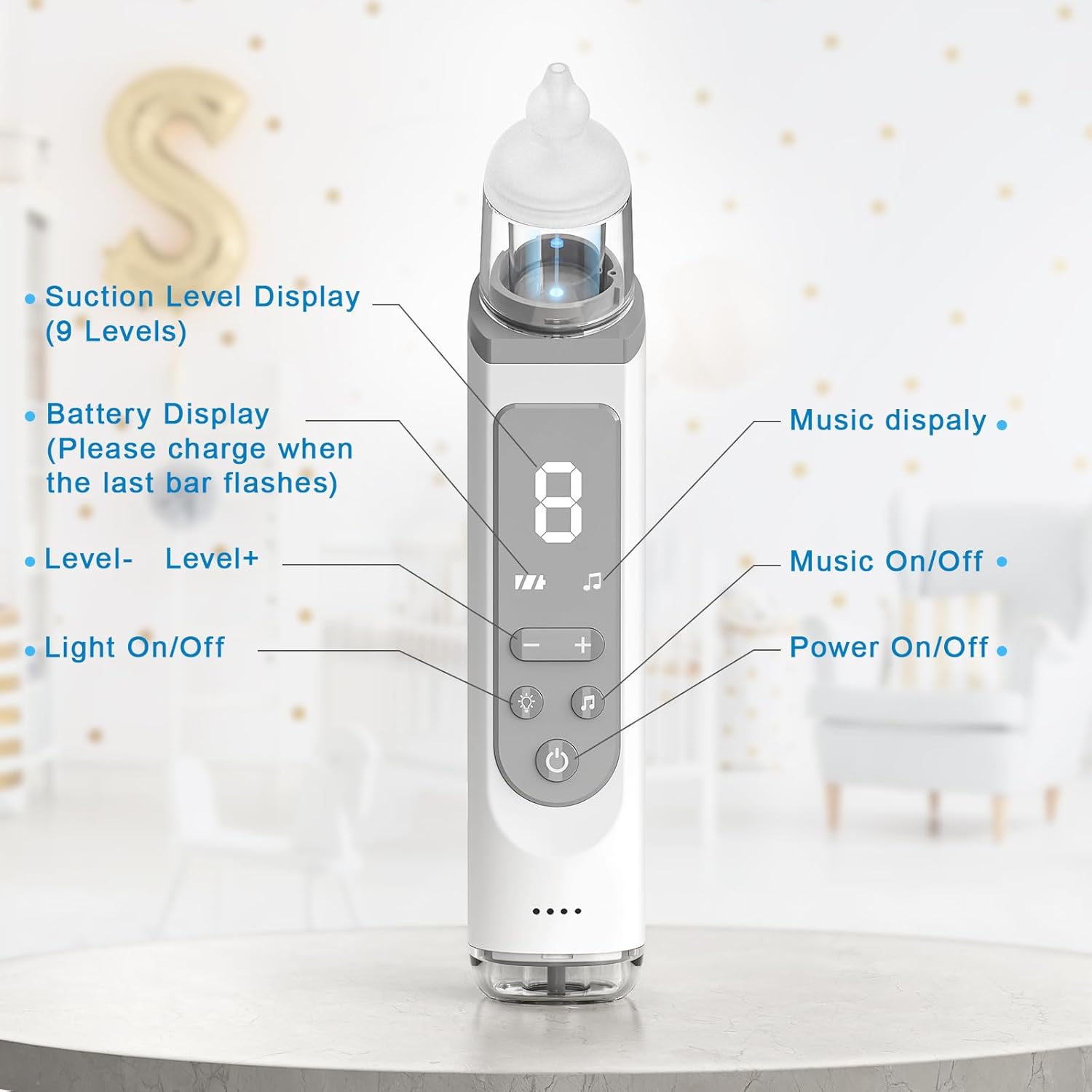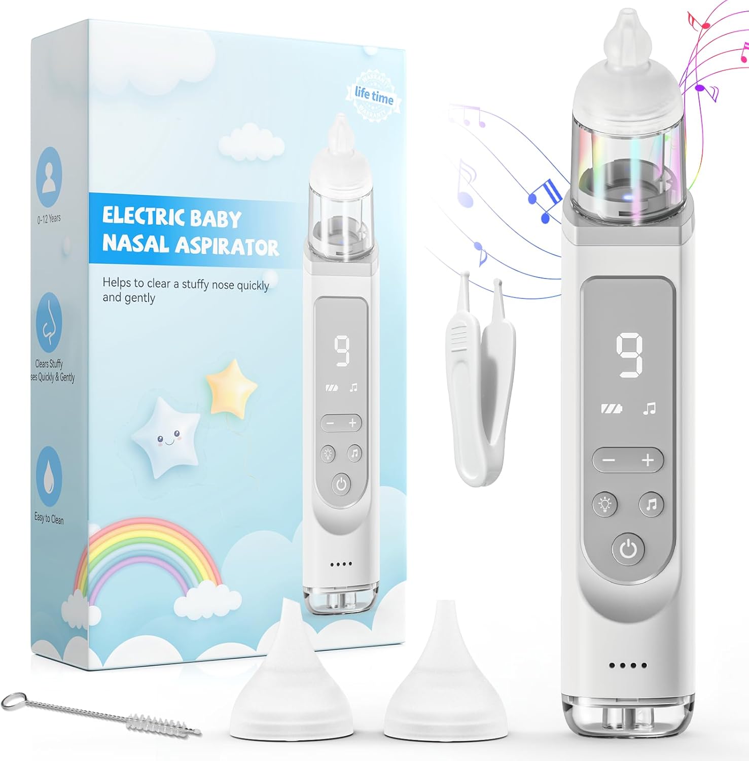 ✨Seguro y eficiente: chupador de nariz para bebé con 9 niveles de succión ajustables, que pueden limpiar fácil y eficazmente el líquido y la mucosidad dentro de la nariz. Sin embargo, cuando hay mocos obstinados y mocos dentro de la nariz de su bebé. Sugiera usar spray salino para suavizar los mocos obstinados. Espere de 30 segundos a 1 minuto, luego chupa el moco. Booger sucker ayuda a los bebés a tener una respiración nasal saludable., ✨Suave y cómodo: el aspirador nasal para bebé está equipado con 3 puntas de silicona diferentes de grado alimenticio que siguen el estricto estándar de fabricación. Todas las puntas de silicona están hechas de materiales suaves que se ajustan mejor a la forma de la nariz del bebé y evitan el daño de las membranas nasales del bebé., ✨Innovación: el chupador de nariz para bebé adaptó la habilidad innovadora que mantiene la alta velocidad de succión con poco ruido. Hay algunos diseños aptos para niños, como la función relajante ligera y la música. Estas innovaciones pueden ayudar a los padres a usar fácilmente el chupador de nariz para el bebé al atraer la atención del bebé., ✨Fácil de limpiar: la taza de recogida de moco del aspirador nasal para bebés es transparente y extraíble, por lo que se limpia fácilmente enjuagando con agua tibia y jabón. Y el interior de las puntas de silicona se puede lavar con el cepillo que suministramos. El tanque de almacenamiento de moco está separado del artículo que evita eficazmente el flujo de fluido hacia atrás., ✨Recargable por USB y contenido del paquete: el chupador de nariz para bebé está diseñado con batería de gran capacidad e interior recargable por USB. El aspirador nasal es portátil y proporcionamos la caja de almacenamiento que puede transportarse fácilmente. Contenido del paquete: 1 caja de almacenamiento, 1 ventosa nasal, 3 puntas de silicona, 1 cepillo, 1 clip, 1 manual de usuario, 1 tubo de agua, 1 cable de carga, 1 tubo de drenaje.