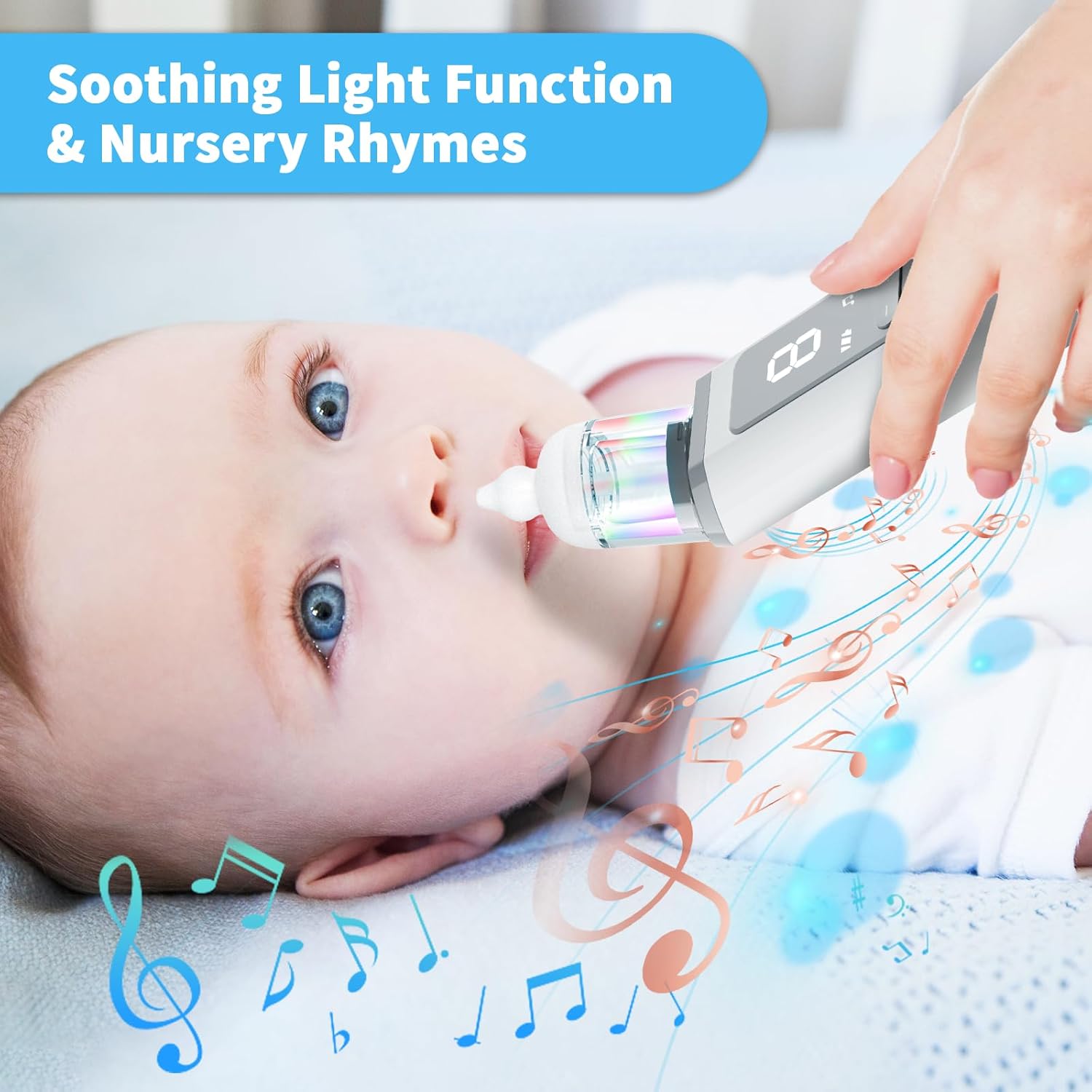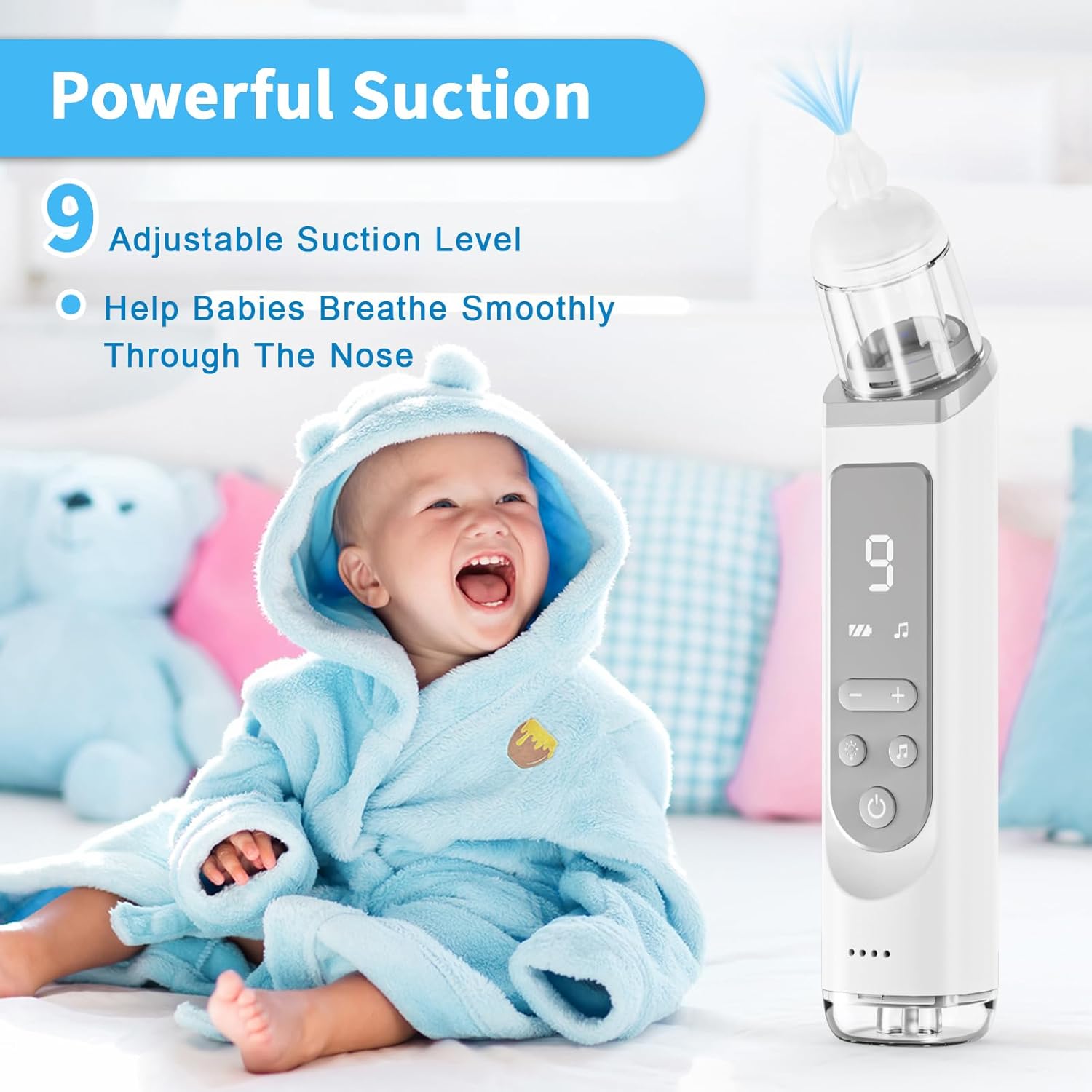 Aspirador nasal para bebé, succión nasal eléctrica para niños pequeños con 3 puntas de silicona, 9 niveles de succión ajustables, función calmante
