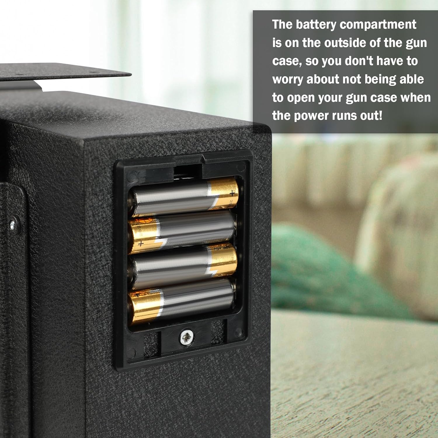 Alta calidad: esta caja fuerte para armas está hecha de acero grueso de alta calidad. La construcción duradera y soldada con autógena antipalanca evita eficazmente que los ladrones entren y también mantiene el peligro lejos de tus hijos. La espuma de alta densidad integrada protegerá mejor tu arma de fuego de arañazos causados por vibraciones. Es lo suficientemente seguro como para almacenar tu pistola., [3 vías para abrir la caja fuerte] 1. Sistema de identificación biométrica inteligente de huellas dactilares altamente preciso y actualizado, acceso rápido con escaneo de huellas dactilares; gran capacidad de almacenamiento, se pueden configurar hasta 160 huellas dactilares. 2. La caja fuerte para pistola con teclado sobresaliente retroiluminado que se puede configurar una contraseña de 3 a 6 dígitos. 3. Dos llaves de emergencia de repuesto, que puedes utilizar para abrir la caja fuerte en cualquier momento., [Acceso rápido a tu pista] Menos de 1 segundo de reconocimiento de huellas dactilares, la puerta segura se desliza automáticamente y revela la pistola, lo que te permite agarrar la pistola en el menor tiempo. Dado que el compartimento de la batería está en la parte posterior, cuando la batería se agota, puedes reemplazarla por una nueva y no tienes que preocuparte por encontrar tus llaves., Caja fuerte para armas de montaje pequeño: el diseño vertical delgado es perfecto para esconderse debajo de una mesa, junto a una mesita de noche o donde quieras. El acabado resistente a la corrosión y negro hace que sea fácil de mezclar en cualquier espacio interior. También se puede utilizar directamente en la mesa dependiendo de tus necesidades., [Servicio al cliente perfecto] Contiene instrucciones profesionales y tornillos de montaje, solo necesitas pasar 3 minutos leyendo las instrucciones y usarlo inmediatamente con una configuración simple. Si no estás satisfecho con él, no dudes en ponerte en contacto con nosotros. ¡Ofreceremos un reembolso o reemplazo del 100%!