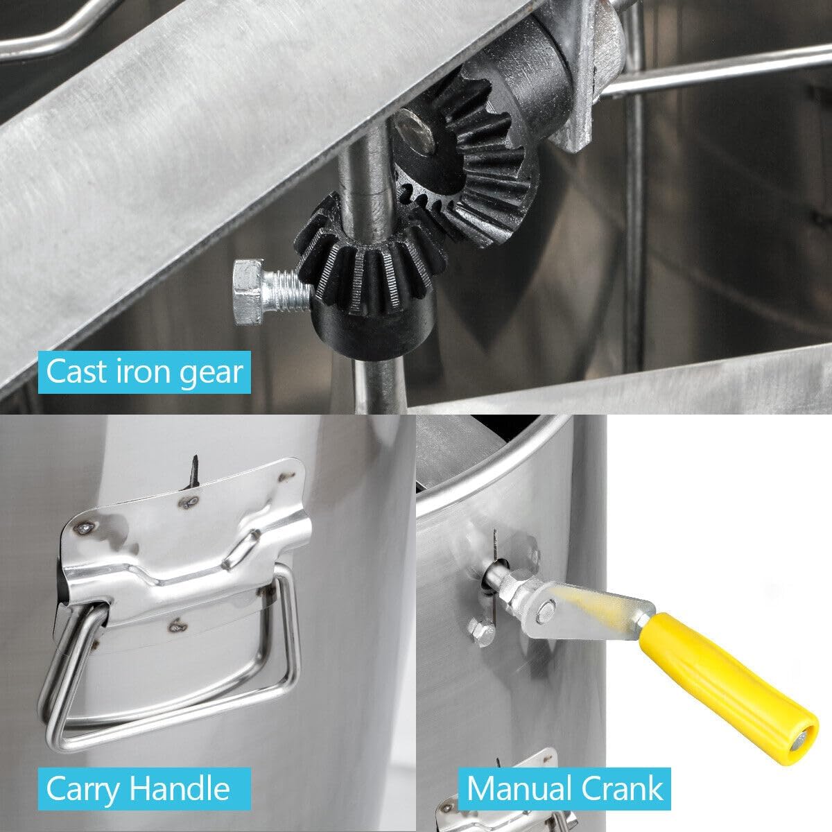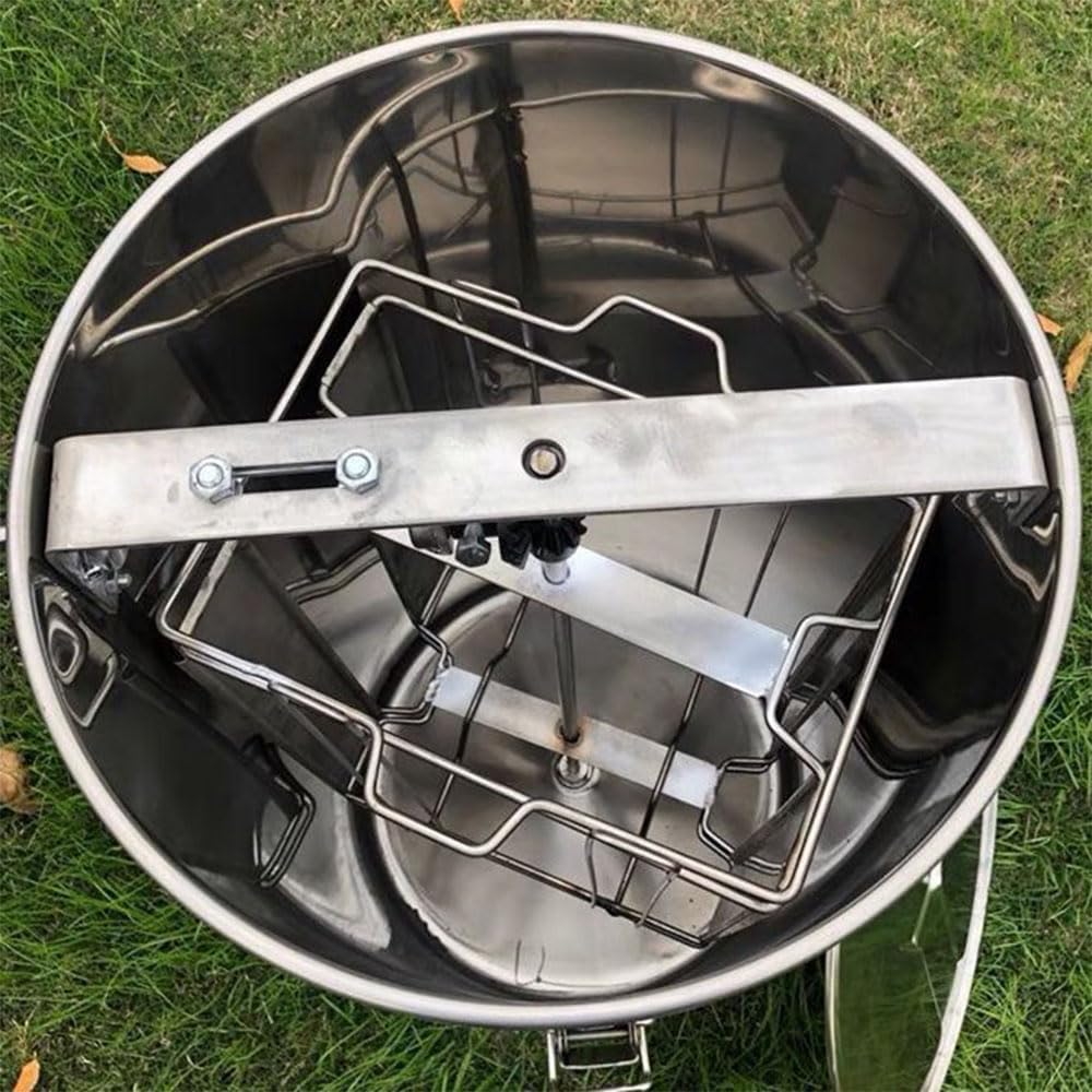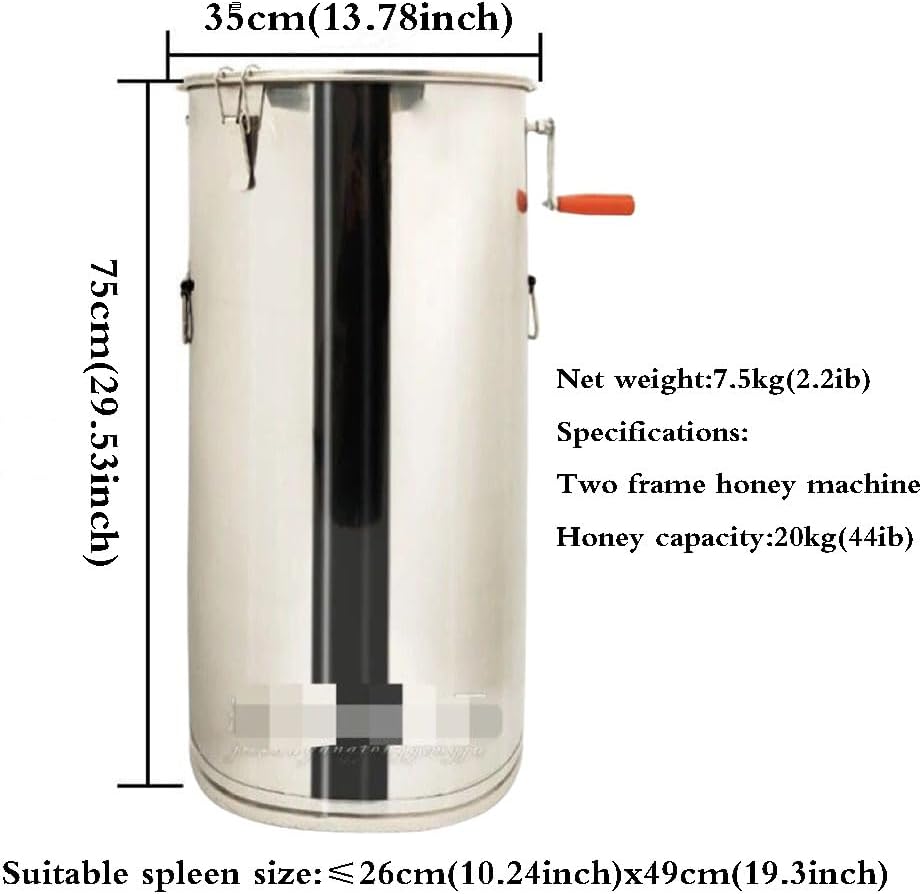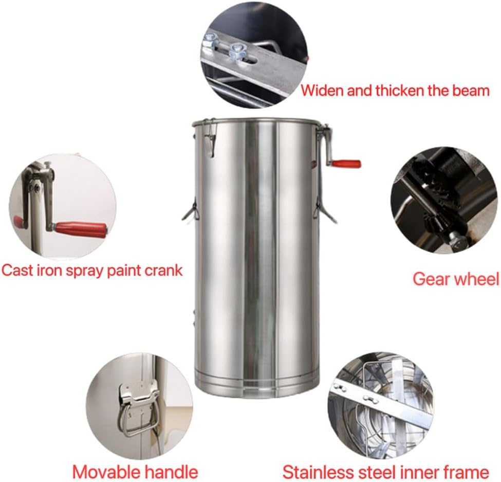 Fácil de usar: este extractor de miel viene con una garantía limitada del fabricante de 1 año, así como soporte técnico amigable para ayudar con cualquier pregunta o inquietud. El montaje es realmente fácil con sencillos pasos. Simplemente coloca el panal en los marcos y manivela el mango resistente para girar en poco tiempo. Ideal para el aficionado o pequeño apiarista., ACTUALIZACIONES: el cuerpo del extractor de miel Upgrades está hecho de acero inoxidable y enrollado con una máquina de soldadura sin costuras. Marco de acero inoxidable pulido de grado alimenticio, menos propenso a la oxidación y al desgaste., Extractor de miel manual de 2 marcos: resistente, capaz de manejar hasta 2 marcos estándar profundos, medianos o poco profundos, con cestas en el interior que pueden acomodar hasta 2 marcos a la vez. Los engranajes cerrados en el marco no contaminarán la miel., Tambor de acero inoxidable: el tambor de acero inoxidable en este extractor de miel de dos marcos mide 27.5 pulgadas de alto y 13.8 pulgadas de diámetro, perfecto para extraer mucha miel a la vez., Diseño de manivela resistente: el mango tiene una abolladura cuadrada para una fácil instalación, por lo que es fácil de girar con una manivela. La manivela de metal sólido gira ambas cestas de forma suave y eficaz.