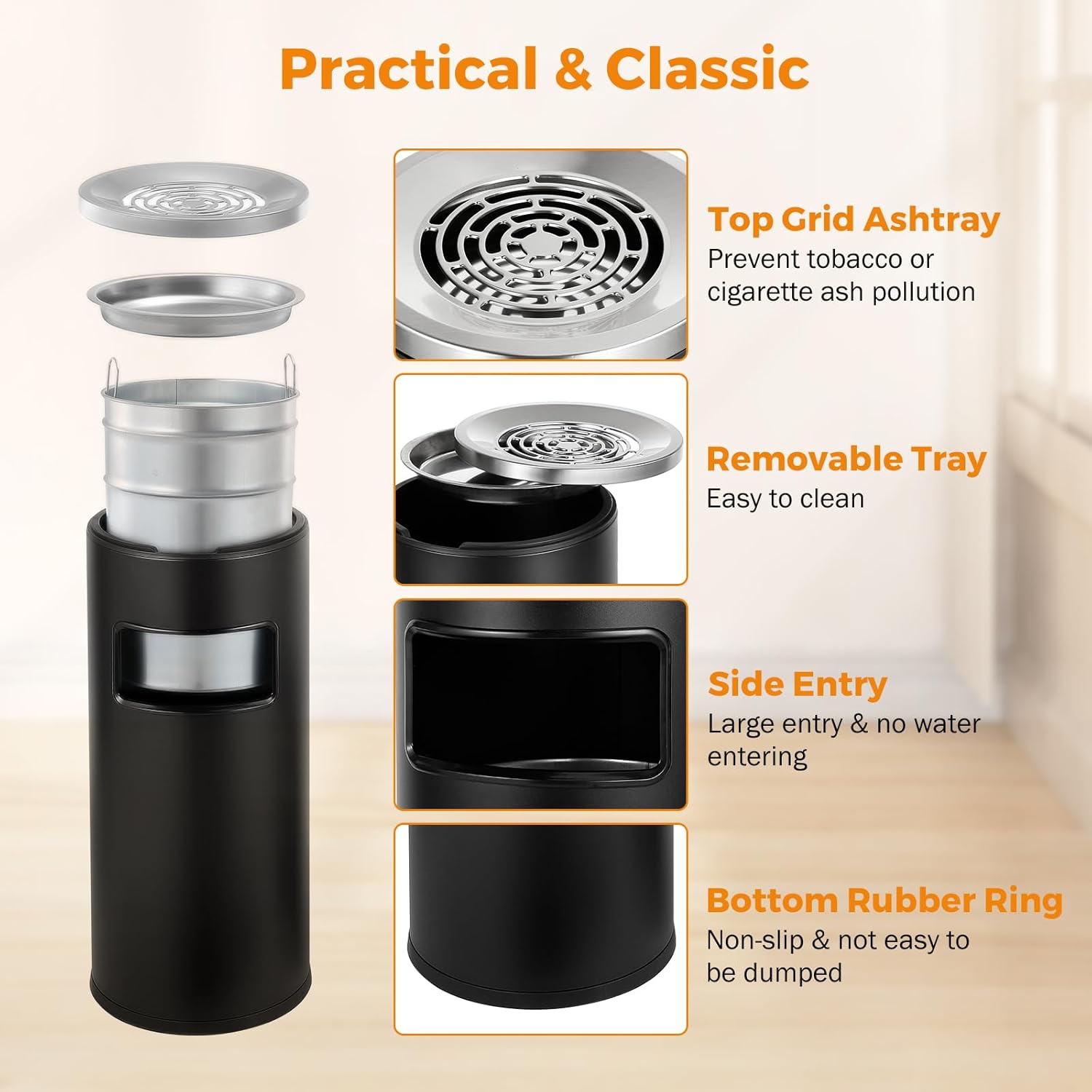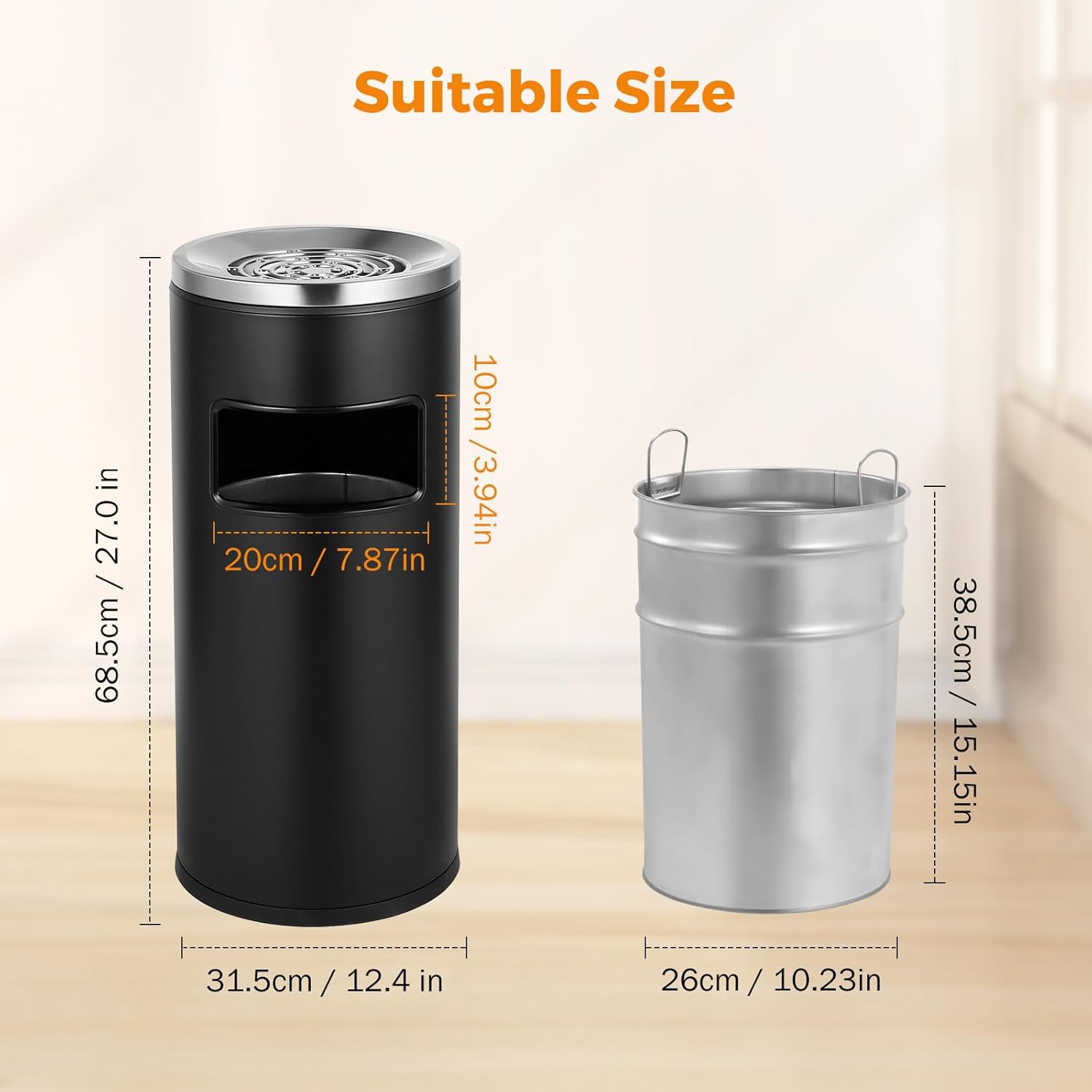 Dimensiones: 12.4 x 27 pulgadas (12.4 x 27.0 in)., Material: acero inoxidable., Diseño simple y moderno: cuerpo cilíndrico con bordes redondeados para evitar raspaduras de manos., Acero inoxidable mejorado: ¿Preocupado por la oxidación en el exterior? No te preocupes, los botes de basura BEAMNOVA para exteriores se han actualizado de metal a acero inoxidable grueso, lo que los hace más resistentes a la corrosión y adecuados para uso en interiores y exteriores. La capa superficial es de material pintado o cepillado a prueba de óxido, hermoso y duradero. Se puede colocar al aire libre sin temor al viento y al sol., Fácil de limpiar: el cubo de basura de acero inoxidable BEAMNOVA viene con un cubo galvanizado desmontable de alta calidad y una bandeja de tartán extraíble en la parte superior. Recomendado para poner arena, agua o pequeños guijarros. Fácil de limpiar, práctico y conveniente., Alta aplicación: diseñado para uso en interiores y exteriores. Se puede colocar en la cocina, sala de estar, dormitorio, patio, inodoro, etc. También se puede utilizar para fines industriales, médicos e industriales, en pasillos de hospitales, junto a ascensores de hoteles, parques al aire libre, etc.