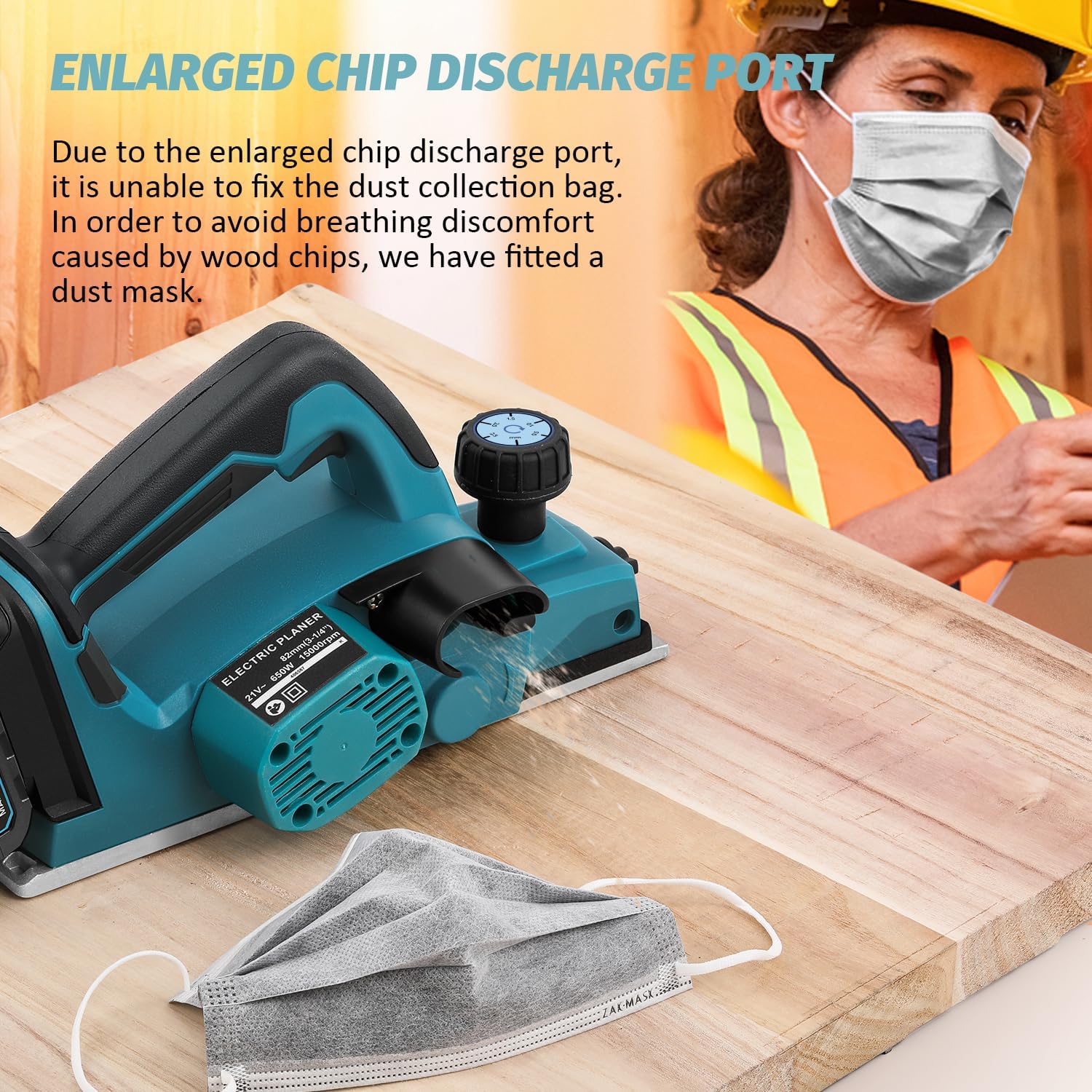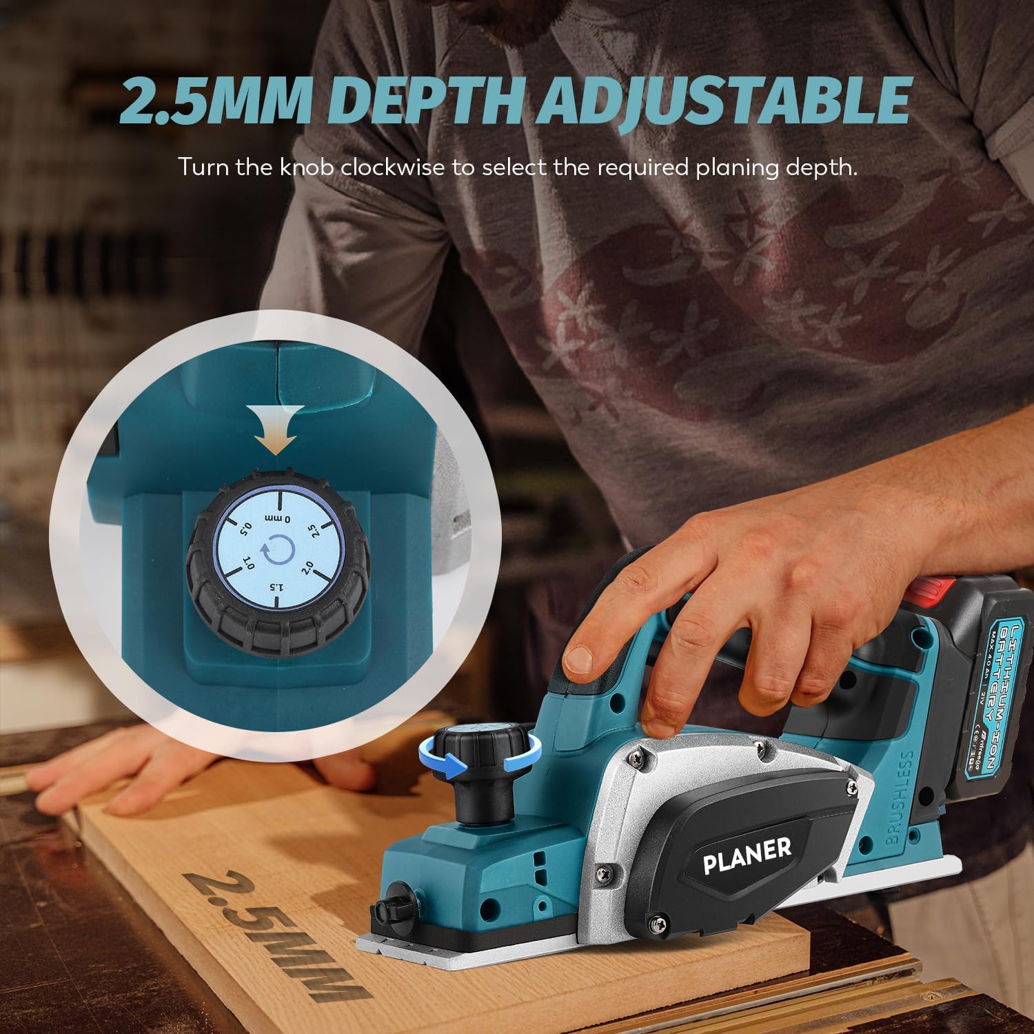 2 baterías de alta capacidad de 4.0 AH: a diferencia de otras máquinas, nuestra cepilladora eléctrica está equipada con baterías de alta capacidad de 21 V para una vida útil más larga. Para su comodidad, le daremos una batería extra como regalo. Puedes recibir dos baterías de alta capacidad de 4.0 Ah con tu paquete. Profundidad de planificación ajustable de 0.000-0.098 in. Las profundidades de cepillado precisas se pueden ajustar girando el botón giratorio en la parte delantera de la máquina. Las profundidades de cepillado de 0.098 in están disponibles para la mayoría de las aplicaciones de carpintería. Motor sin escobillas de alta calidad: nuestra cepilladora automática cuenta con un avanzado motor sin escobillas que elimina la necesidad de reemplazar los cepillos, ahorrándote un tiempo valioso y garantiza un rendimiento más rápido y confiable en el trabajo de la madera. Accesorios cuidadosos: para levantarte y trabajar nada más sacarlos de la caja, regalamos todos los accesorios que puedas necesitar, incluyendo guantes y máscaras. Queremos que tenga total seguridad en el proceso de cepillado. Servicio post-venta atento: tenemos un equipo profesional de la posventa y siempre estamos aquí para ayudarle. Si tienes alguna pregunta, no dudes en ponerte en contacto con nosotros, definitivamente seremos responsables de tu compra hasta el final