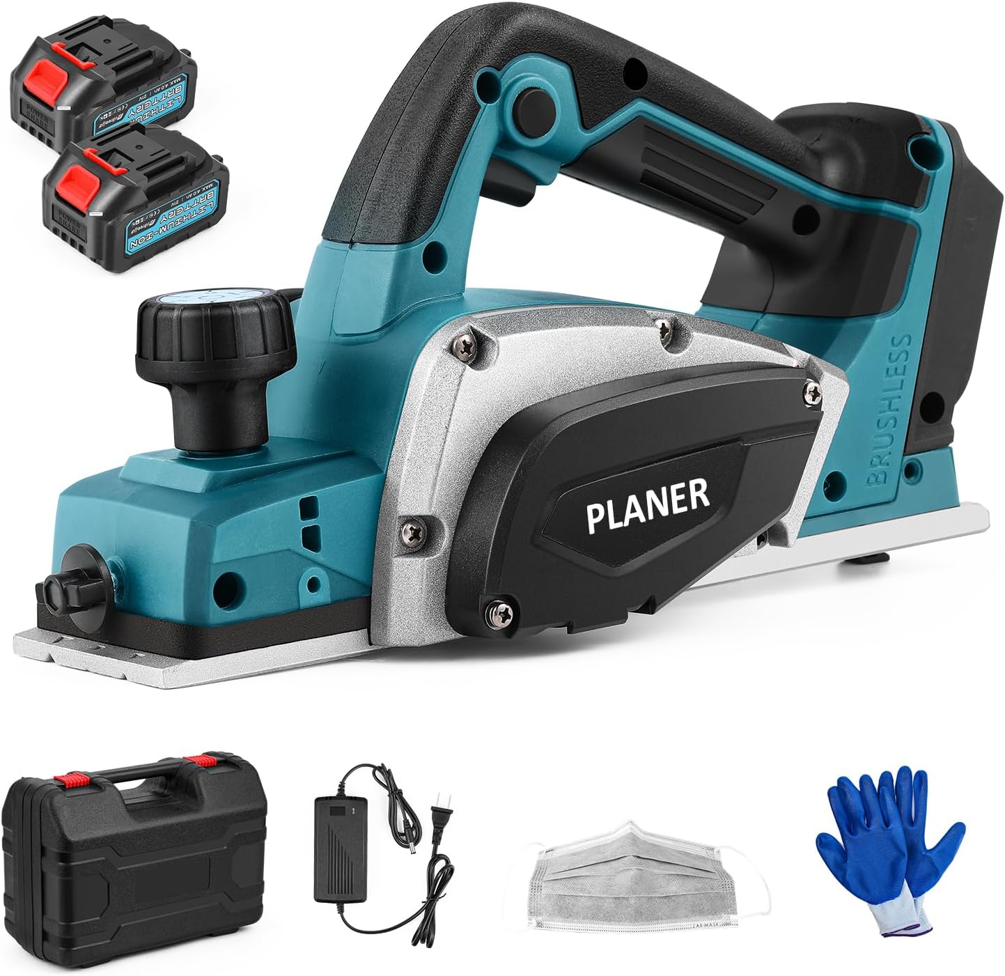 2 baterías de alta capacidad de 4.0 AH: a diferencia de otras máquinas, nuestra cepilladora eléctrica está equipada con baterías de alta capacidad de 21 V para una vida útil más larga. Para su comodidad, le daremos una batería extra como regalo. Puedes recibir dos baterías de alta capacidad de 4.0 Ah con tu paquete., Profundidad de planificación ajustable de 0.000-0.098 in. Las profundidades de cepillado precisas se pueden ajustar girando el botón giratorio en la parte delantera de la máquina. Las profundidades de cepillado de 0.098 in están disponibles para la mayoría de las aplicaciones de carpintería., Motor sin escobillas de alta calidad: nuestra cepilladora automática cuenta con un avanzado motor sin escobillas que elimina la necesidad de reemplazar los cepillos, ahorrándote un tiempo valioso y garantiza un rendimiento más rápido y confiable en el trabajo de la madera., Accesorios cuidadosos: para levantarte y trabajar nada más sacarlos de la caja, regalamos todos los accesorios que puedas necesitar, incluyendo guantes y máscaras. Queremos que tenga total seguridad en el proceso de cepillado., Servicio post-venta atento: tenemos un equipo profesional de la posventa y siempre estamos aquí para ayudarle. Si tienes alguna pregunta, no dudes en ponerte en contacto con nosotros, definitivamente seremos responsables de tu compra hasta el final