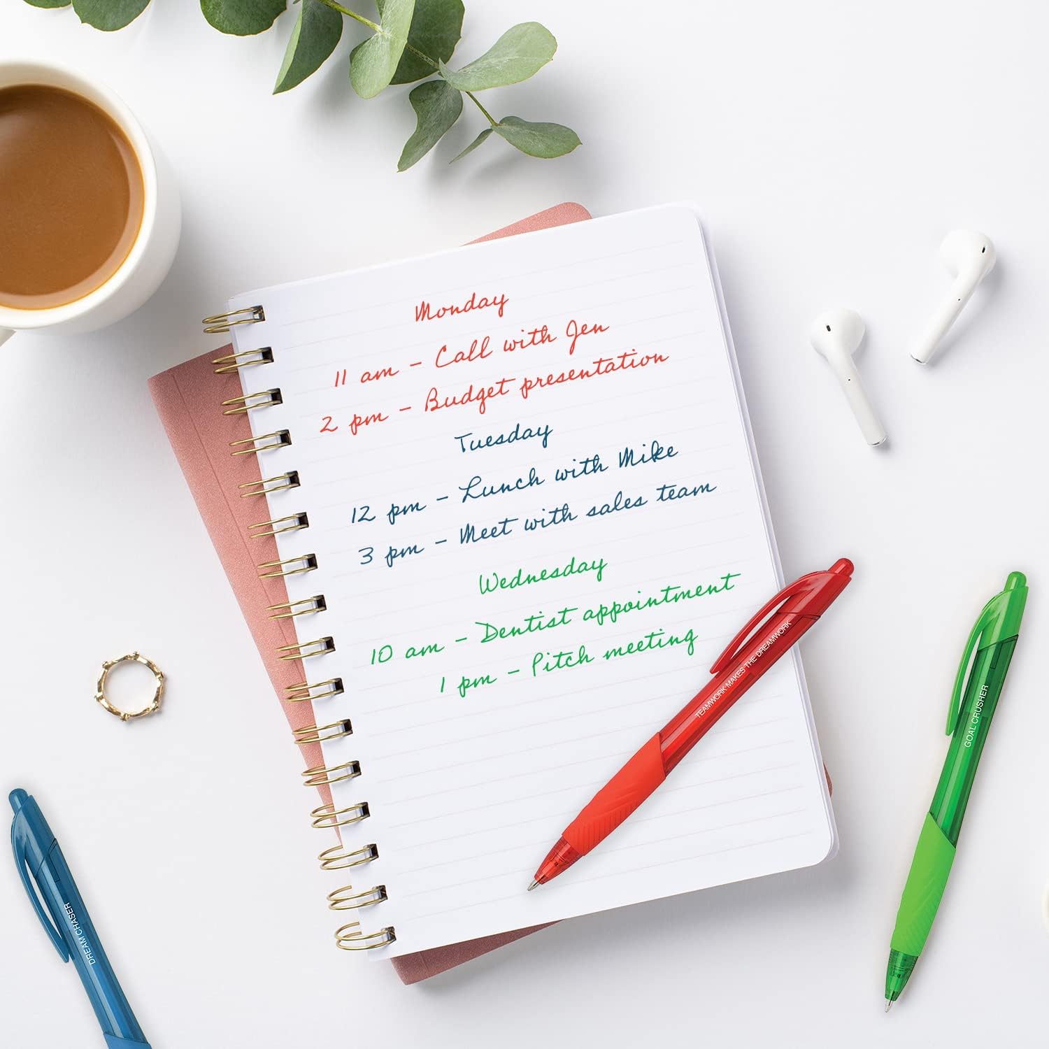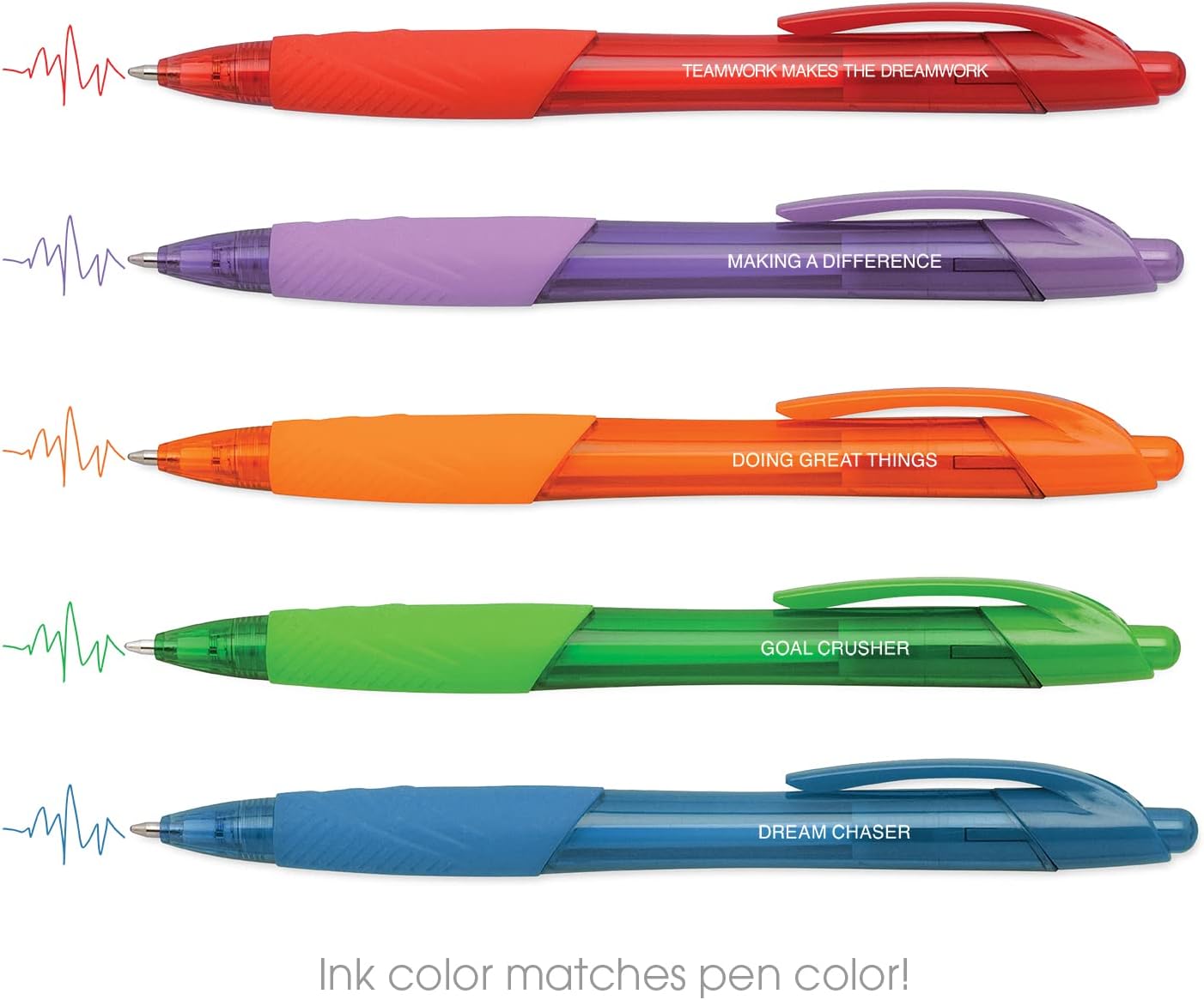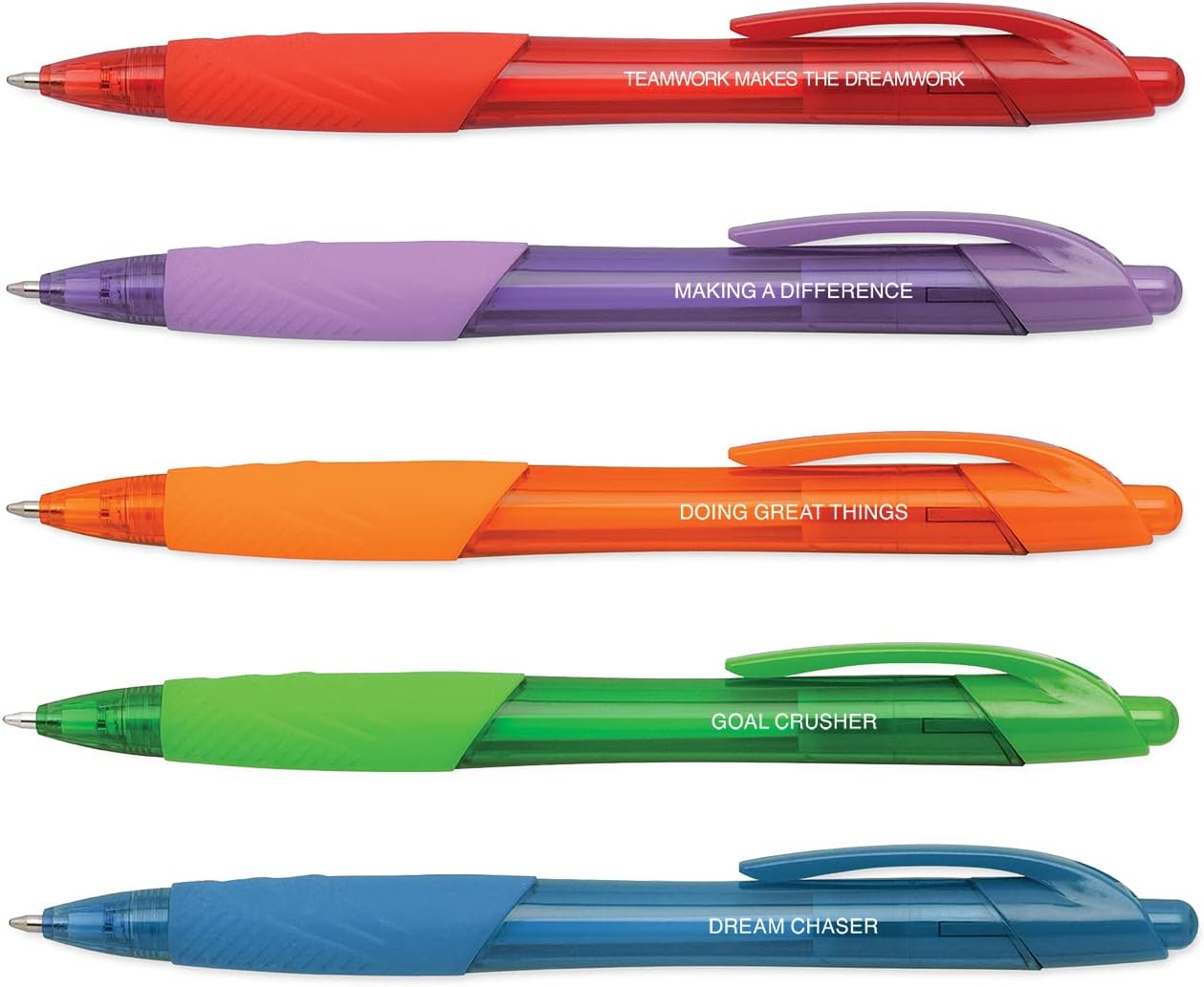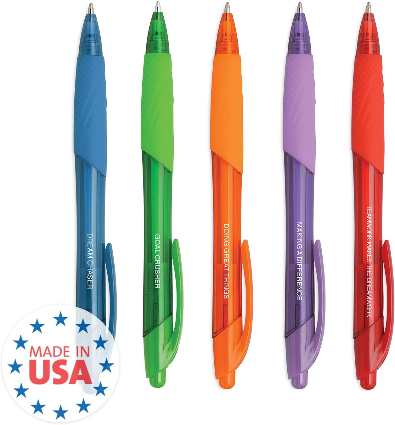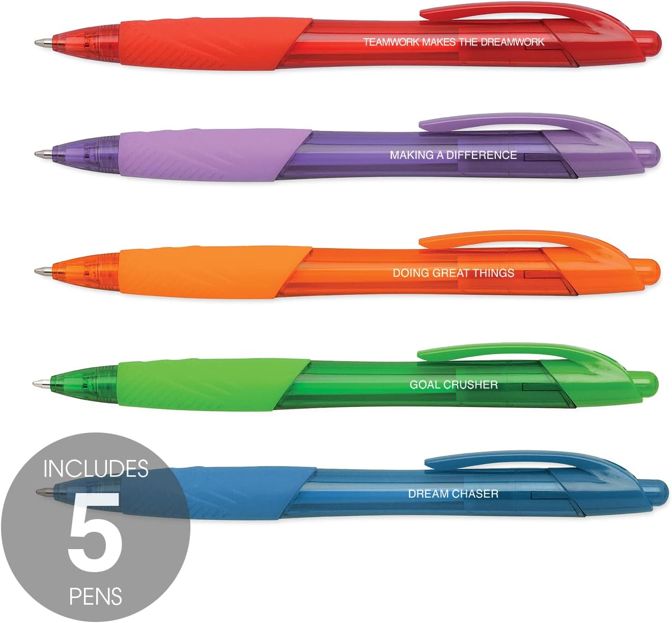 Incluye: Juego de 5 bolígrafos coloridos con diferentes frases de empoderamiento impresas en cada uno., Tamaño perfecto: el práctico tamaño de la pluma de 0.4 x 4.75 pulgadas es fácil de llevar en una mochila, bolso o bolsa para portátil., Diseño único: Los bolígrafos vibrantes están impresos en blanco con las frases alentadoras, “Trabajo en equipo hace que el sueño funcione”, “Hacer una diferencia”, “Hacer grandes cosas”, “Trituradora de gol” y “Dream Chaser”. El color de la tinta del bolígrafo coordina con el color del barril del bolígrafo., Perfecto para: Mantente motivado usando estos bolígrafos de clic surtidos en casa o en la oficina. Regalo perfecto para la apreciación de los empleados, un nuevo trabajo, el día del jefe, un cumpleaños, graduación y mucho más., Alta calidad: Impresión blanca en el juego de bolígrafos de clic de calidad.
