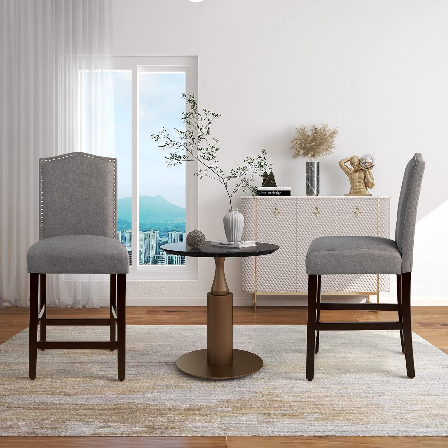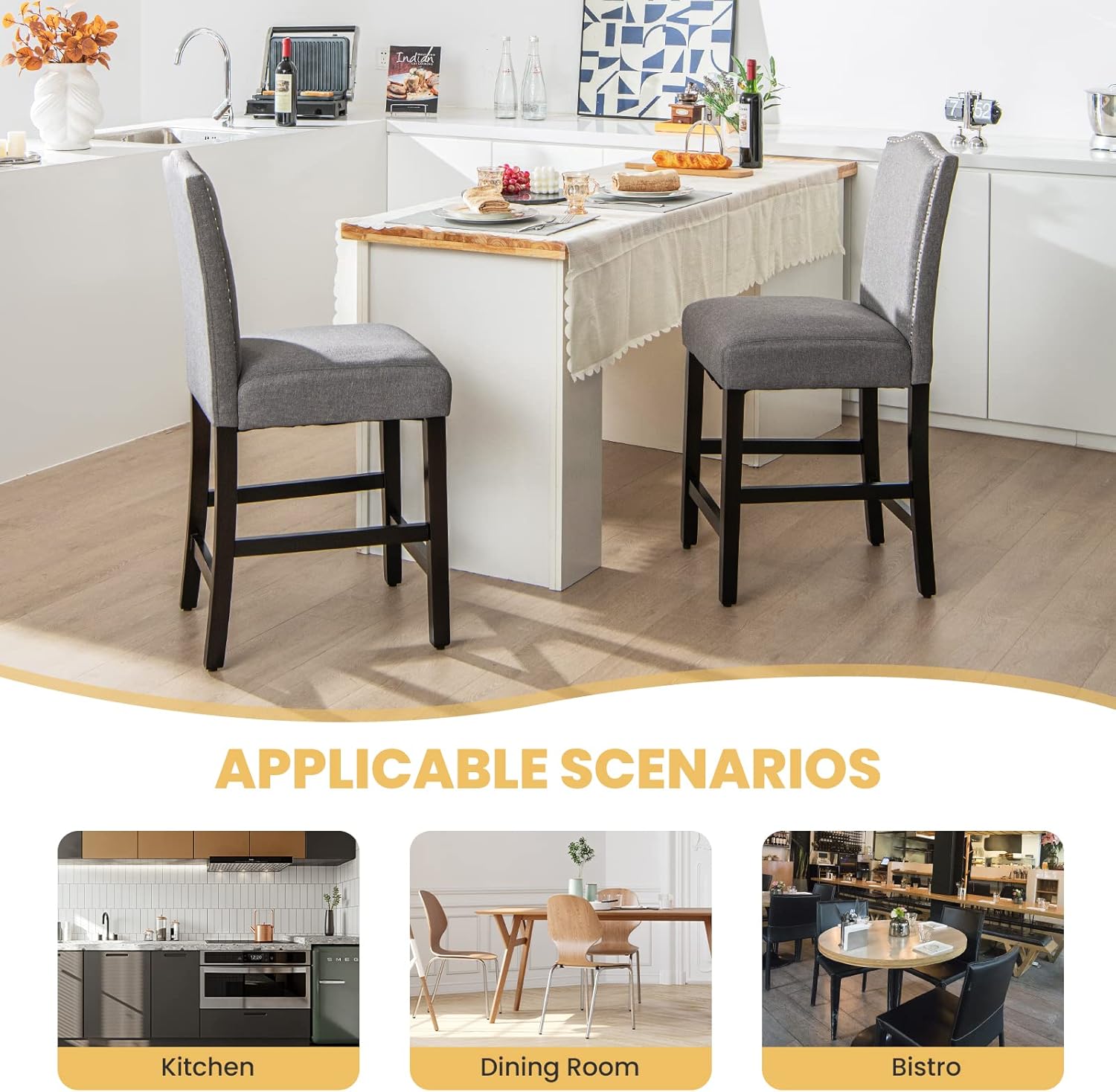Disfrute de una comodidad óptima: Las sillas de altura de mostrador están diseñadas para brindarle una comodidad óptima. Su asiento es suave, resistente y duradero. Cubierto con tela de lino transpirable y acolchado con esponja de alta densidad, las sillas pueden ayudar a aliviar la presión y prolongar el tiempo de comodidad. Además, los resortes serpentinos incorporados pueden absorber golpes y ofrecer una larga vida útil., Diseño ergonómico: En comparación con otros taburetes de bar, esta silla de bar es definitivamente una mejor opción para aquellos que tienen dolores de espalda. El respaldo ergonómico puede adaptarse a la curva de tu columna vertebral y darte un apoyo cómodo, mientras que el cómodo reposapiés te permite descansar en una postura más relajada., Patas de madera de goma y estabilidad mejorada: las patas de la silla de bar de la isla de cocina están hechas de madera de caucho maciza, que es superior a los materiales artificiales de baja calidad. Y la estructura reforzada con 4 barras transversales y almohadillas ajustables para los pies garantiza una mejor estabilidad y una gran capacidad de peso de 330 libras., Múltiples escenarios aplicables: la silla de bar tapizada no solo te da una experiencia cómoda, sino que también cuenta con un aspecto elegante para combinar con las decoraciones de la cocina, el comedor y el bistró. Mientras tanto, el diseño remachado puede resaltar el estilo y traer un atractivo clásico., Dimensiones y montaje de la silla: para su referencia, las dimensiones totales de la silla son 17.5 “x 21″ x 41 ” (L x W x H), y las dimensiones del asiento son 17.5″ x 16.5″ x 25″, que coincide con mostradores de 35 a 39 pulgadas. Además, el montaje de las sillas de bar es muy fácil. Sigue las instrucciones detalladas paso a paso, ¡puedes terminarlo rápidamente!