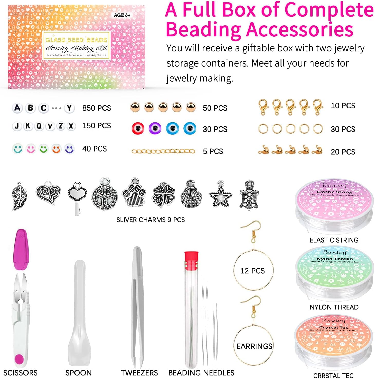 Colores vibrantes: nuestro juego incluye 5500 cuentas de semillas de 0.157 in en 28 colores impresionantes, 1000 cuentas de letras, 80 cuentas de corazón, 30 cuentas de mal de ojos, 40 cuentas de cara sonriente, 65.6 ft de cuerda elástica de 0.024 in, tijeras, pinzas para que puedas crear hermosas y coloridas piezas de joyería., Amplia variedad: con 1000 cuentas de letras, puedes personalizar tus creaciones de joyería y añadir un toque único a tus diseños., Alta calidad: Cuentas de letra: 4 × 0.276 in; Cuentas de semillas de vidrio pequeñas: 0.157 in; tamaño del cordón elástico: 0.024 in. Nuestras cuentas de semillas están hechas de materiales de alta calidad, lo que garantiza que sean duraderas y duraderas., Almacenamiento conveniente: las cuentas vienen en una caja de almacenamiento de plástico transparente con compartimentos individuales, por lo que es fácil mantener tus cuentas organizadas y accesibles., Perfecto para bricolaje: estas hermosas cuentas se pueden utilizar para hacer pulseras, collares, anillos, cadenas de cintura y llaveros con nombre. Este juego es ideal para la fabricación de joyas, manualidades y otros proyectos creativos., Posibilidades infinitas: Con tantas cuentas para elegir, las posibilidades son infinitas. Deja volar tu creatividad y diseña piezas de joyería únicas y personalizadas.