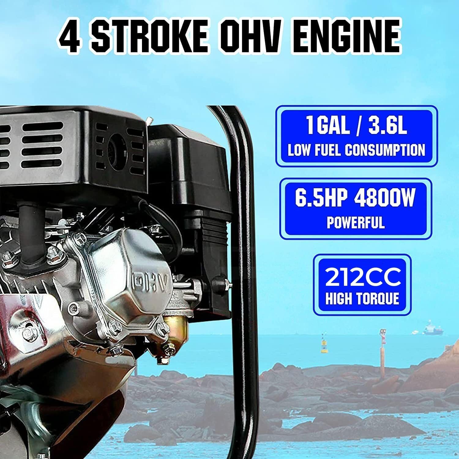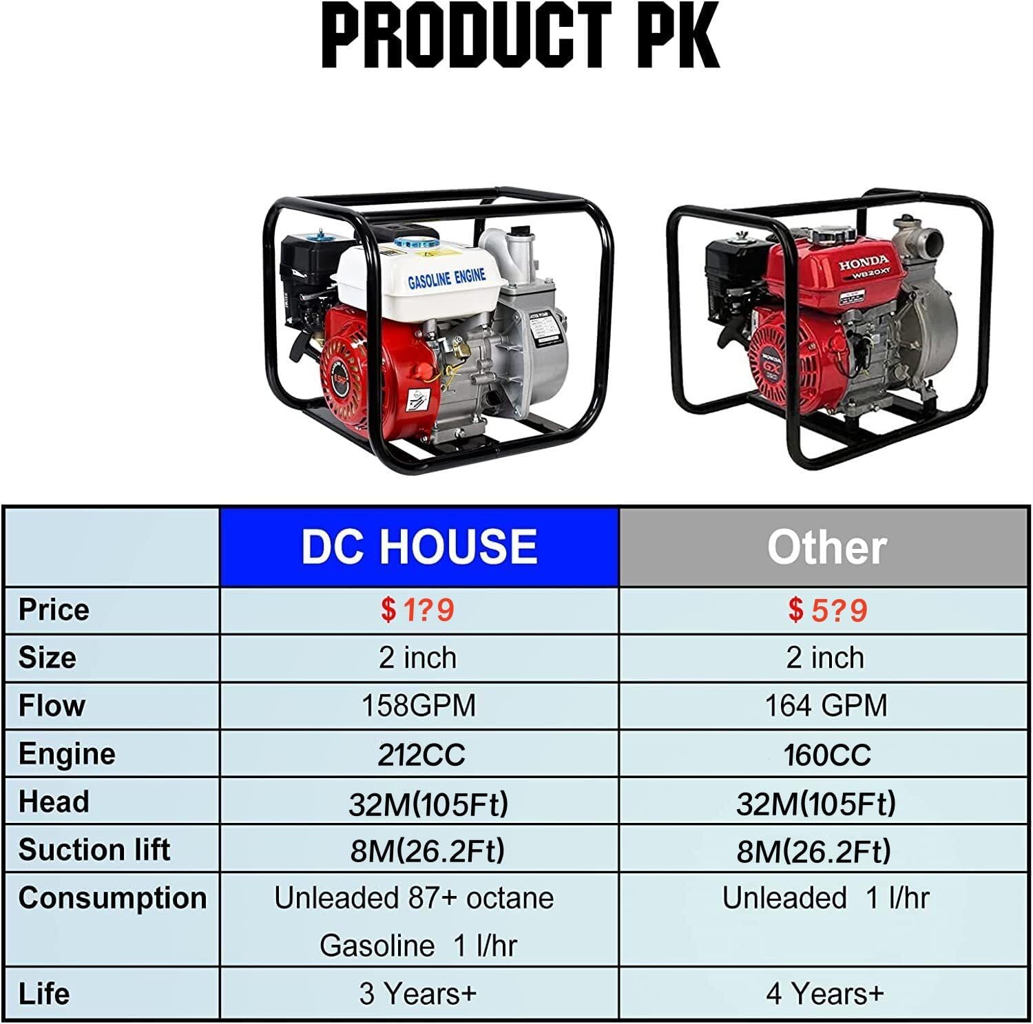 DC HOUSE Bomba de agua semi-basura de 2 pulgadas y 6.5 HP de 4 tiempos, 212cc 4 ciclos 158GPM alto caudal de succión de 26.2 pies de elevación de