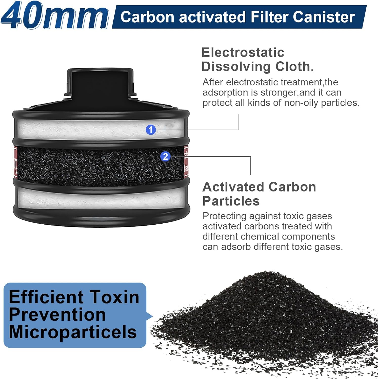 Filtros de máscara de gas de 1.575 pulgadas, repuesto de cartuchos de carbón activado, recipiente de filtro de respirador de aire de 1.575 pulgadas