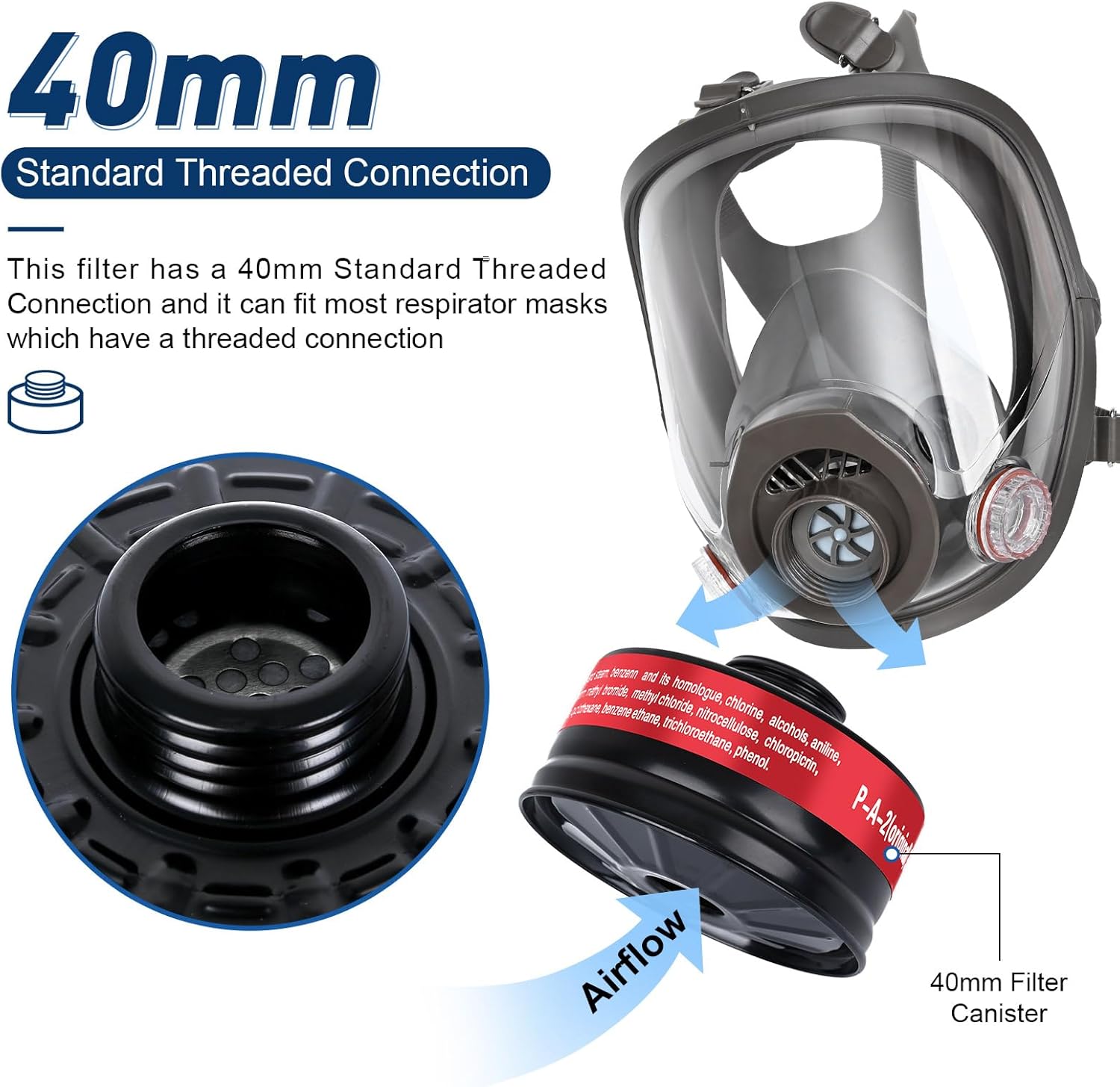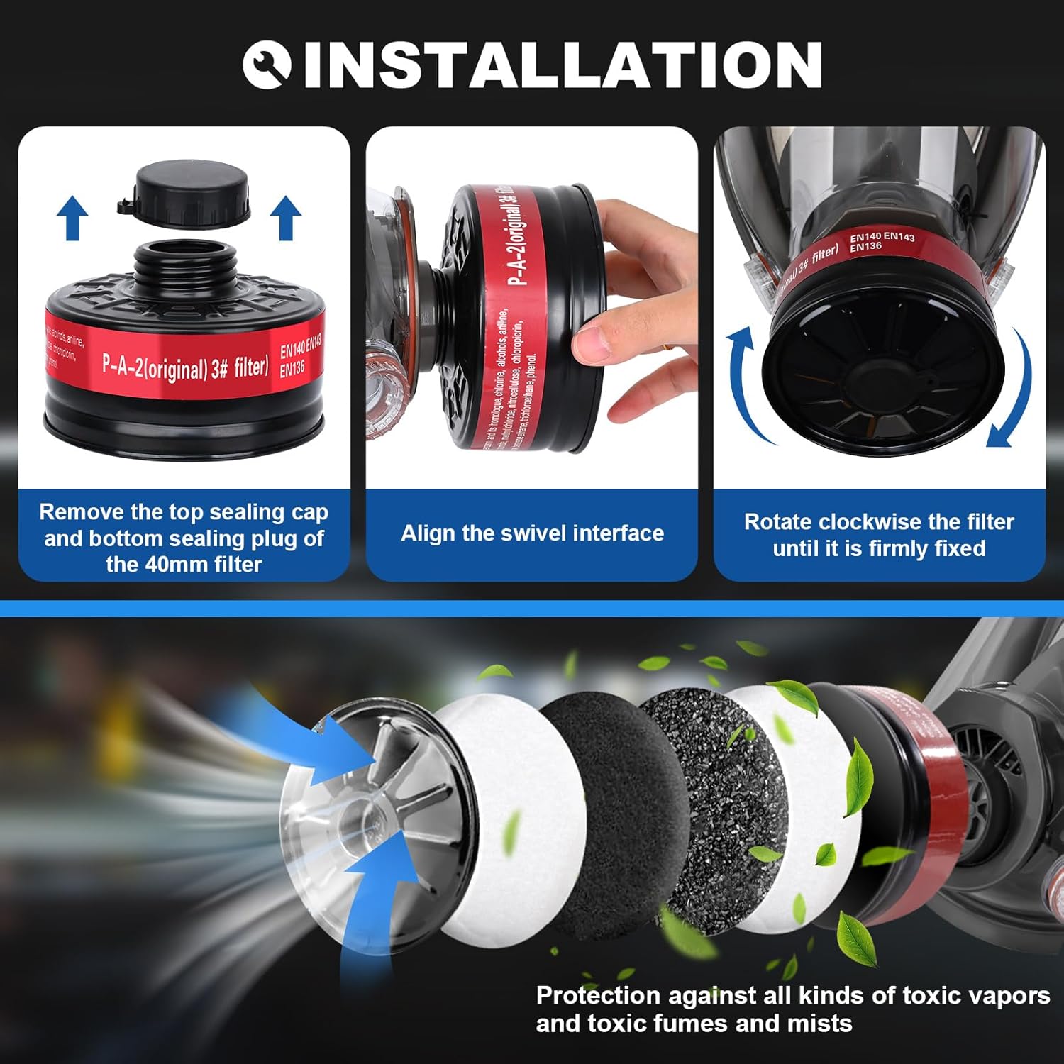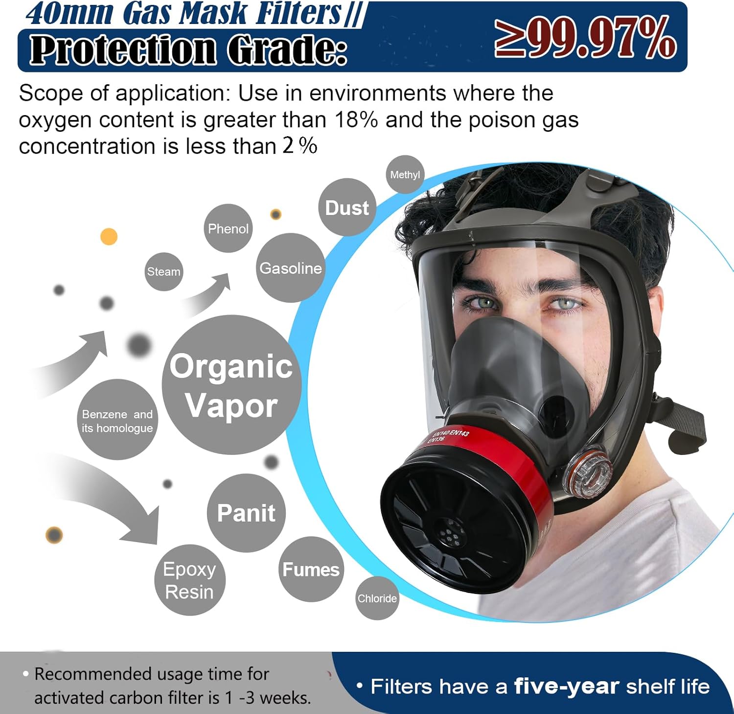 Gran capacidad: nuestros filtros de máscara de gas de 1.575 pulgadas están equipados con gran parte de partículas de carbón activado y tela de disolución electrostática multicapa, no solo pueden proteger contra gases tóxicos, sino que también protegen varias partículas no aceitosas porque el paño de disolución está tratado electrostáticamente y la absorción es más fuerte., Máxima protección: el cartucho de filtro de respiración de carbón activado de 1.57 pulgadas puede eliminar el 99.97% de las partículas o el vapor nocivo en el aire, como benceno y sus homólogos, cloro, alcoholes, gasolina, acetona, disulfuro de carbono, fenol, etc. La carcasa hecha de metal es más segura, el contenido de carbón activado es más estable. El diseño probado proporciona una protección integral contra una amplia gama de amenazas NBC, humos y partículas., 【Universalidad】Tamaño estándar de la OTAN. El recipiente de filtro respirador está diseñado con rosca de 1.575 in, y la interfaz del filtro es una interfaz roscada de 1.575 in de acuerdo con las normas internacionales, que se puede conectar con varias máscaras de gas de cara completa. Nota: el filtro no se puede utilizar solo, debe usarse con la máscara de gas., Amplia gama de aplicaciones: nuestros filtros de máscara de gas se utilizan en varios lugares que ponen en peligro el sistema respiratorio. Adecuado para pintura, protección de pulido, resina epoxi, soldadura, laboratorio químico, carpintería, industria, supervivencia, etc., Servicio de satisfacción al 100%: nuestro filtro de partículas de gas de 1.575 pulgadas está empaquetado individualmente con una vida útil eficaz de hasta 5 años, que se puede utilizar eficazmente durante mucho tiempo para proteger la salud de tu o la de tu familia. (Fabricado en 2023) Si necesita algún soporte, por favor contáctenos en cualquier momento.