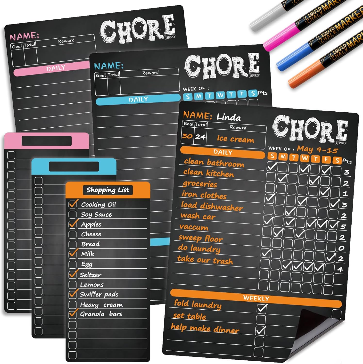 Eficaz juego combinado: la tabla magnética de tareas tiene una gran caja de fecha para que puedas planificar tareas diarias y semanales con marcadores de tiza líquida brillante de neón. Tiene la flexibilidad de programar tareas y hacer un seguimiento de su rutina diaria. Dos pizarras de bloc de notas son ideales para menú, lista de compras y lista de tareas., Todo lo que necesitas: tres tablas de tareas (8.5 x 12 pulgadas) y tres pizarras forradas (8.5 x 4 pulgadas), todas con fuerte respaldo magnético. El conjunto combinado se adapta a la mayoría de refrigeradores., Personaliza como quieras: anota tus propias tareas y recompensas para adaptarse a tus necesidades. El diseño reutilizable hace que sea mucho más fácil realizar un seguimiento del comportamiento de los niños de un vistazo. Establezca recompensas para los niños como incentivos visuales para motivarlos a hacer sus tareas. Es adecuado para niños pequeños, niños y adolescentes., 100% borrable: al utilizar una película de borrado de alta calidad, tus escritos son muy fáciles de limpiar incluso después de dejarlos durante mucho tiempo. ¡Es reutilizable!, Regalo y bonificación: 4 marcadores de tiza líquida neón están incluidos
