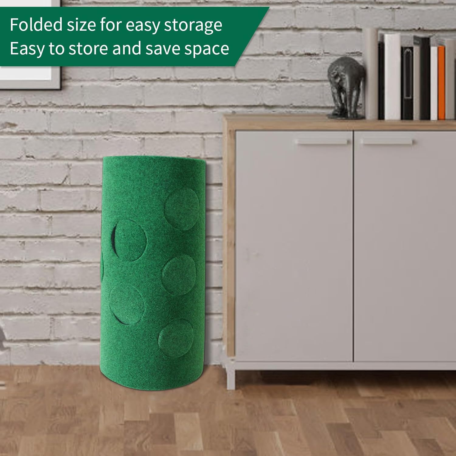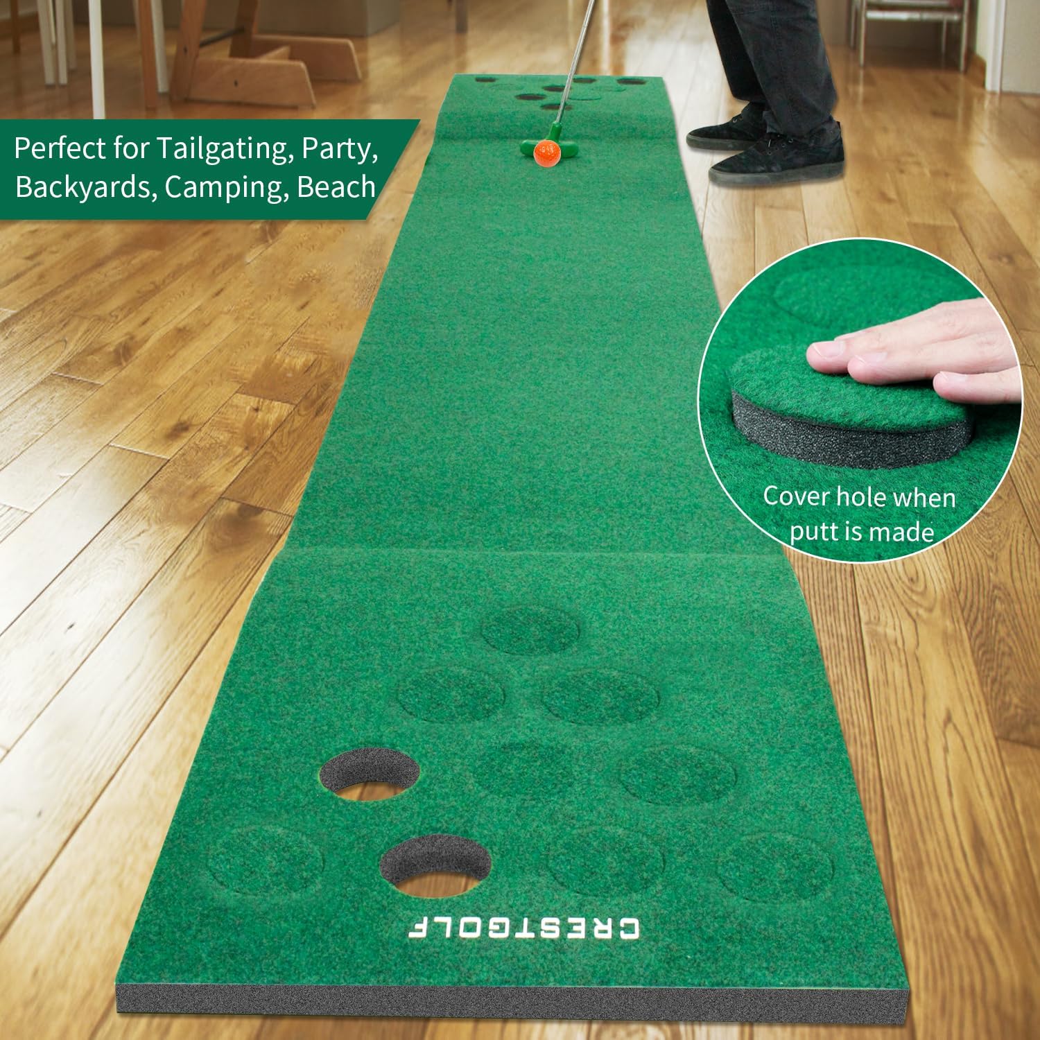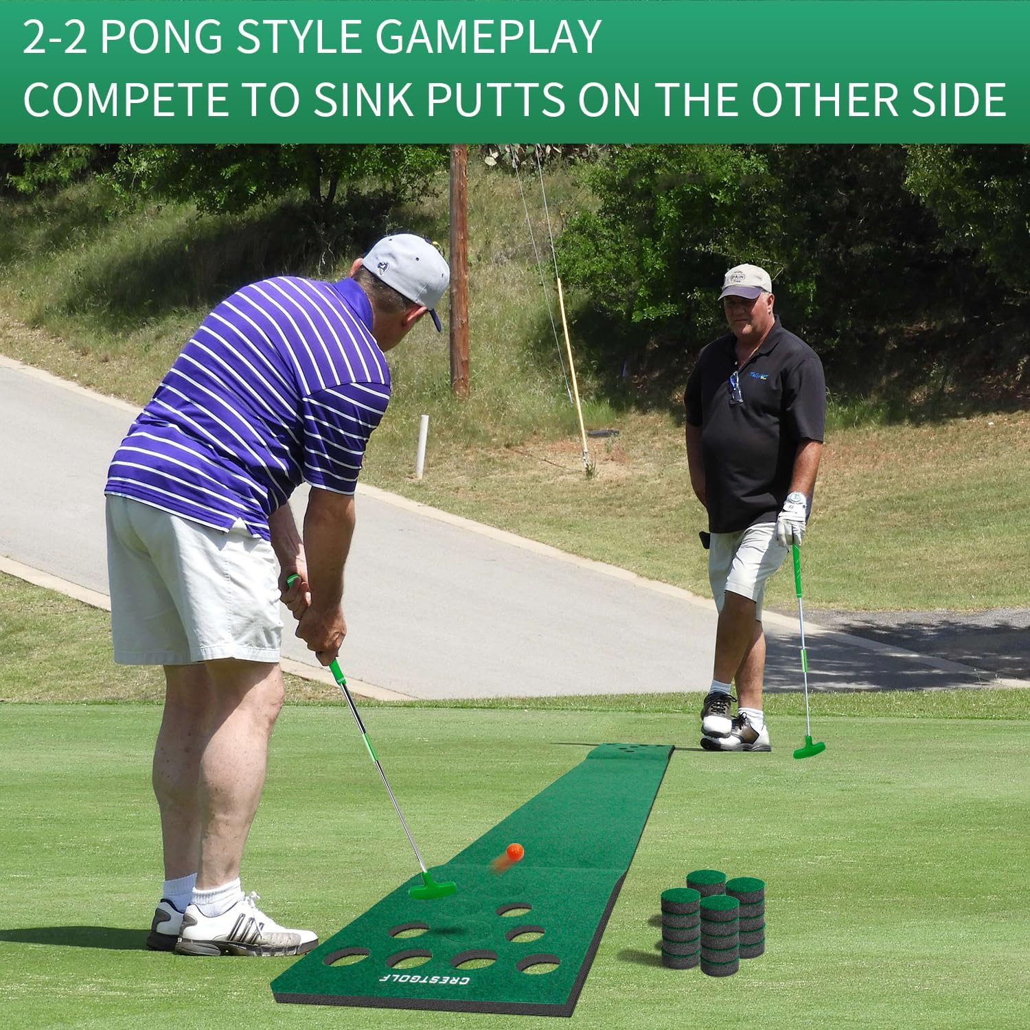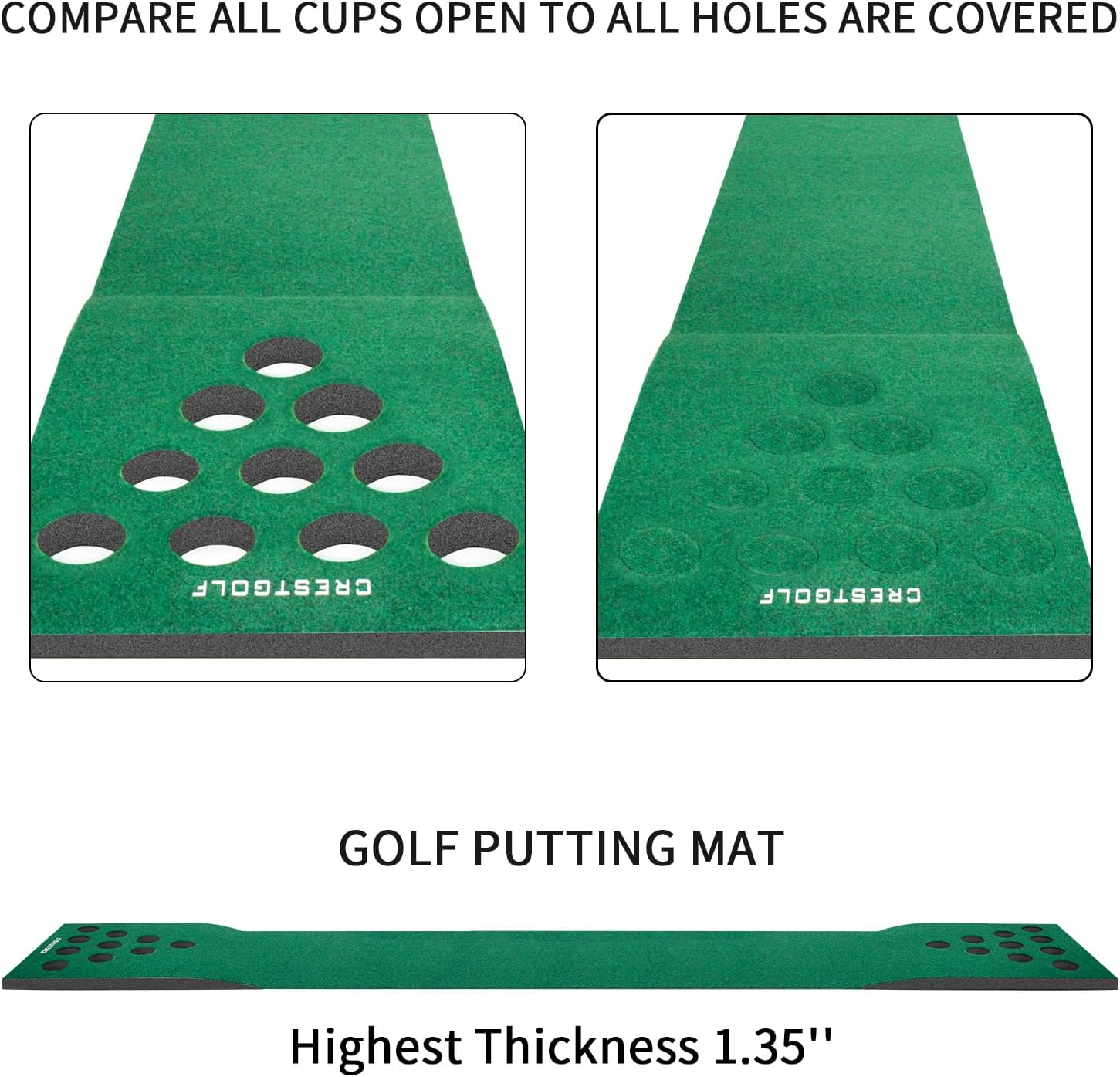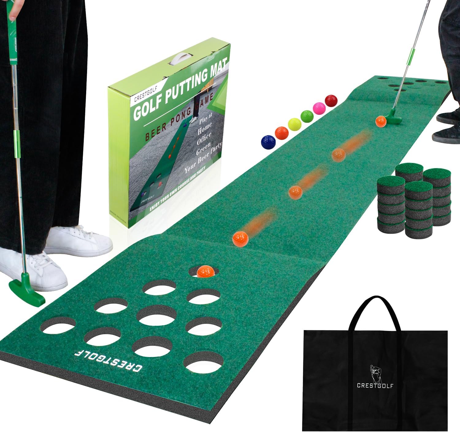 Divertidos juegos de golf en el patio trasero: el juego de ping pong de golf de 20 hoyos es único para combinar golf y socializar con amigos y familiares. Este juego de putter pong cuenta con una combinación de putting green y beer pong. Las reglas ajustables del juego de golf de putter ball permiten a jugadores de todos los niveles participar. Un juego de golf perfecto para principiantes o maestros por igual. En general, el juego de ping pong de golf de 20 hoyos es una gran manera de animar cualquier reunión y crear recuerdos duraderos con amigos y familiares., Lleva Putting Green a cualquier lugar: se instala en segundos. Esta alfombrilla de práctica de golf es definitivamente fácil de plegar, que se puede utilizar para poner verde en cualquier lugar. Por ejemplo, patio trasero, césped, club de golf, oficina. El tapete de práctica está hecho de espuma de alta densidad de alta calidad, la superficie está hecha de terciopelo, el suelo siempre está limpio. Es extremadamente duradero y ligero., El juego de golf incluye: el paquete incluye todo lo que necesitas para comenzar, incluyendo una alfombra de golf de 129 pulgadas, dos putters de golf de 30 pulgadas para jugadores diestros o zurdos, 20 cubiertas de hoyos de golf, 10 pelotas de golf, una caja de paquete y una bolsa de almacenamiento negra. Esta bolsa está incluida para que puedas almacenar y transportar fácilmente el putting green y todos los accesorios., Gran regalo de golf para todos: también es un gran regalo de golf para cualquier persona que busque un juego divertido e interactivo para disfrutar con familiares y amigos. Si eres un golfista experimentado o un principiante completo, puedes disfrutar jugando a este juego y tratando de hundir los primeros 10 putters para ser el ganador., Garantía de satisfacción del 100%: si hay algún problema con la alfombrilla verde de golf o cualquiera de los otros componentes del paquete, MYKUJA tomará medidas para resolver el problema y hacer las cosas bien. Con el putting green, los putters, las cubiertas de agujeros y las pelotas incluidas, tendrás todo lo necesario para configurar un campo de mini golf y comenzar a jugar de inmediato con amigos y familiares.