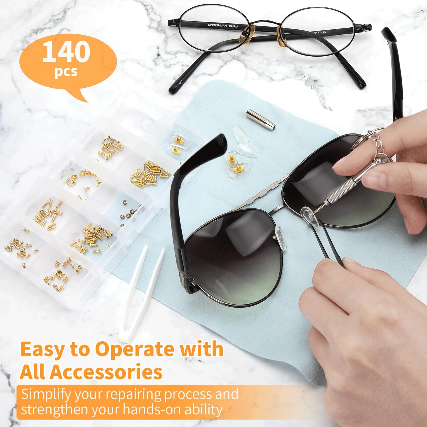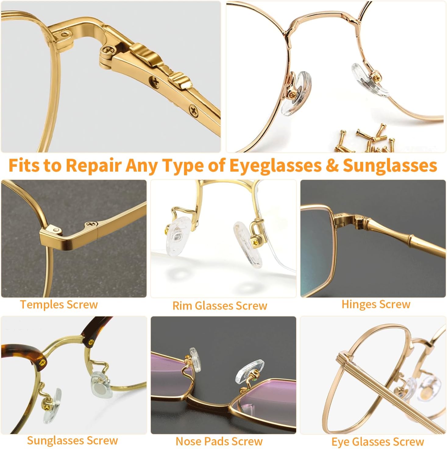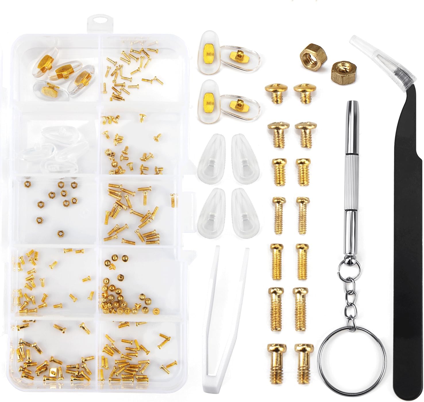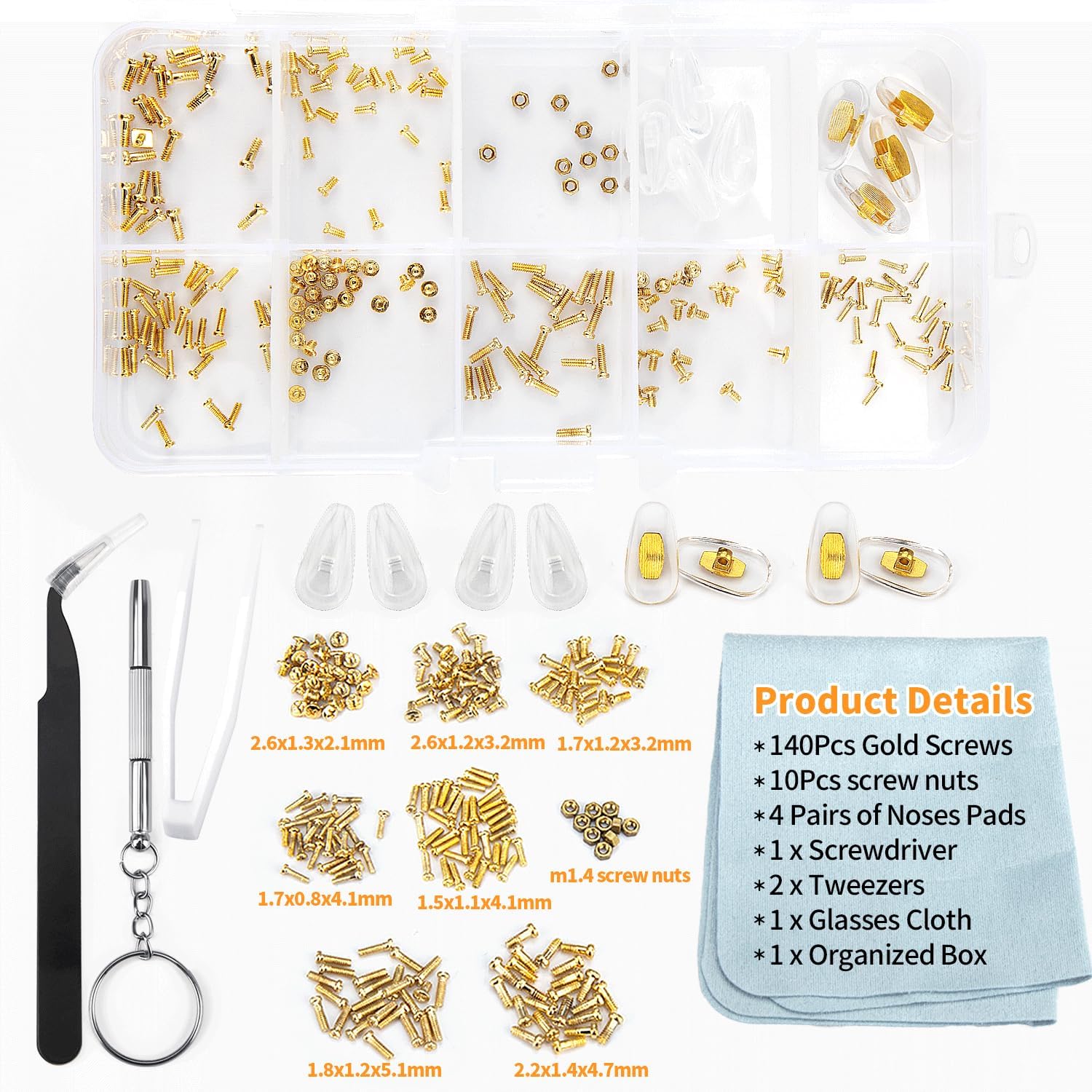 METAL, Paquete de kit de reparación de lentes incluido: el kit de reparación de gafas contiene 140 tornillos dorados para gafas con bolsas organizadoras de plástico, 9 tuercas, 2 pinzas, 4 pares de almohadillas nasales para gafas, 1 juego de destornilladores de precisión para gafas, 1 paño para gafas, 1 caja de almacenamiento, cumpliendo con todos los requisitos de reparación de tus lentes. Viene con 7 tamaños diferentes de pequeños tornillos para anteojos dentro de 0.03 ~ 0.2 pulgadas. Experimentarás un tipo diferente de diversión en la reparación de tus lentes con nuestro kit de reparación de anteojos con tornillo dorado., Kit de reparación de cristales de ojos de alta calidad con tornillos: a diferencia de otros tornillos tradicionales de lentes baratos, todos nuestros tornillos para gafas están hechos de metal de color dorado resistente al óxido, que es duradero y no se oxida fácilmente, muy adecuado para reparación de lentes de sol, lentes y relojes. Cada tamaño de los tornillos para anteojos está empaquetado individualmente en una bolsa para evitar el desorden de tornillos. Hay unas pinzas inclinadas para recoger pequeños tornillos y ponerlos en un agujero roscado, haciendo que tu ocular esté limpio y ordenado., Almohadillas de silicona para la nariz: con el material de silicona extra suave de las almohadillas nasales, es agradable al tacto y transpirable, lo que te proporciona comodidad al usar anteojos, reduciendo el dolor o las molestias. Las almohadillas comunes para la nariz son adecuadas para la mayoría de los anteojos, puedes montarlas y quitarlas tú mismo fácilmente. Tenemos 2 pares de color dorado y 2 pares de color transparente para que puedas reemplazar libremente., Juego de destornilladores 4 en 1 para reparación de lentes de sol: el juego de destornilladores tiene un diseño especial 4 en 1 que incluye el destornillador de cabeza plana, destornillador de cabeza Phillips, destornillador torx y destornillador hexagonal. La superficie del kit de herramientas de reparación de destornilladores está adaptada por material de acero inoxidable duradero, fácil y bastante cómodo de agarrar en la mano y conveniente de usar para diferentes tipos de reparaciones., Presta atención: 1. Hay 7 estilos diferentes de tornillos para gafas, cualquier detalle consulta nuestra imagen del producto. 2. Comprueba cuidadosamente si todos los accesorios se ajustan a tus lentes antes de comprar. 3. El tamaño del tornillo tiene una desviación de 0.001 a 0.005 pulgadas en la medición manual, consúltanos antes de realizar un pedido., Marca para ti: tu satisfacción es la fuerza impulsora de nuestro crecimiento. Prometemos que el kit de reparación de lentes de sol ofone con tornillos proporciona una garantía de 30 días sin preocupaciones y un servicio amigable de 7 x 24. Si tiene alguna duda, póngase en contacto con nuestro equipo de servicio lo antes posible. ¡Gracias por su apoyo!