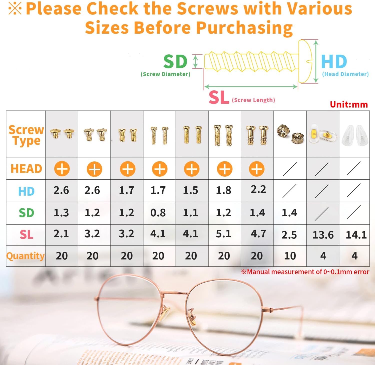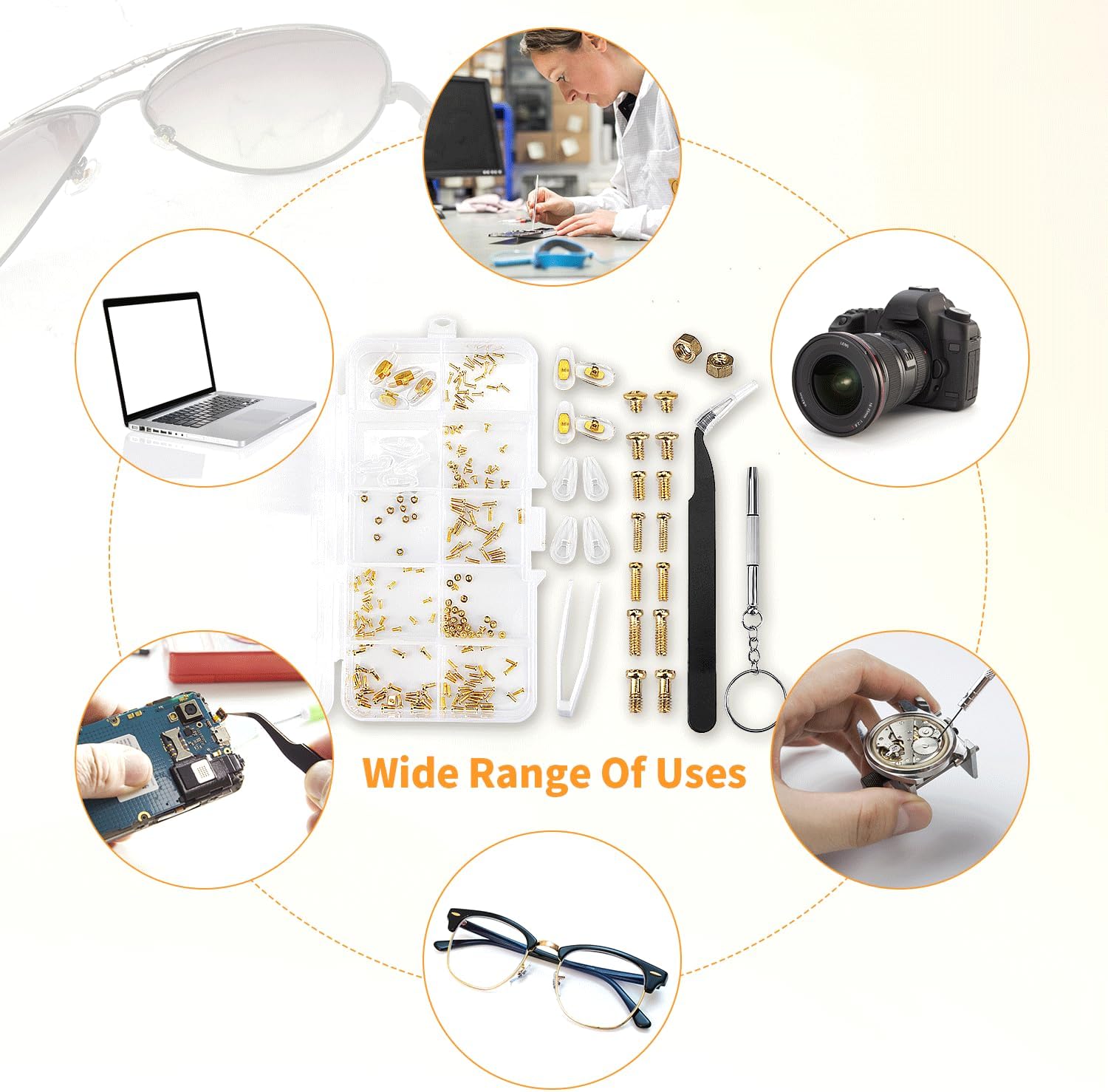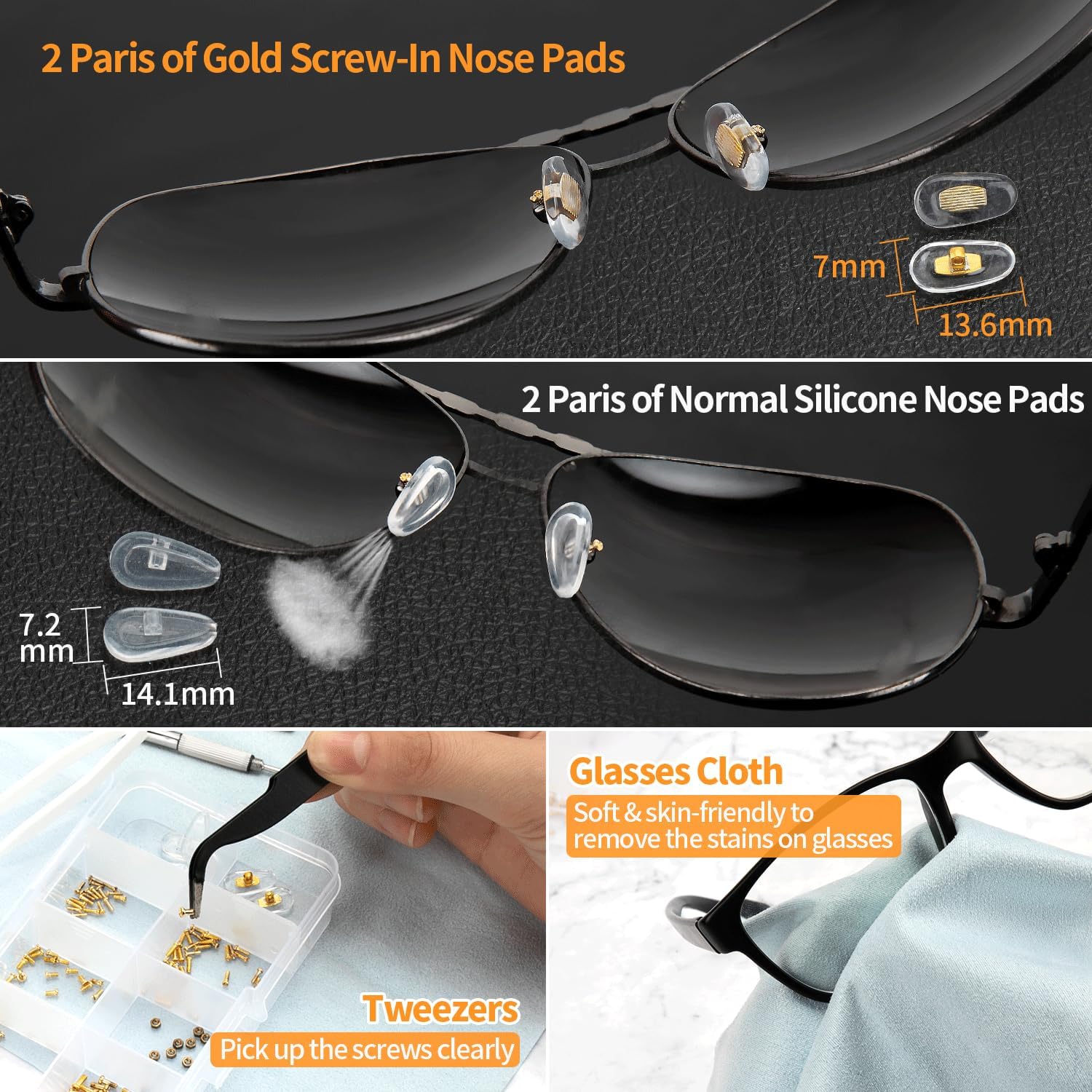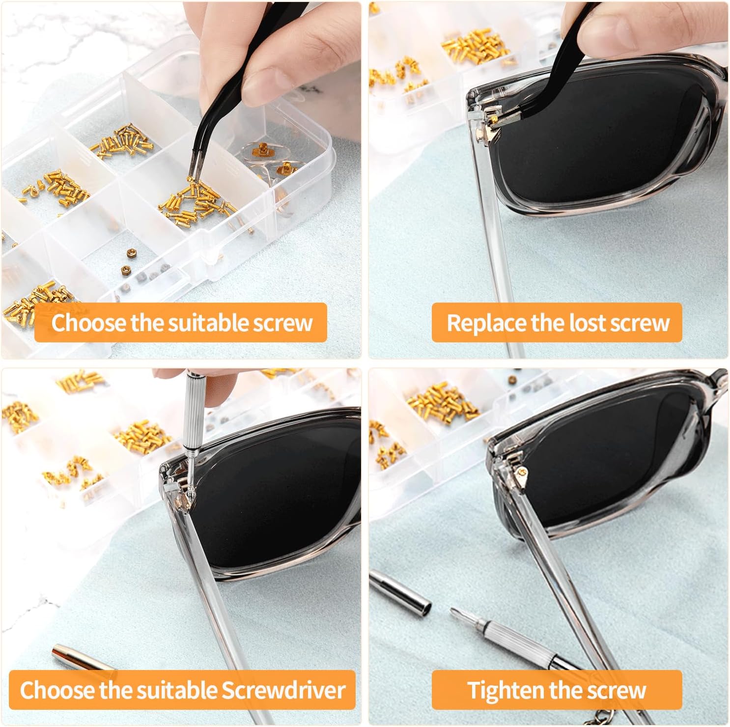 METAL, Paquete de kit de reparación de lentes incluido: el kit de reparación de gafas contiene 140 tornillos dorados para gafas con bolsas organizadoras de plástico, 9 tuercas, 2 pinzas, 4 pares de almohadillas nasales para gafas, 1 juego de destornilladores de precisión para gafas, 1 paño para gafas, 1 caja de almacenamiento, cumpliendo con todos los requisitos de reparación de tus lentes. Viene con 7 tamaños diferentes de pequeños tornillos para anteojos dentro de 0.03 ~ 0.2 pulgadas. Experimentarás un tipo diferente de diversión en la reparación de tus lentes con nuestro kit de reparación de anteojos con tornillo dorado., Kit de reparación de cristales de ojos de alta calidad con tornillos: a diferencia de otros tornillos tradicionales de lentes baratos, todos nuestros tornillos para gafas están hechos de metal de color dorado resistente al óxido, que es duradero y no se oxida fácilmente, muy adecuado para reparación de lentes de sol, lentes y relojes. Cada tamaño de los tornillos para anteojos está empaquetado individualmente en una bolsa para evitar el desorden de tornillos. Hay unas pinzas inclinadas para recoger pequeños tornillos y ponerlos en un agujero roscado, haciendo que tu ocular esté limpio y ordenado., Almohadillas de silicona para la nariz: con el material de silicona extra suave de las almohadillas nasales, es agradable al tacto y transpirable, lo que te proporciona comodidad al usar anteojos, reduciendo el dolor o las molestias. Las almohadillas comunes para la nariz son adecuadas para la mayoría de los anteojos, puedes montarlas y quitarlas tú mismo fácilmente. Tenemos 2 pares de color dorado y 2 pares de color transparente para que puedas reemplazar libremente., Juego de destornilladores 4 en 1 para reparación de lentes de sol: el juego de destornilladores tiene un diseño especial 4 en 1 que incluye el destornillador de cabeza plana, destornillador de cabeza Phillips, destornillador torx y destornillador hexagonal. La superficie del kit de herramientas de reparación de destornilladores está adaptada por material de acero inoxidable duradero, fácil y bastante cómodo de agarrar en la mano y conveniente de usar para diferentes tipos de reparaciones., Presta atención: 1. Hay 7 estilos diferentes de tornillos para gafas, cualquier detalle consulta nuestra imagen del producto. 2. Comprueba cuidadosamente si todos los accesorios se ajustan a tus lentes antes de comprar. 3. El tamaño del tornillo tiene una desviación de 0.001 a 0.005 pulgadas en la medición manual, consúltanos antes de realizar un pedido., Marca para ti: tu satisfacción es la fuerza impulsora de nuestro crecimiento. Prometemos que el kit de reparación de lentes de sol ofone con tornillos proporciona una garantía de 30 días sin preocupaciones y un servicio amigable de 7 x 24. Si tiene alguna duda, póngase en contacto con nuestro equipo de servicio lo antes posible. ¡Gracias por su apoyo!