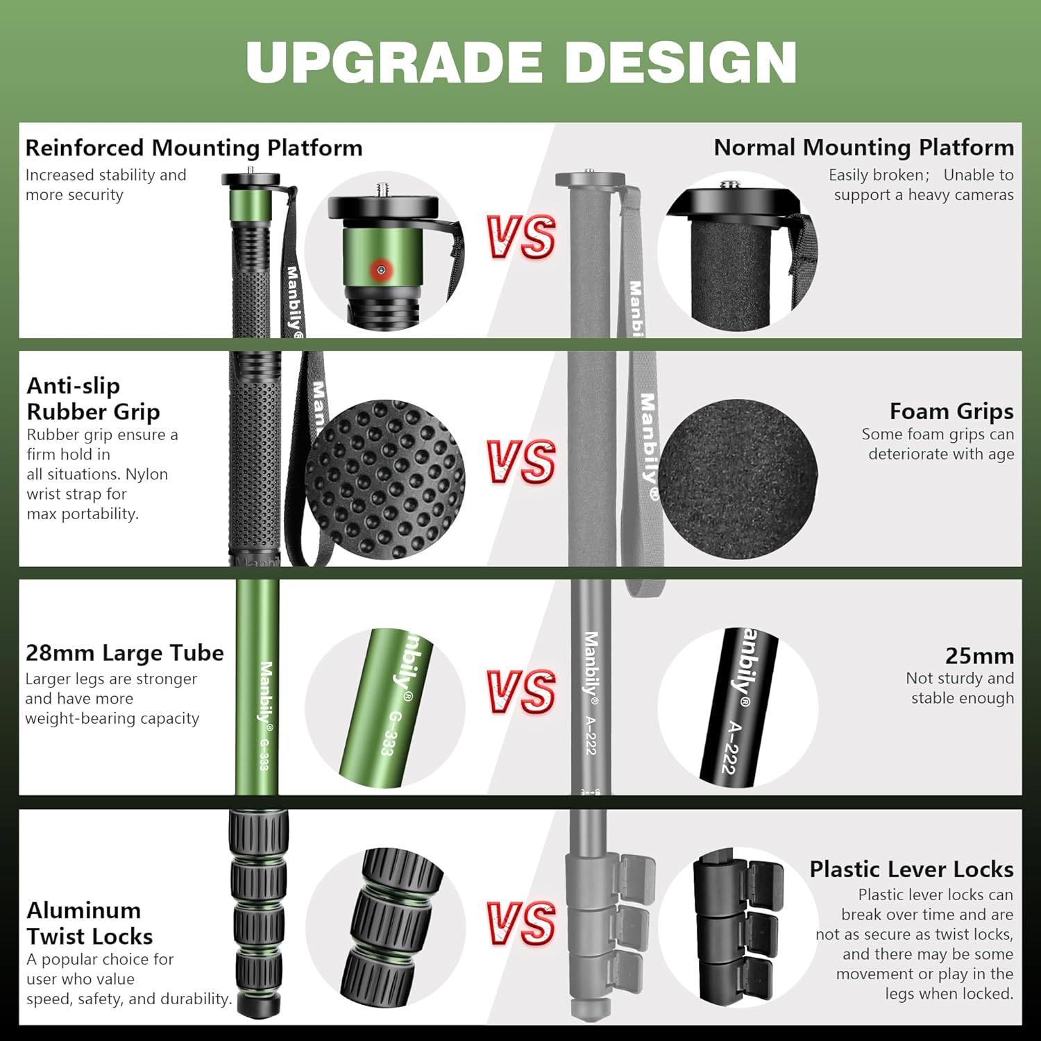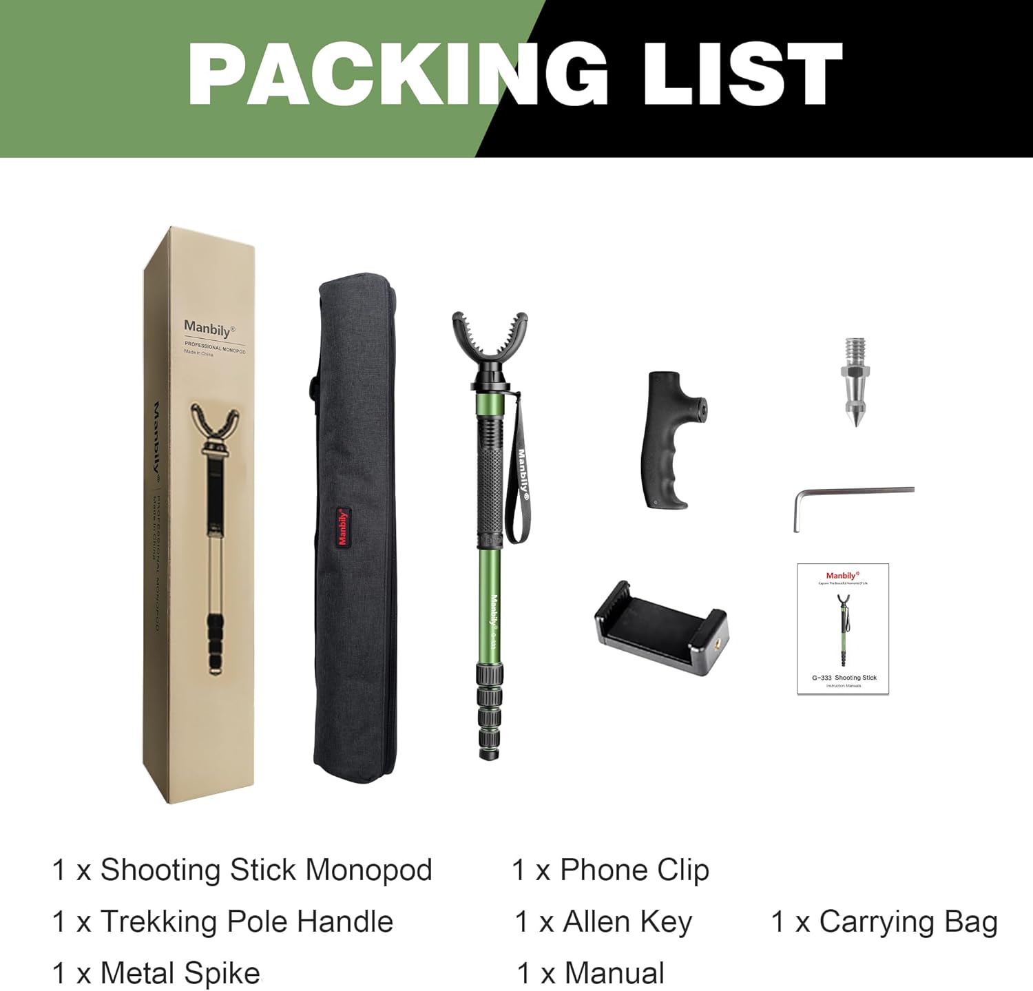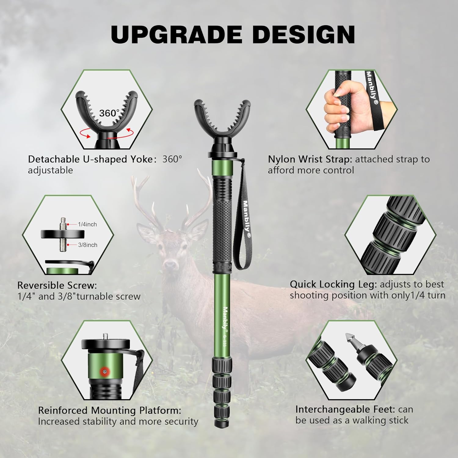 MONOPODE DE disparo: Estructura de aluminio de grado aeroespacial fuerte con una pata grande de 5 secciones de 1.102 in que proporciona una mayor resistencia (hasta 15,4 lbs/7 kg de carga) y estabilidad. Peso total del bastón de tiro: 1.32 libras, longitud plegada: 22.8″, altura máxima: 68″., Construcción sólida: los monopies de caza Manbily están mecanizados con precisión de aluminio duradero de alta tecnología para una mayor resistencia y durabilidad. El acabado anodizado hace que todas las superficies metálicas sean resistentes a la abrasión. La plataforma de transporte de aluminio está reforzada con remaches para garantizar que resiste el uso resistente al exterior., Tubo grande de 1.102 in: diseñado con un tubo grande de 1.102 in, nuestro monopie de rifle ofrece una mayor resistencia y una mayor capacidad de peso. Disfrute de un apoyo y estabilidad óptimos, incluso con pistolas o equipos más pesados., Yugo ancho en forma de U: el yugo en U gira 360° para que pueda apuntar a animales en movimiento sin cambiar su posición. A diferencia de un yugo endeble en forma de V de plástico, nuestro monopie cuenta con un yugo en forma de U más ancho. Este innovador diseño acomoda una variedad de armas. La construcción de goma de alta calidad proporciona una resistencia superior y resiste la rotura, incluso durante un uso intenso., ALTAS DE GOMA PROTECTORAS: El resto tiene aletas de goma en el interior para asegurar varias armas como rifles o ballestas. Sostendrá tus escopetas de forma segura sin dañar ningún punto de contacto después de un potente retroceso o choque., Agarre de goma antideslizante: diseñado para mayor comodidad y funcionalidad, el agarre de goma premium garantiza un agarre firme incluso en condiciones húmedas o resbaladizas, lo que te permite mantener un objetivo preciso. Algunas empuñaduras de espuma pueden deteriorarse con el tiempo. Correa de muñeca de nailon para una máxima estabilidad., COLOR VERDE PARA FÁCIL CONCEALMENTE: El acabado verde está diseñado específicamente para una fácil ocultación en el campo. Su revestimiento anodizado duro proporciona resistencia contra la corrosión y el desgaste, asegurando un rendimiento duradero sin rayar ni decolorar fácilmente., Fácil de usar: el tornillo reversible de 1/4″ y 3/8″ permite el montaje de prácticamente cualquier apoyo, cabeza de bola o cámara. Se ajusta fácilmente a una variedad de posiciones de disparo con una perilla de liberación rápida de 1/4 de giro que ajusta la altura en segundos. Pies intercambiables para adaptarse a diferentes terrenos., Lo que obtienes: 1 monopie+yugo en forma de U, 1 mango de bastón, 1 pie de metal, 1 clip para teléfono, 1 llave Allen, 1 manual (idioma español no garantizado), 1 funda de transporte.