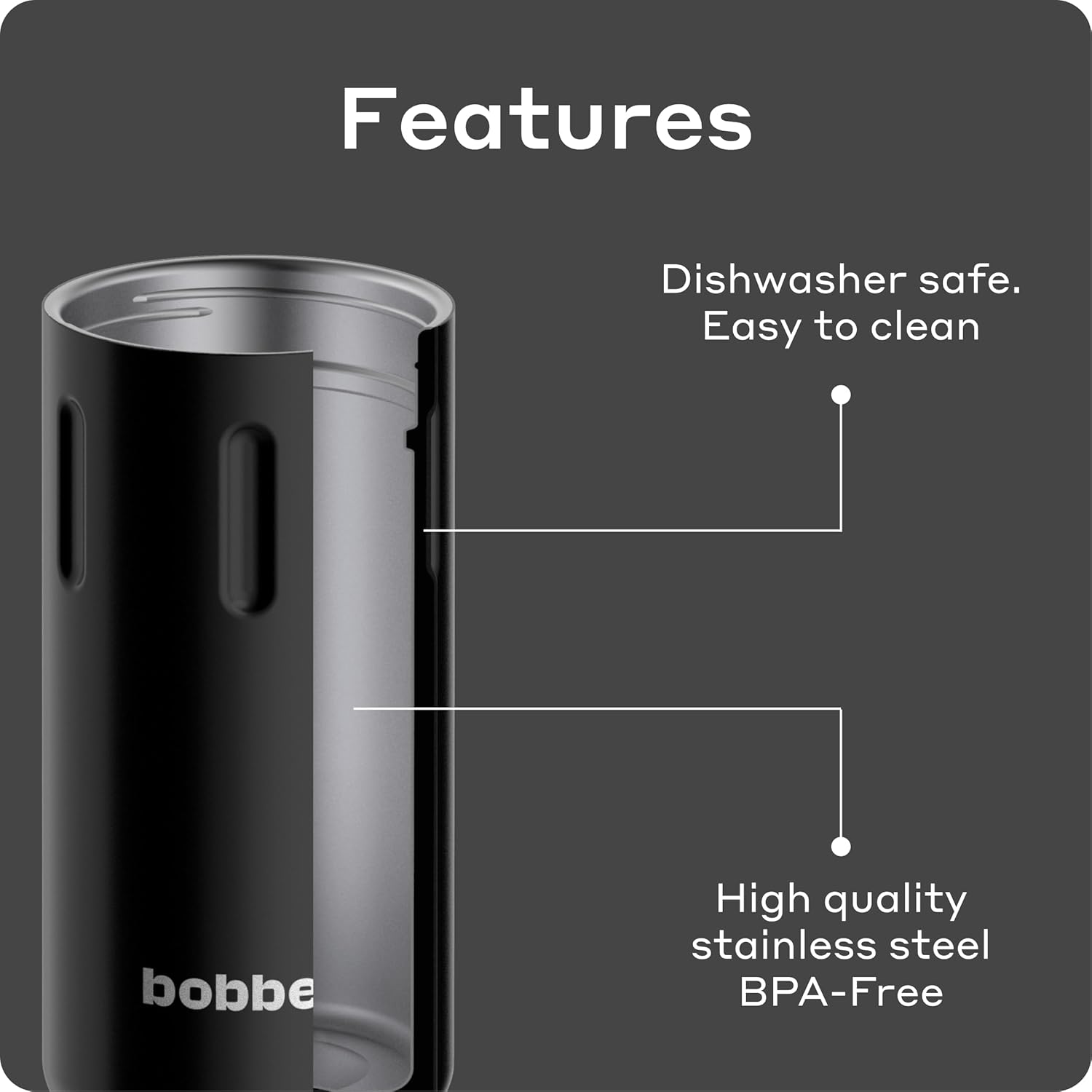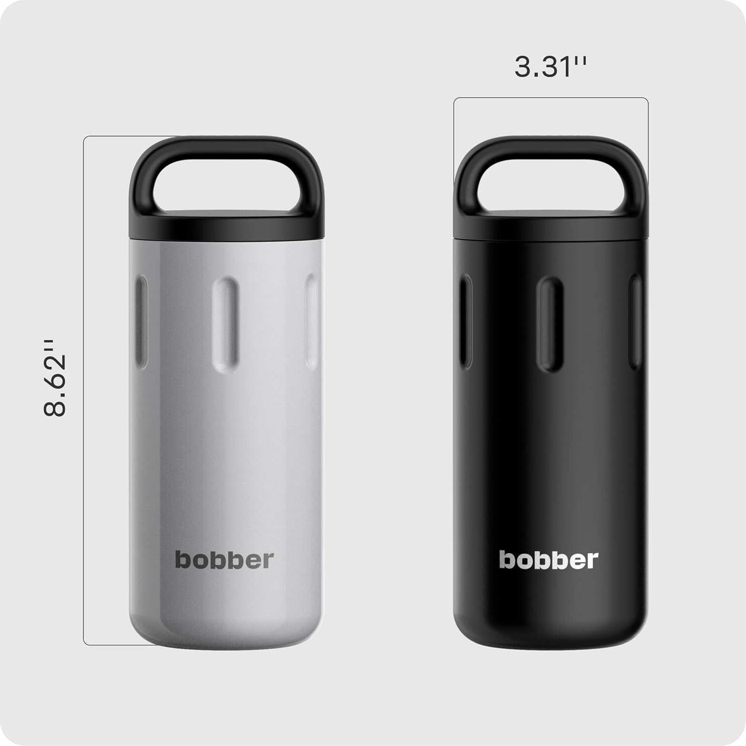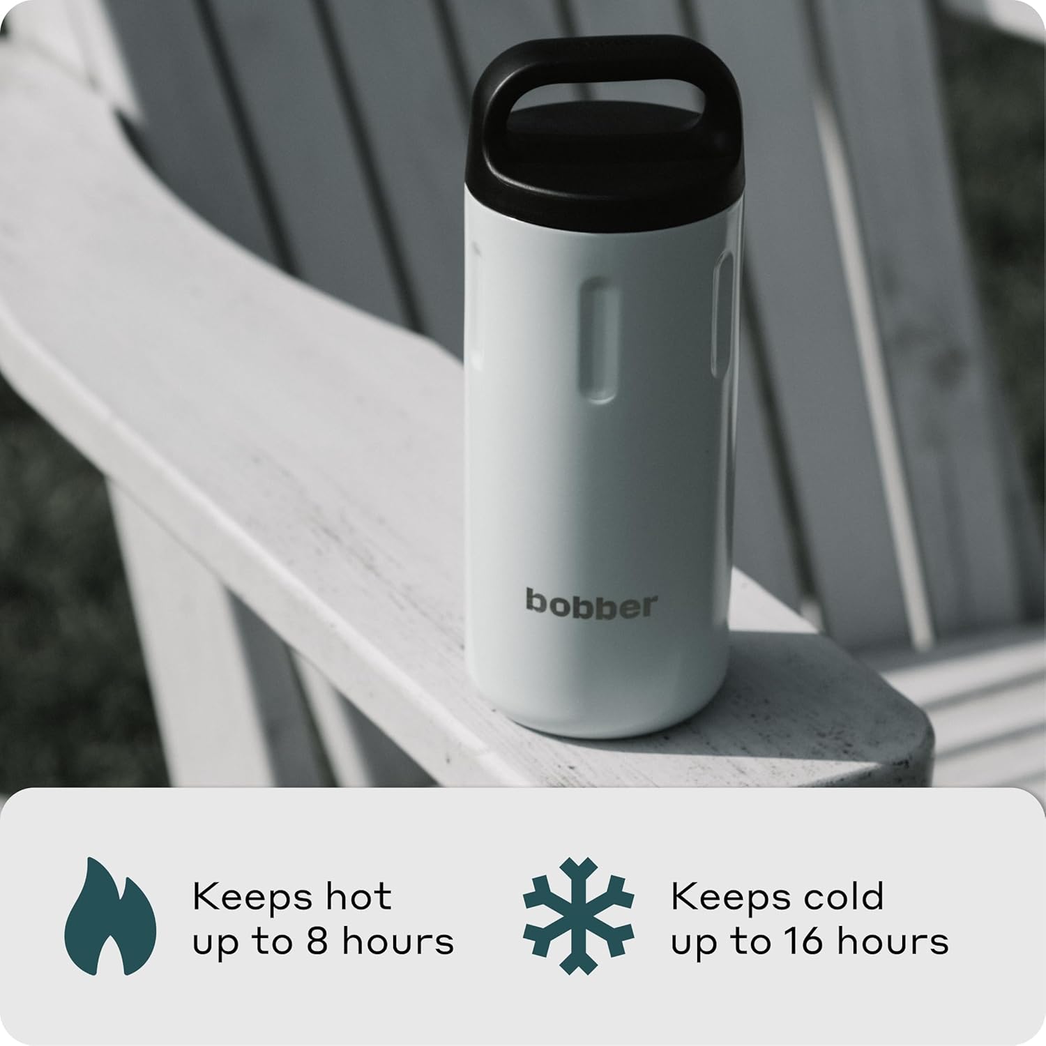 EXCEPCIONAL CONTROL DE TEMPERATURA: La botella se mantiene caliente hasta 8 horas y fría hasta 16 horas. Aislamiento al vacío de doble pared, capa aislante de alta calidad y anillo de silicona en el tapón ayudan a mantener la temperatura deseada por más tiempo. La parte exterior del matraz tiene un revestimiento superior de cobre para mantener el café y el té calientes, mientras que el agua helada se mantiene fría, Multifuncional, 100% a prueba de fugas y sin sudor: Extremadamente fácil de abrir y cerrar, la forma ergonómica de las tapas ayuda a evitar accidentes o derrames, Duradero y perfecto hasta el más mínimo detalle: apto para lavavajillas. Fácil de limpiar. Duradero e inastillable, La seguridad es lo primero: fabricado con acero inoxidable 18/8 de alta calidad, plástico de grado alimenticio, silicona de grado alimenticio. No se oxida, sin BPA y cuenta con un revestimiento exterior de cerámica, Satisfacción garantizada: todos los productos Bobber vienen con una garantía del fabricante de 5 años. Diseño elegante y galardonado y calidad excepcional hacen de Bobber un regalo perfecto para vacaciones y hogar imprescindible.