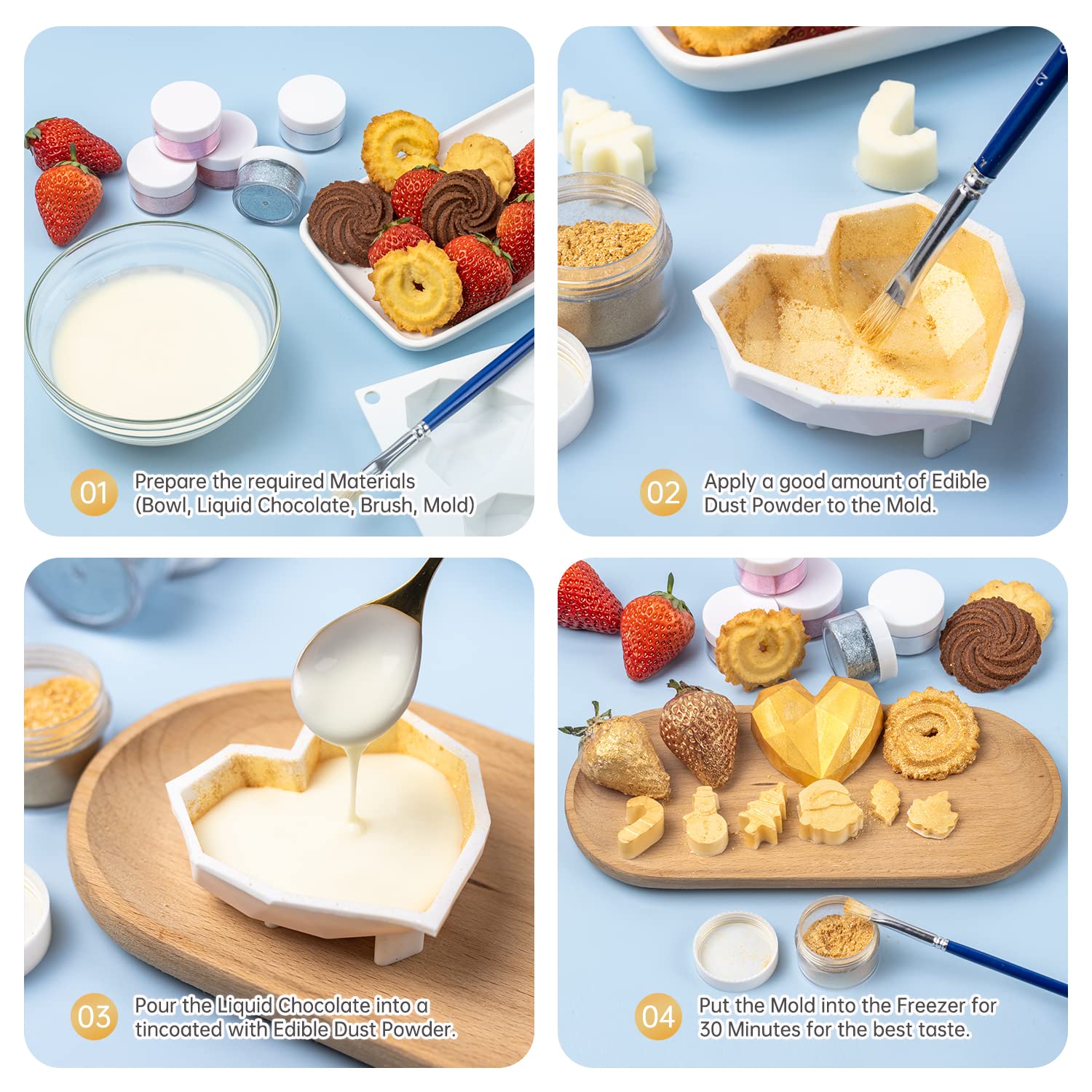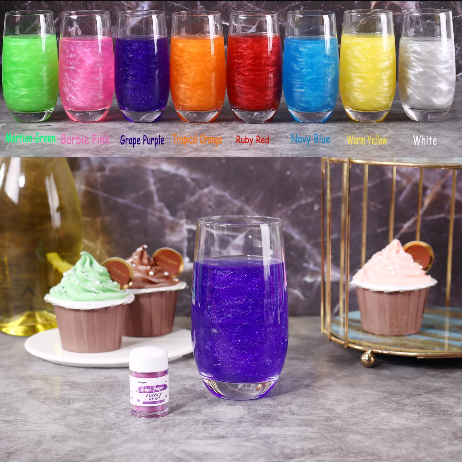 Certificación: Kosher & Halal Certified. Polvo de brillo comestible para bebidas, la purpurina comestible está hecha de ingredientes 100% seguros de grado alimenticio. El paquete viene en 8 colores: oro rosa, oro, blanco, verde brillante, oro bronce, morado lavanda, amarillo cálido, azul marino Ampliamente utilizado en alimentos: El polvo de brillo comestible no solo se puede utilizar en bebidas, como galletas, pasteles, cupcakes, chocolates y macarons. Pero también se puede utilizar en decoración artística. Nuestra purpurina comestible es segura de usar y es una purpurina comestible de grado alimenticio desarrollada para la industria de decoración de pasteles y manualidades. Ampliamente utilizado en bebidas: el brillo comestible puede tener un efecto brillante en vodka, bebidas alcohólicas, cócteles. Hace que las bebidas agreguen un color mágico y más vívido. ¡Y no afecta la textura! Vida útil: La vida útil de la purpurina comestible es de 24 meses, Fecha de producción, consulte la botella o el embalaje. La purpurina comestible puede satisfacer las necesidades de hacer productos horneados varias veces. El polvo brillante es rentable y la tapa sellada puede satisfacer las necesidades de múltiples decoraciones para hornear alimentos. La purpurina comestible es rentable y la tapa sellada puede satisfacer las necesidades de múltiples decoraciones para hornear alimentos. Solo se necesita una cucharada pequeña para cada uso. Servicio al cliente: si no está satisfecho con nuestro brillo o servicio comestible, no dude en contactarnos por correo electrónico a tiempo. Siempre hacemos todo lo posible para resolver sus problemas y consultas.