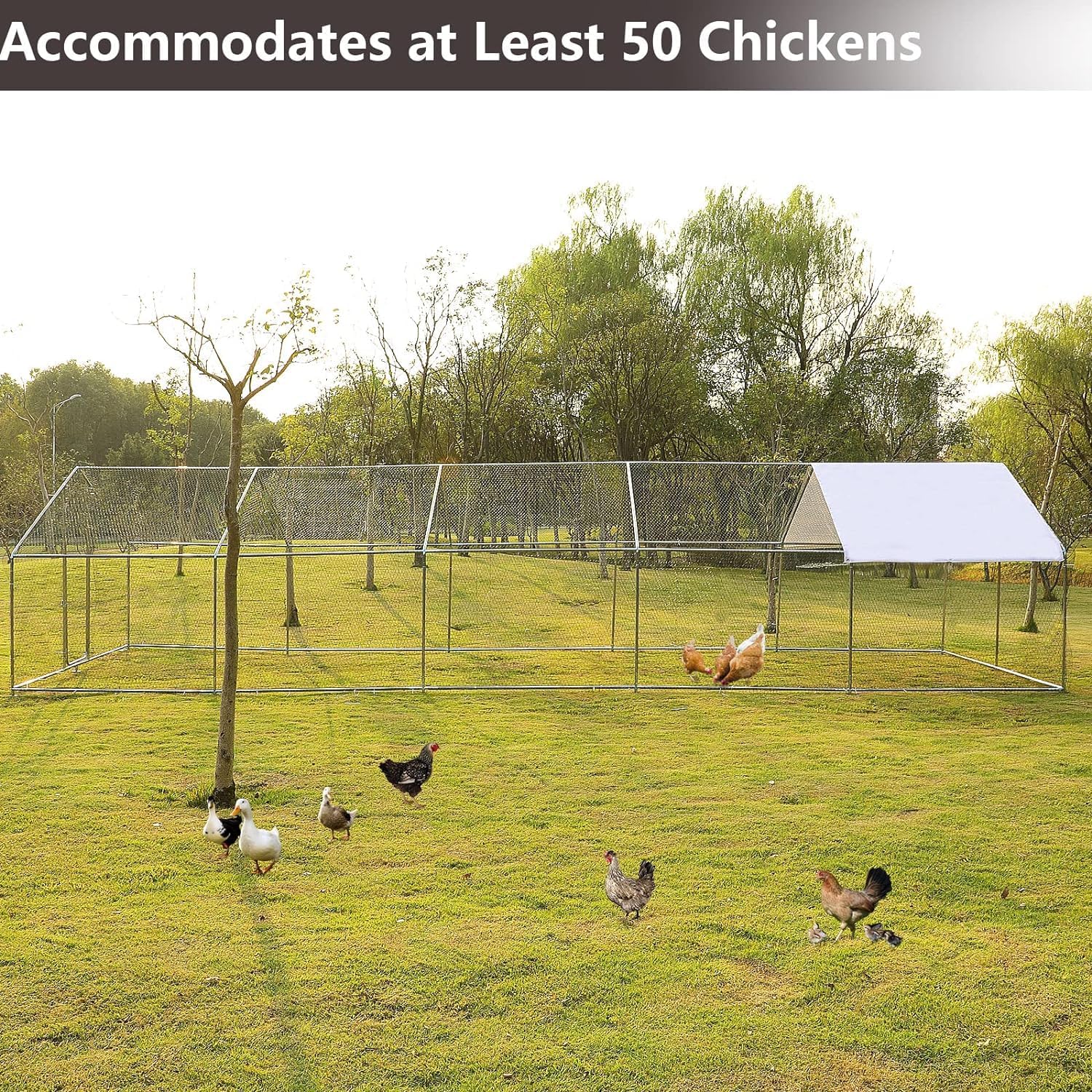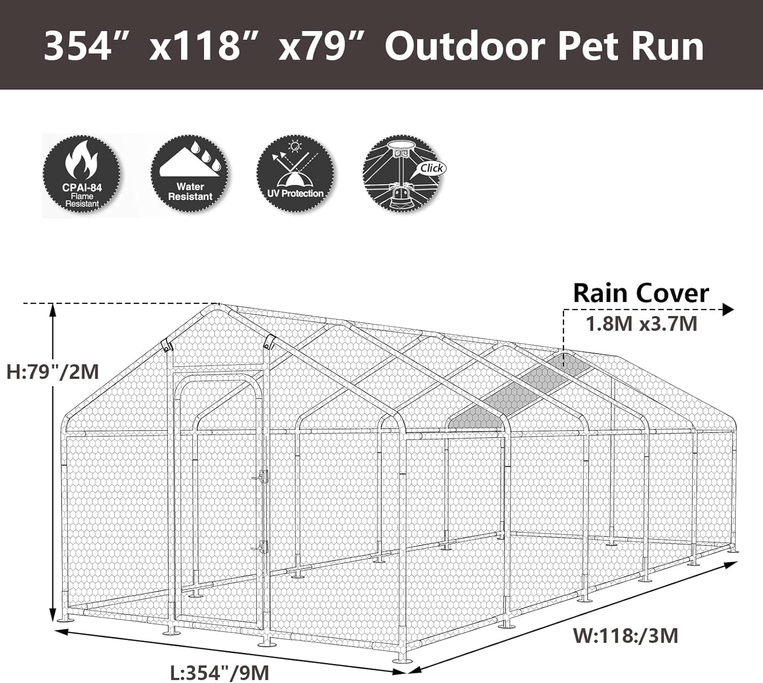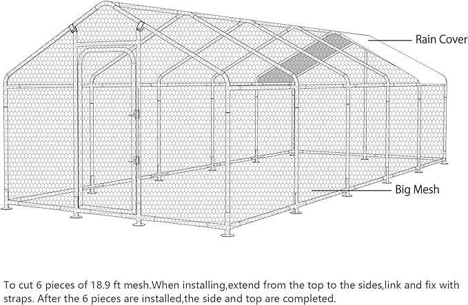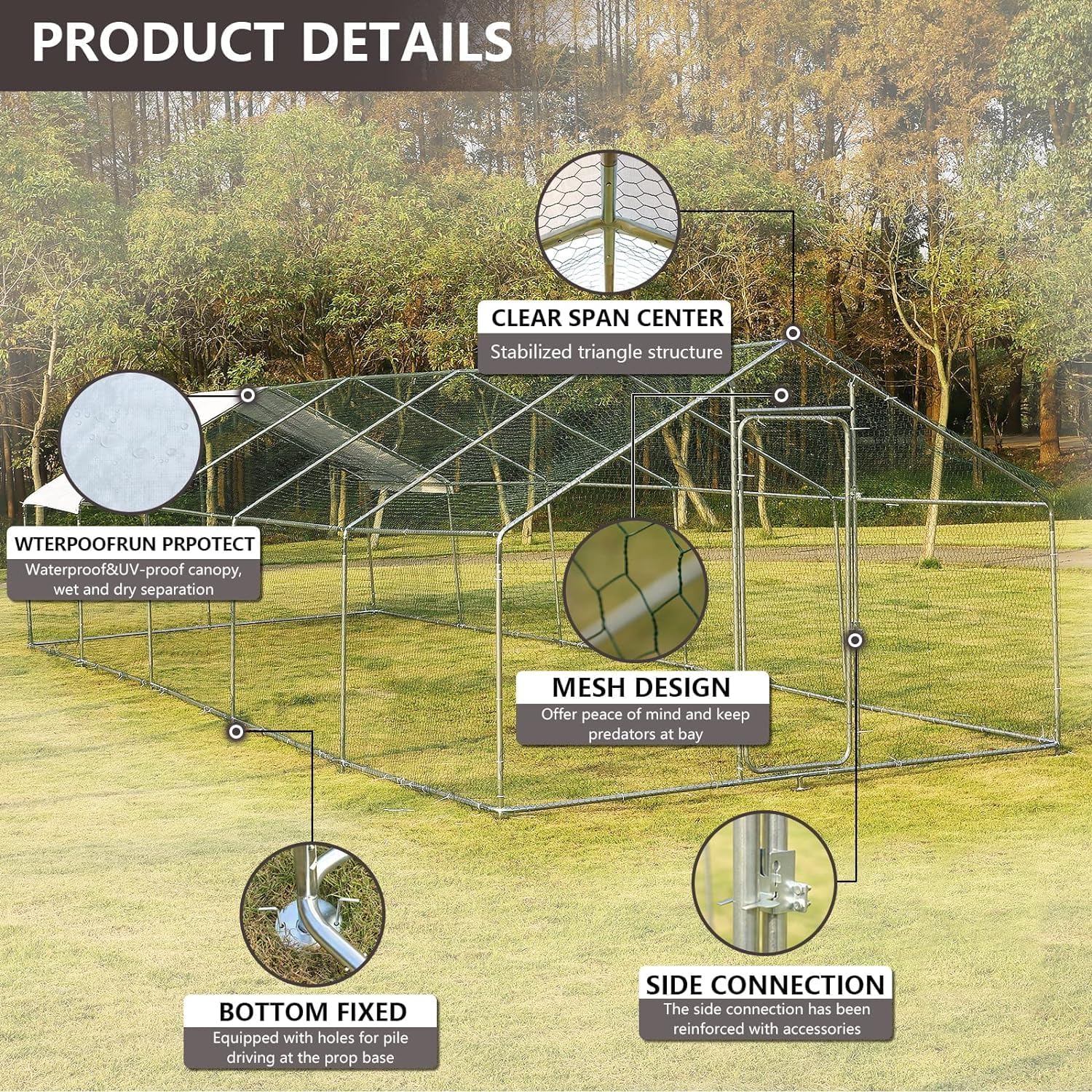 Acero galvanizado mejorado resistente al óxido y duradero: el gallinero está hecho de estructura de acero resistente, y teniendo en cuenta la posibilidad de óxido al aire libre, la superficie de la tubería de acero se actualiza con un proceso galvanizado, que es más resistente al óxido y más hermoso al mismo tiempo. El proceso de galvanización también hace que la superficie del gallinero sea más fácil de limpiar., Puerta de acero con cerradura con pestillo para mayor seguridad: la puerta de acero está equipada con un pestillo para garantizar aún más la seguridad de la jaula, que es más científica y conveniente en comparación con la puerta del gallinero tradicional. Reduce la posibilidad de que los pollos escapen fácilmente, lo que se puede lograr simplemente girando el interruptor cuando necesite la cerradura., El cobertizo de polietileno es capaz de adaptarse a varios cambios climáticos: el cobertizo de polietileno se adapta a varios cambios climáticos. Se puede utilizar tanto al aire libre donde los rayos UV son muy fuertes como en climas lluviosos o nevados. Capaz de adaptarse a los cambios de temperatura y se puede colocar en ambientes exteriores donde la temperatura cambia de caliente a frío., El moldeo por inmersión de PVC de superficie de malla metálica es más seguro y fuerte: las paredes del gallinero están hechas de malla de alambre hexagonal sumergida en plástico, que es muy fuerte y no es fácil de dañar y oxidar. Además, los pequeños espacios entre la malla pueden aumentar la seguridad de los pollos y evitar que se escapen de la jaula, que también es una protección para los pollos., Más fácil de instalar y no solo para pollo, conejo, pato, perro y más: se incluyen instrucciones detalladas de diseño de gallinero en el producto para tu comodidad en la instalación. Cada parte de conexión del gallinero está optimizada tanto para facilitar la instalación como para la estabilidad. Además, este gallinero se puede utilizar para algo más que pollos, tus conejos, patos, perros y otros animales se pueden colocar en este gallinero, dando convenientemente a tus aves de corral un hogar al aire libre.
