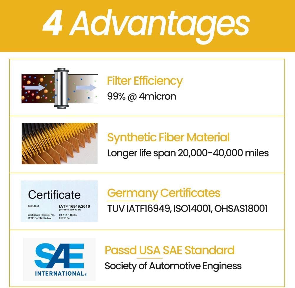 TP1015 MATERIAL DEL FILTRO DE COMBUSTIBLE: Papel de filtro de 3 capas original Italia Ahlstrom, hecho de fibra sintética, da como resultado una eficiencia 99% más alta a 4 micras, mayor clasificación de filtro que el filtro de 5 o 10 micrones, separe eficazmente el aceite y el agua, protege el sistema de combustible de su vehículo de contaminantes, tales como: suciedad, óxido y partículas de pintura; Vida útil más larga: el material importado de Italia tiene una eficiencia de filtración del 99%, 3 capas, da como resultado una mayor capacidad de retención de polvo que las capas ordinarias de 1-2 y una vida útil más larga, necesita ser reemplazado solo después de conducir por un promedio de 20,000-40,000 millas. El kit de filtro de combustible contiene todo lo que necesitas para reemplazar un filtro de combustible en tu vehículo Accesorio para filtro de combustible TP1015: apto para motor diésel Duramax de 6.6L compatible con Chevrolet Silverado 2500/3500/2500HD/3500HD, GMC Sierra 2500/3500/2500HD/3500HD, 2014-15 2.0L Chevrolet Cruze /2017-2017-2500HD/3500HD, 2014-15 2.0L Chevrolet Cruze /2017-2017-2017-2017-2017019 1 0.6 litros Número de pieza de repuesto del filtro TP1015: 23304096, 22937279, 23456595,96724, L9999F, XF10322, CS12228,FF1312, FD9017, DF99380, PGF422. 9, F21 393, SPTD10322, WF10451, 23304095, WF10453; CERTIFICADOS Y GARANTÍA: Alemania TUV IATF16949, ISO14001, OHSAS18001; Estándar de EE. UU.: Aprobado SAE1839 Standard Society of Automotive Enginess; 6 meses de garantía. Proporcionaremos el mejor servicio post-venta. Si no estás satisfecho con la calidad de nuestros productos después de la compra, resolveremos el problema a tiempo.