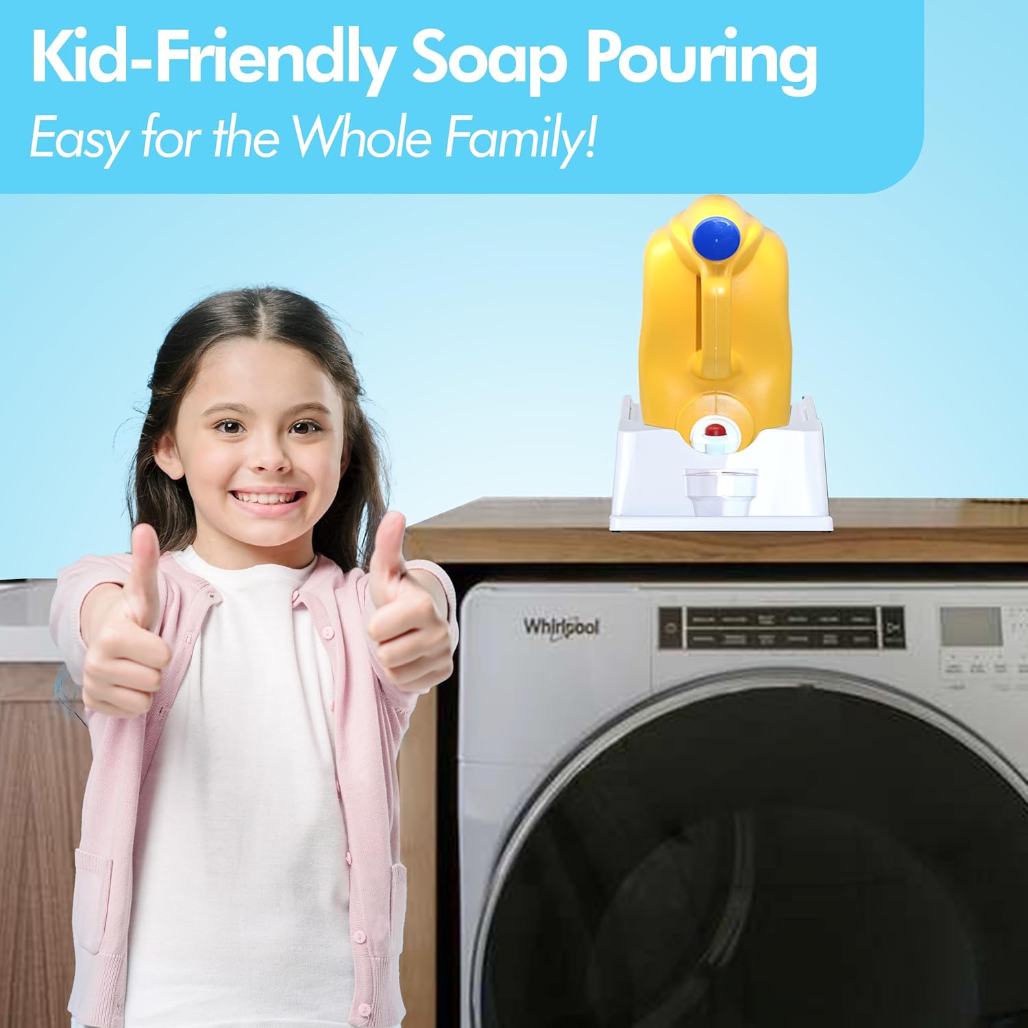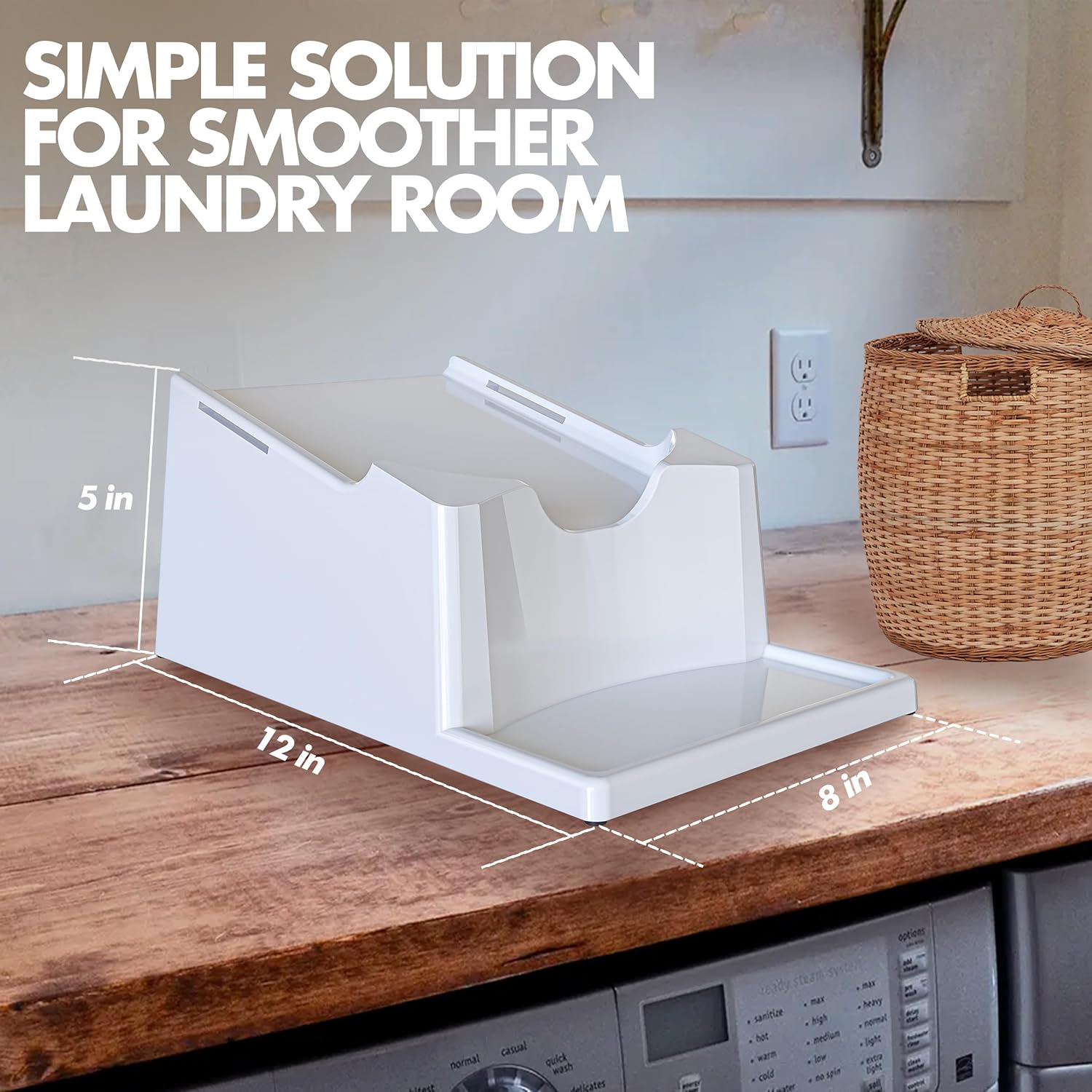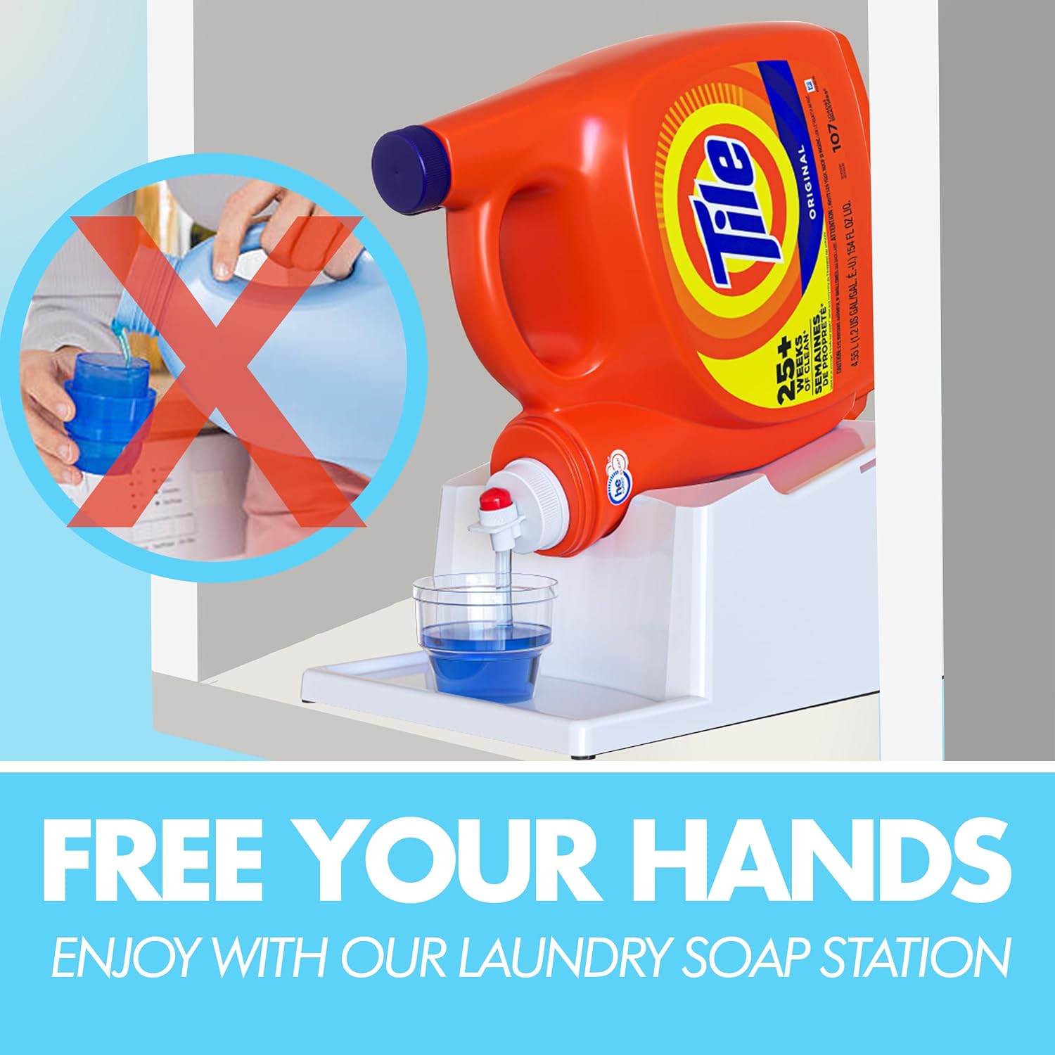 El colector de goteo de ropa en ángulo pendiente de patentes permite verter sin derrames sin inclinar o levantar la botella, gracias a su pendiente descendente que hace que el jabón se derrame fácilmente., Las patas de goma del organizador de detergente garantizan una colocación segura y estable., El dispensador de jabón para ropa viene con una correa para sujetar la botella de detergente cuando se coloca en la lavadora, proporcionando mayor comodidad y seguridad durante el uso., El borde moldeado de la plataforma evita que la taza medidora se deslice o se caiga, asegurando que el jabón o el detergente no gotee en los estantes o el piso, manteniendo la zona de lavandería limpia y ordenada., El soporte para detergente para ropa tiene dimensiones de 12.2 pulgadas de largo, 7.9 pulgadas de ancho y 5.5 pulgadas de alto. El jabón y la botella no están incluidos en la estación.