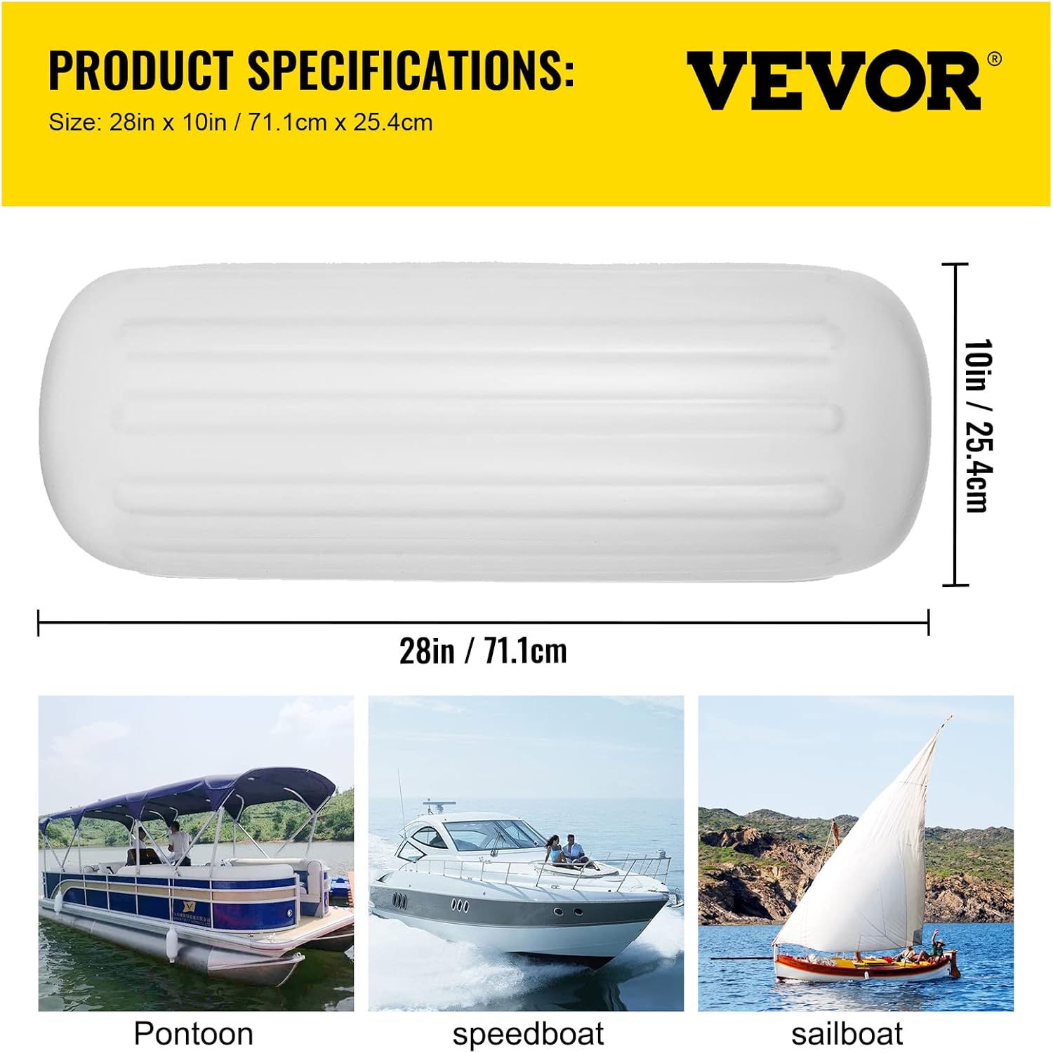 Guardabarros para barcos de 10 x 28 pulgadas: los guardabarros VEVOR son tu protección contra daños en el casco. Estos guardabarros de barco son ideales para proteger su embarcación de abolladuras antiestéticas y abolladuras mientras está amarrado en el muelle o cerca de otros barcos., Construcción de vinilo premium: hecho de vinilo marino, nuestros guardabarros para barcos sobresalen en proporcionar un sello hermético al gas y cuentan con una durabilidad excepcional. Diseñados con vinilo marino de alta resistencia, garantizan una fiabilidad duradera, mientras que la protección UV fortalece su resistencia contra condiciones climáticas adversas., Diseño del agujero central: nuestros guardabarros inflables cuentan con un cuerpo cilíndrico con un agujero estratégicamente colocado, mejorando la versatilidad. Este diseño permite la colocación vertical y horizontal, mientras que la textura acanalada en todos los lados refuerza su integridad estructural., Fácil inflado e instalación: cada paquete incluye cuatro guardabarros para barcos, que se pueden inflar y montar sin esfuerzo. Con un rápido tiempo de inflado de 2 minutos por guardabarros, incluso una sola persona puede manejar la tarea sin encontrar ninguna complejidad., Para sus necesidades: elija el tamaño de guardabarros adecuado según el diámetro recomendado de 1 pulgada por cada 4 a 5 pies de longitud de barco. Estos guardabarros de barco son adecuados para una amplia gama de embarcaciones, incluyendo barcos, muelles, yates, veleros, botes de remos y más.