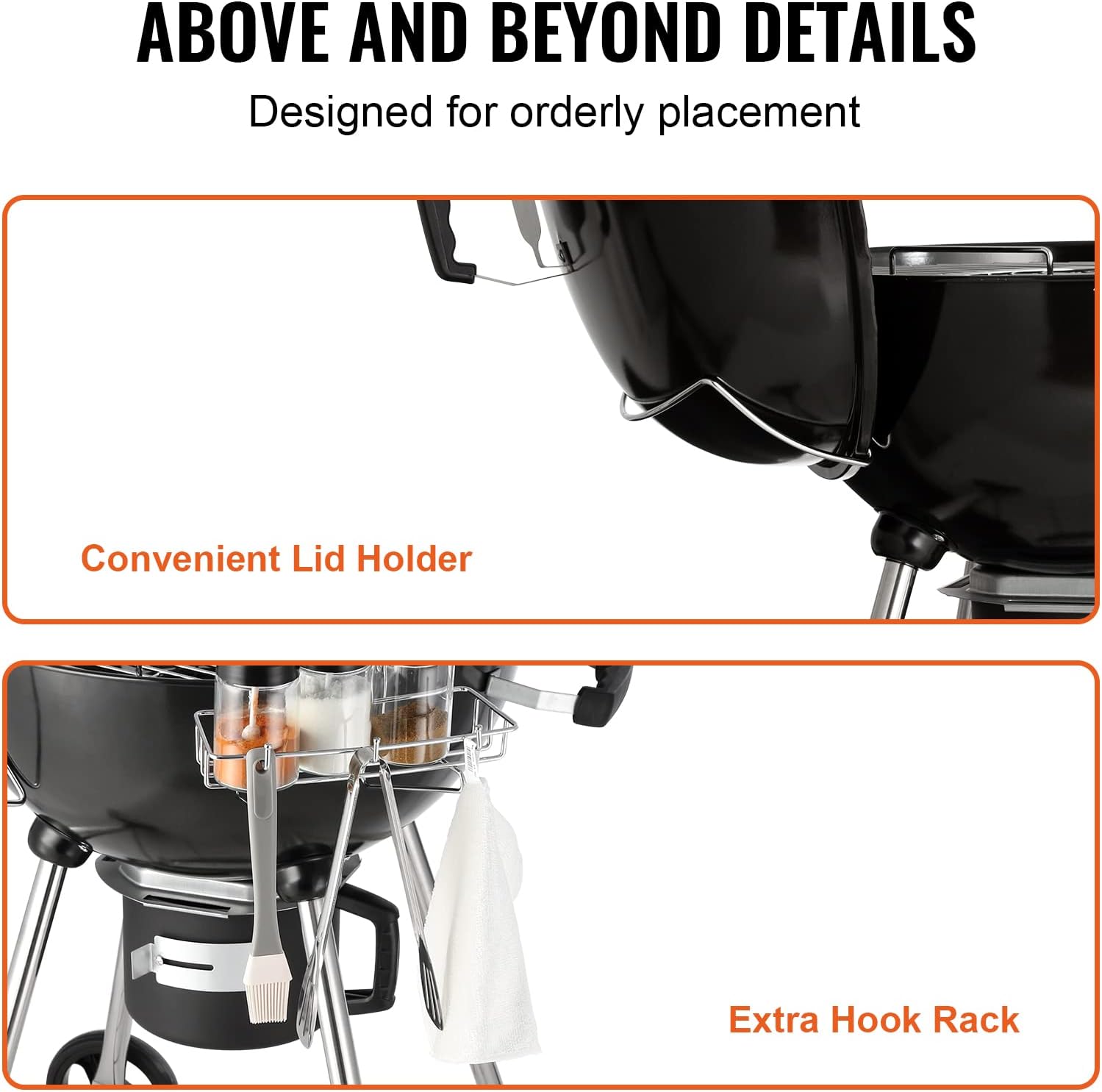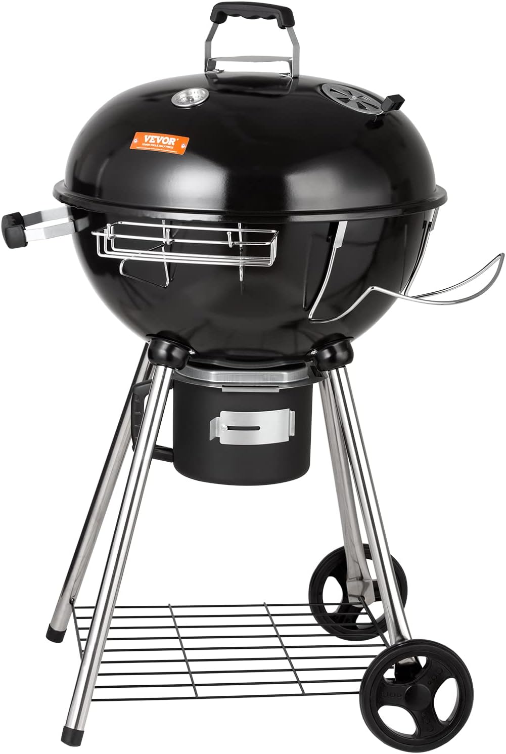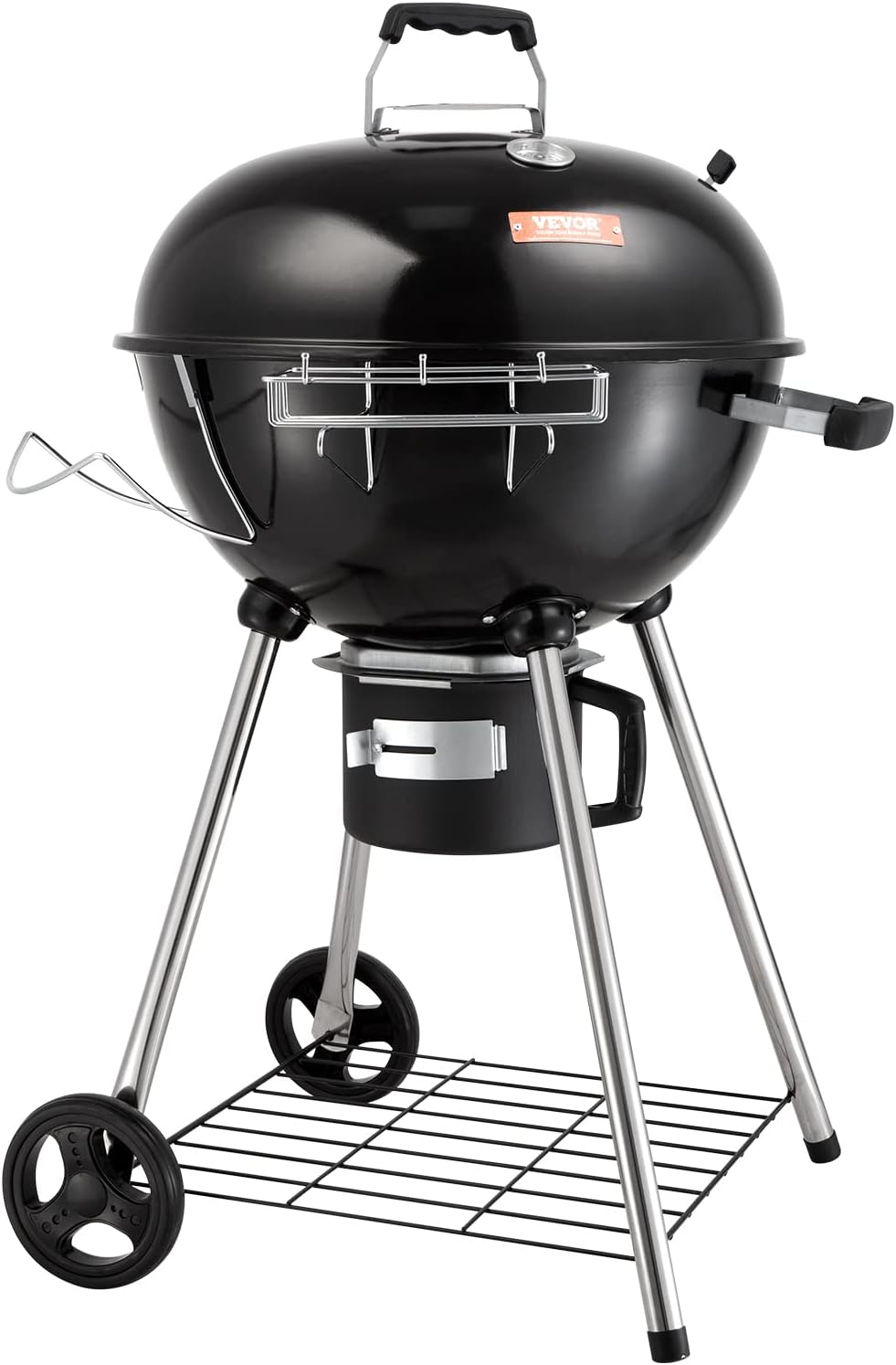 Parrilla de barbacoa de hervidor de 22 pulgadas: esta parrilla de hervidor cuenta con una gran parrilla de 22 pulgadas y puede contener hasta 13 hamburguesas, por lo que es ideal para pequeñas reuniones o fiestas de 6-7 personas. La tapa y el cuenco de fuego están hechos de porcelana esmaltada para retener el calor y no se oxida ni se pelan fácilmente. Fácil de limpiar: con un colector de cenizas extraíble, puede disfrutar de un sistema de limpieza de un solo toque, que proporciona una limpieza sin complicaciones de cenizas de carbón y desechos después de un largo día de parrilla. Control de calor preciso: puede ajustar fácilmente las válvulas para controlar el flujo de aire de su parrilla de carbón, regulando así la temperatura de cocción. Además, el termómetro integrado te ayuda a controlar la temperatura interna sin levantar la tapa. Colocación ordenada: ¡La molestia de cocinar al aire libre ya no es un desafío! Con el soporte de la tapa y el estante de gancho, puedes evitar colocar la tapa en el suelo, expandir tu superficie de parrilla y mantener todos tus ingredientes y condimentos a mano. Enróllelo en cualquier lugar: las ruedas duraderas le permiten mover su pequeña parrilla alrededor del patio rápidamente, y el estante inferior de la tienda amplía su espacio de almacenamiento. Perfecto para camping, picnics, fiestas y viajes en autocaravana. Disfrute de deliciosas comidas ahumadas en cualquier lugar y sienta que sus papilas gustativas bailan con cada bocado