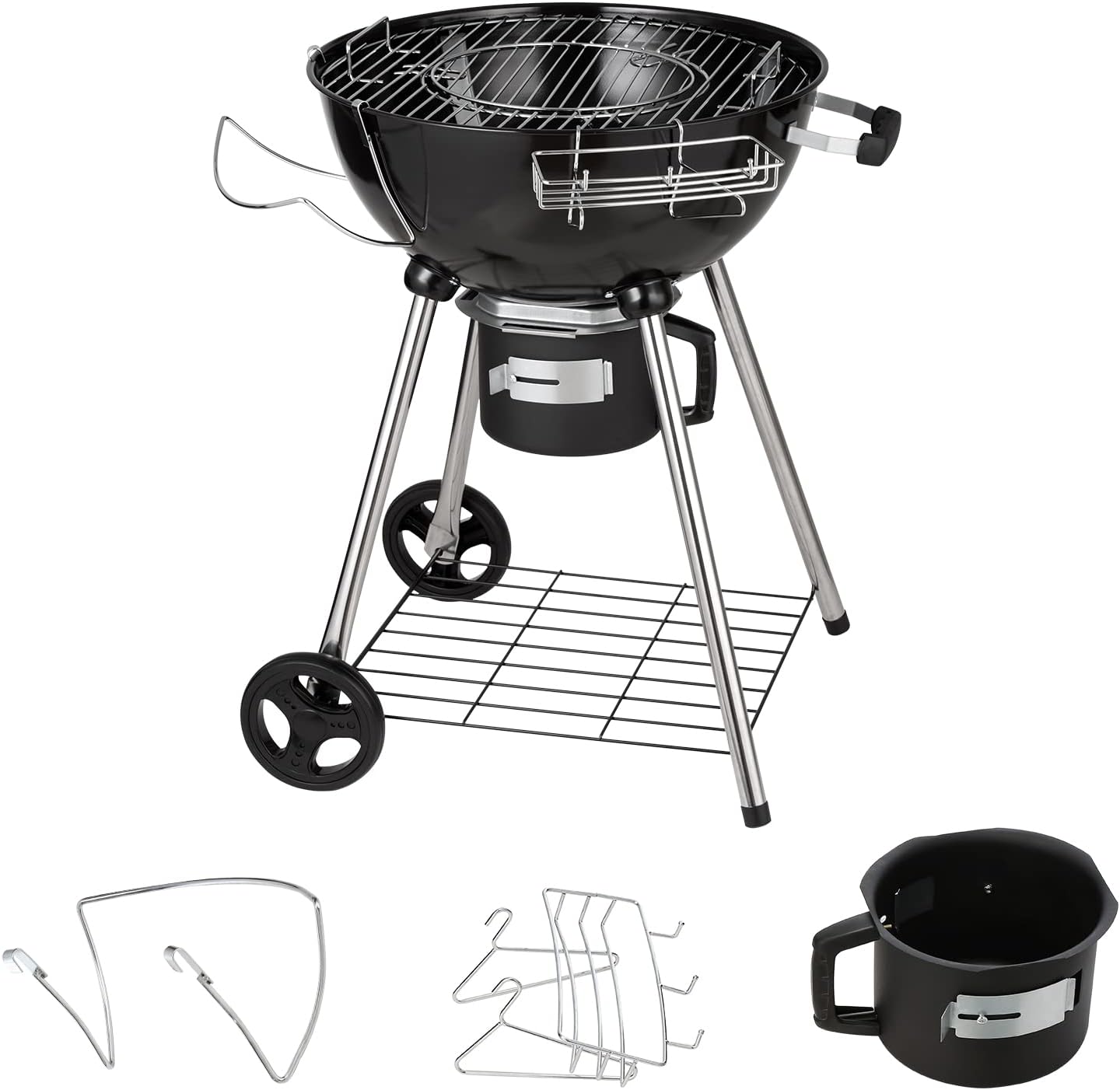 Parrilla de barbacoa de hervidor de 22 pulgadas: esta parrilla de hervidor cuenta con una gran parrilla de 22 pulgadas y puede contener hasta 13 hamburguesas, por lo que es ideal para pequeñas reuniones o fiestas de 6-7 personas. La tapa y el cuenco de fuego están hechos de porcelana esmaltada para retener el calor y no se oxida ni se pelan fácilmente., Fácil de limpiar: con un colector de cenizas extraíble, puede disfrutar de un sistema de limpieza de un solo toque, que proporciona una limpieza sin complicaciones de cenizas de carbón y desechos después de un largo día de parrilla., Control de calor preciso: puede ajustar fácilmente las válvulas para controlar el flujo de aire de su parrilla de carbón, regulando así la temperatura de cocción. Además, el termómetro integrado te ayuda a controlar la temperatura interna sin levantar la tapa., Colocación ordenada: ¡La molestia de cocinar al aire libre ya no es un desafío! Con el soporte de la tapa y el estante de gancho, puedes evitar colocar la tapa en el suelo, expandir tu superficie de parrilla y mantener todos tus ingredientes y condimentos a mano., Enróllelo en cualquier lugar: las ruedas duraderas le permiten mover su pequeña parrilla alrededor del patio rápidamente, y el estante inferior de la tienda amplía su espacio de almacenamiento. Perfecto para camping, picnics, fiestas y viajes en autocaravana. Disfrute de deliciosas comidas ahumadas en cualquier lugar y sienta que sus papilas gustativas bailan con cada bocado