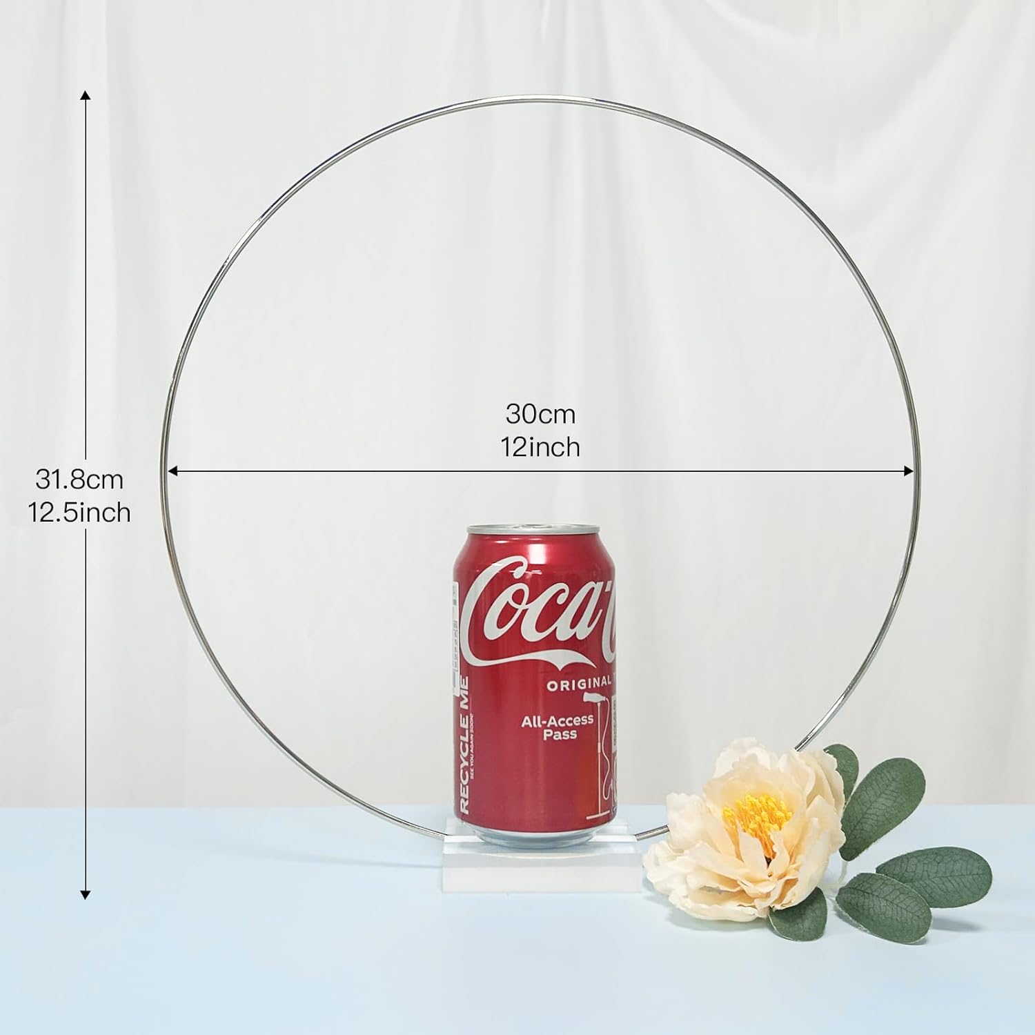 YALLOVE 10 piezas de centro de mesa de aro floral de 12 pulgadas, soporte de anillo de corona de metal plateado con base acrílica transparente para