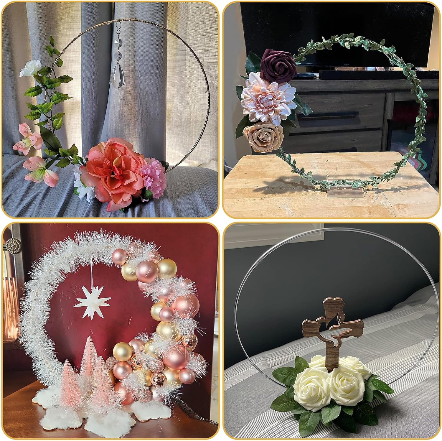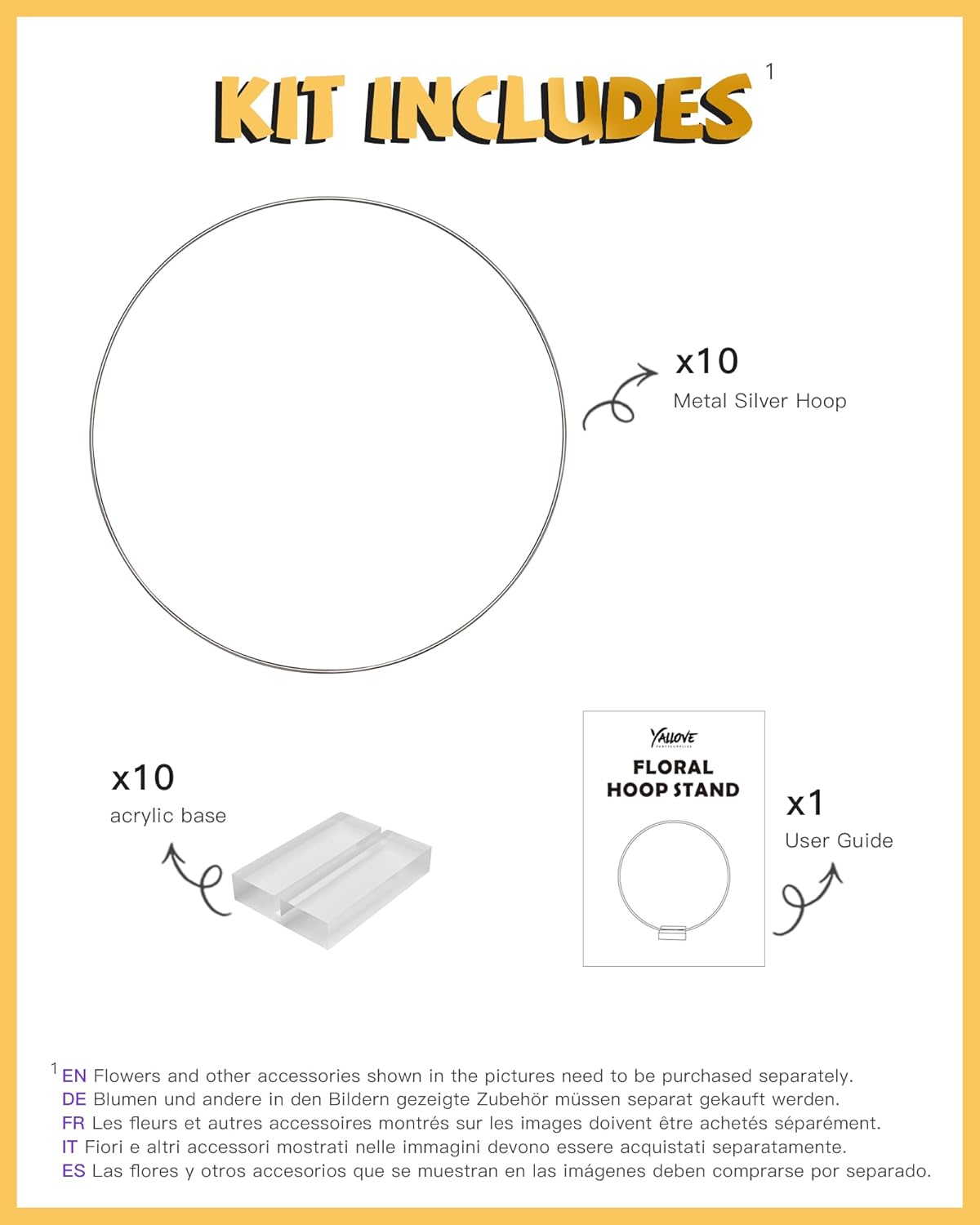 LO QUE OBTIENES: 10 piezas de anillos de plata de 12 pulgadas de diámetro con 10 piezas de la base acrílica, Elegante: con el clásico anillo plateado y la base acrílica transparente, puedes crear los centros de mesa de aro floral más fascinantes y elegantes centros de mesa de globos, Fácil de montar y desmontar: simplemente inserta el anillo en la ranura en la superficie superior del acrílico hasta que el anillo se sujete firmemente, sin necesidad de usar pegamento caliente para fijarlo, Resistente: hemos mejorado la base para que sea mucho más grande y pesada que la de madera, por lo que no te preocupes por volcarse, Versátil: además de los centros de mesa de corona de aro, el aro se puede utilizar como un anillo atrapasueños y la base acrílica se puede utilizar como un tarjetero por separado