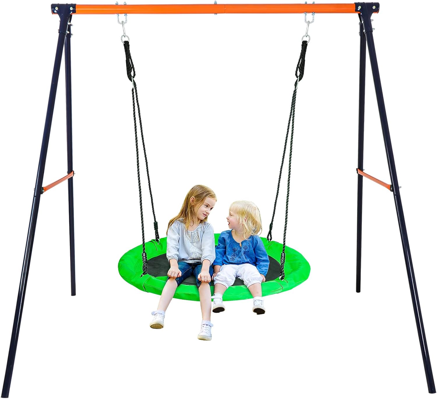 Resistente: este juego de columpio está hecho de postes duraderos con recubrimiento de polvo de acero y con soporte de marco en A para garantizar que el soporte sea resistente; el columpio de red de 40 pulgadas está hecho de tela Oxford y nailon de la más alta calidad. Cuatro cuerdas de nailon fijan el columpio redondo cuatro puntos para sujetar para equilibrio y estabilidad, marco de acero duradero con acolchado de espuma para mayor comodidad y seguridad, Segura y duradera: la plataforma oscilante está envuelta de forma segura en cuerda de polietileno duradera de 0.276 in, construida durante mucho tiempo y evita que tus hijos se rayen. Este juego de columpios para exteriores es la opción perfecta y segura para divertirse en el patio trasero. Nuestras exclusivas fundas de cuerda antiabrasión crean un ambiente seguro y sin arañazos. A diferencia de otros columpios, este columpio de árbol está diseñado exclusivamente con conexiones colgantes para proporcionar la más alta calidad de seguridad, Asiento de columpio grande y cómodo: cuenta con cuerda resistente y marco en un columpio de plataforma redonda de 40 pulgadas de diámetro, con gran espacio para que 1-2 niños se balanceen a la vez, todo el marco del columpio permite un peso de hasta 440 libras. Permite que los niños y sus amigos jueguen juntos, Fácil de montar: montaje rápido y fácil que ahorra tiempo y molestias. La parte superior de las cuerdas tiene anillos de acero que se conectan a una cuerda de suspensión resistente de hasta aproximadamente 71 pulgadas, la cuerda es ajustable. La parte superior del soporte tiene 2 ganchos que pueden conectar el columpio, resistente y seguro. Utiliza las estacas para anclar el soporte al suelo para mayor estabilidad, NOTA: Se requiere supervisión y montaje de adultos. Con este columpio giratorio tendrás el patio trasero más popular con tu familia. Regalo perfecto para niños, nietos. Se recomienda uso en exteriores. Este juego de columpios para patio trasero se envía con 2 paquetes separados, si solo recibes un paquete, espera pacientemente el segundo