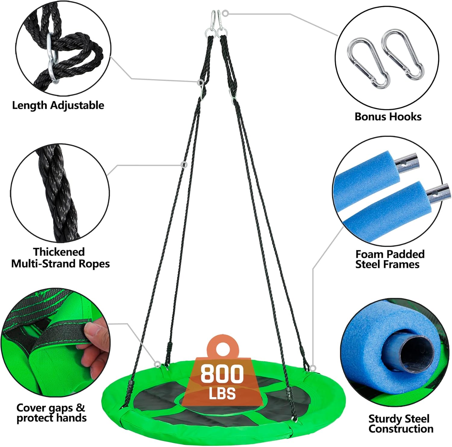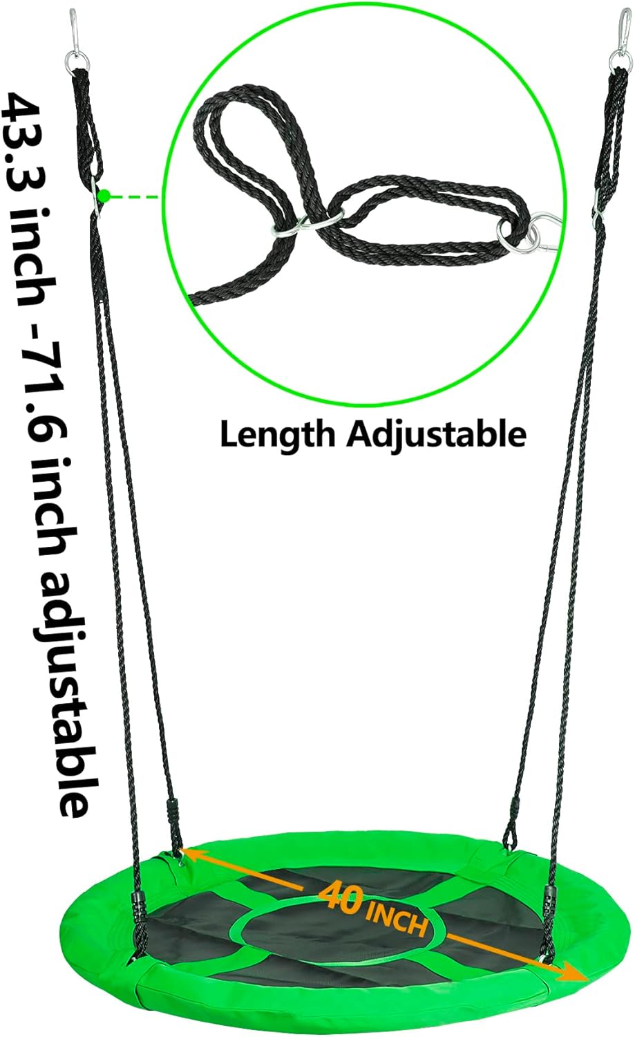 Resistente: este juego de columpio está hecho de postes duraderos con recubrimiento de polvo de acero y con soporte de marco en A para garantizar que el soporte sea resistente; el columpio de red de 40 pulgadas está hecho de tela Oxford y nailon de la más alta calidad. Cuatro cuerdas de nailon fijan el columpio redondo cuatro puntos para sujetar para equilibrio y estabilidad, marco de acero duradero con acolchado de espuma para mayor comodidad y seguridad Segura y duradera: la plataforma oscilante está envuelta de forma segura en cuerda de polietileno duradera de 0.276 in, construida durante mucho tiempo y evita que tus hijos se rayen. Este juego de columpios para exteriores es la opción perfecta y segura para divertirse en el patio trasero. Nuestras exclusivas fundas de cuerda antiabrasión crean un ambiente seguro y sin arañazos. A diferencia de otros columpios, este columpio de árbol está diseñado exclusivamente con conexiones colgantes para proporcionar la más alta calidad de seguridad Asiento de columpio grande y cómodo: cuenta con cuerda resistente y marco en un columpio de plataforma redonda de 40 pulgadas de diámetro, con gran espacio para que 1-2 niños se balanceen a la vez, todo el marco del columpio permite un peso de hasta 440 libras. Permite que los niños y sus amigos jueguen juntos Fácil de montar: montaje rápido y fácil que ahorra tiempo y molestias. La parte superior de las cuerdas tiene anillos de acero que se conectan a una cuerda de suspensión resistente de hasta aproximadamente 71 pulgadas, la cuerda es ajustable. La parte superior del soporte tiene 2 ganchos que pueden conectar el columpio, resistente y seguro. Utiliza las estacas para anclar el soporte al suelo para mayor estabilidad NOTA: Se requiere supervisión y montaje de adultos. Con este columpio giratorio tendrás el patio trasero más popular con tu familia. Regalo perfecto para niños, nietos. Se recomienda uso en exteriores. Este juego de columpios para patio trasero se envía con 2 paquetes separados, si solo recibes un paquete, espera pacientemente el segundo