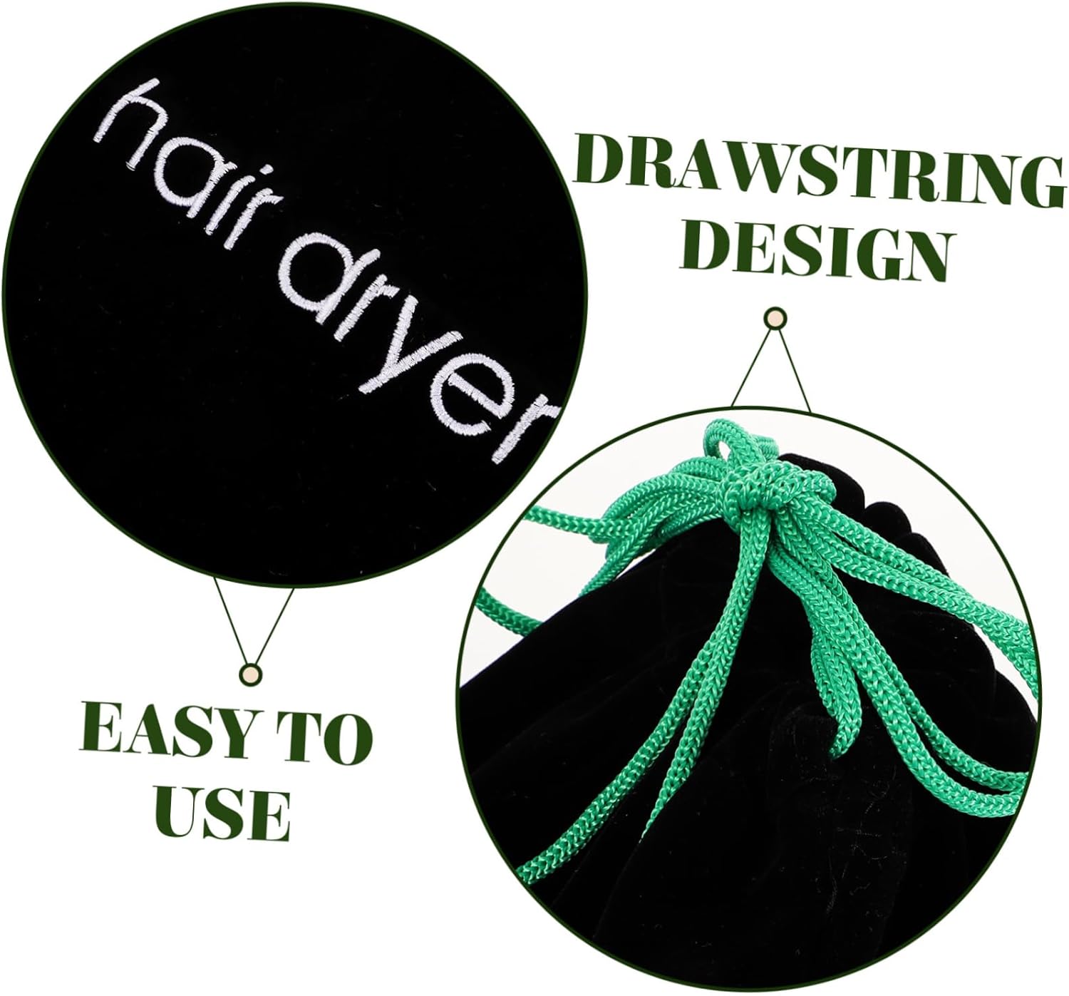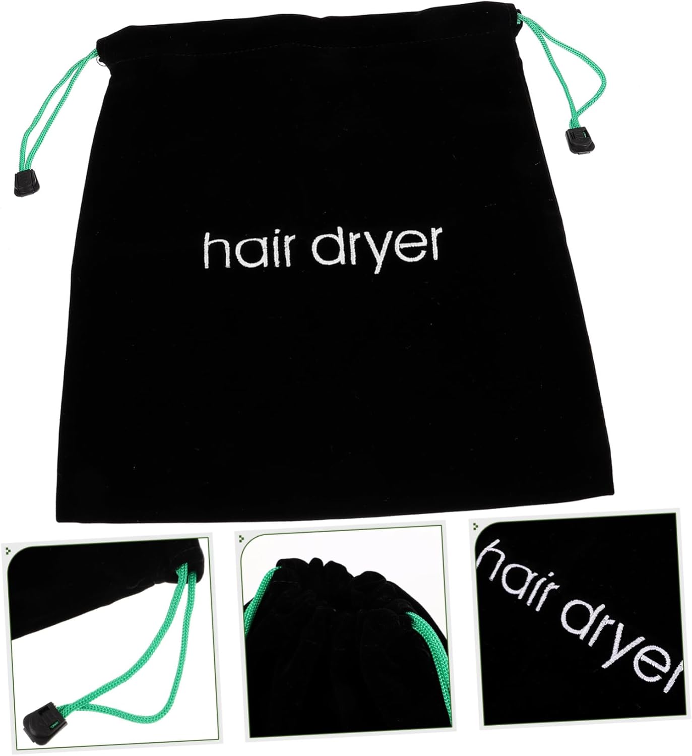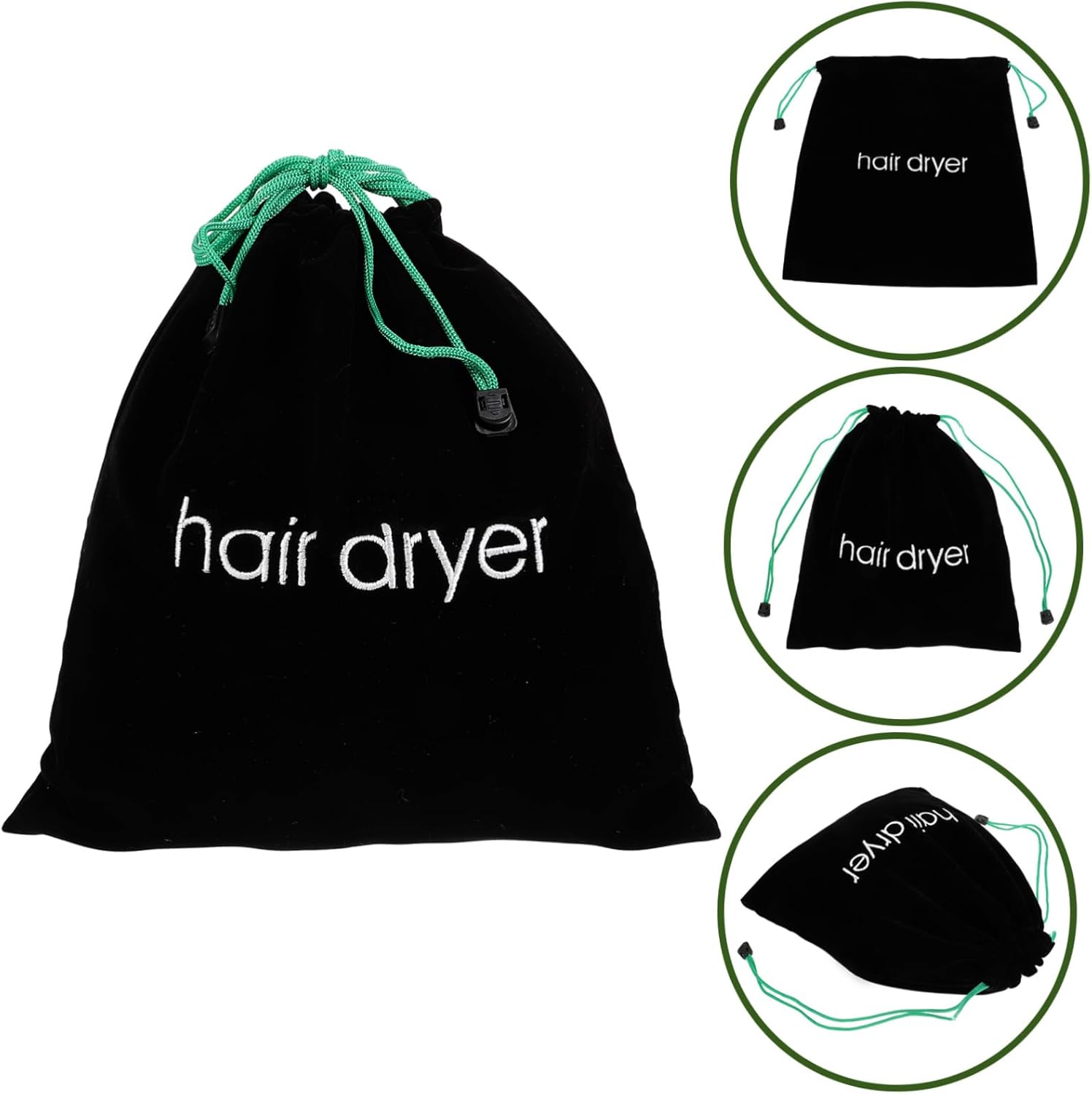 Package List 5 x Storage Bag Characteristics – Color: Black Hair Dryer Travel Bag – Material: Cloth bathroom hair dryer bag -Note:Random Color of the Rope Drawstring Container. – Size: 32.50X30.50X0.50cm/12.77X11.99X0.20inch Hair Dryer Pouch. – Meticulously designed with strong drawstrings to keep things securely inside the hair dryer storage Hair Dryer Bag. – They have a wide range of uses, also suitable for jewelries, sundries storage, and Household Product. – A smart way to store a hair dryer in hotels, rentals, guest houses or even at home travel hair. – Our bag with clear, long-lasting “hair dryer” word helps the guests easily find the dryer travel bag for women. – Be it your travel bag, bathroom or guest bedroom, our hair dryer bag, helps keep many of your hairstyling accessories in one place and keeps the space uncluttered hair dryer bag travel.Goods Descriptioncotton drawstring bags Securely holds any travel accessory with drawstring pulls, contents of bag are not visible.hair dryer organize bag Set it on the hotel sink to remind yourself to re-pack your blow-dryer or flat iron.Hair Dryer Organizer , large capacity, easy to use and comfortable