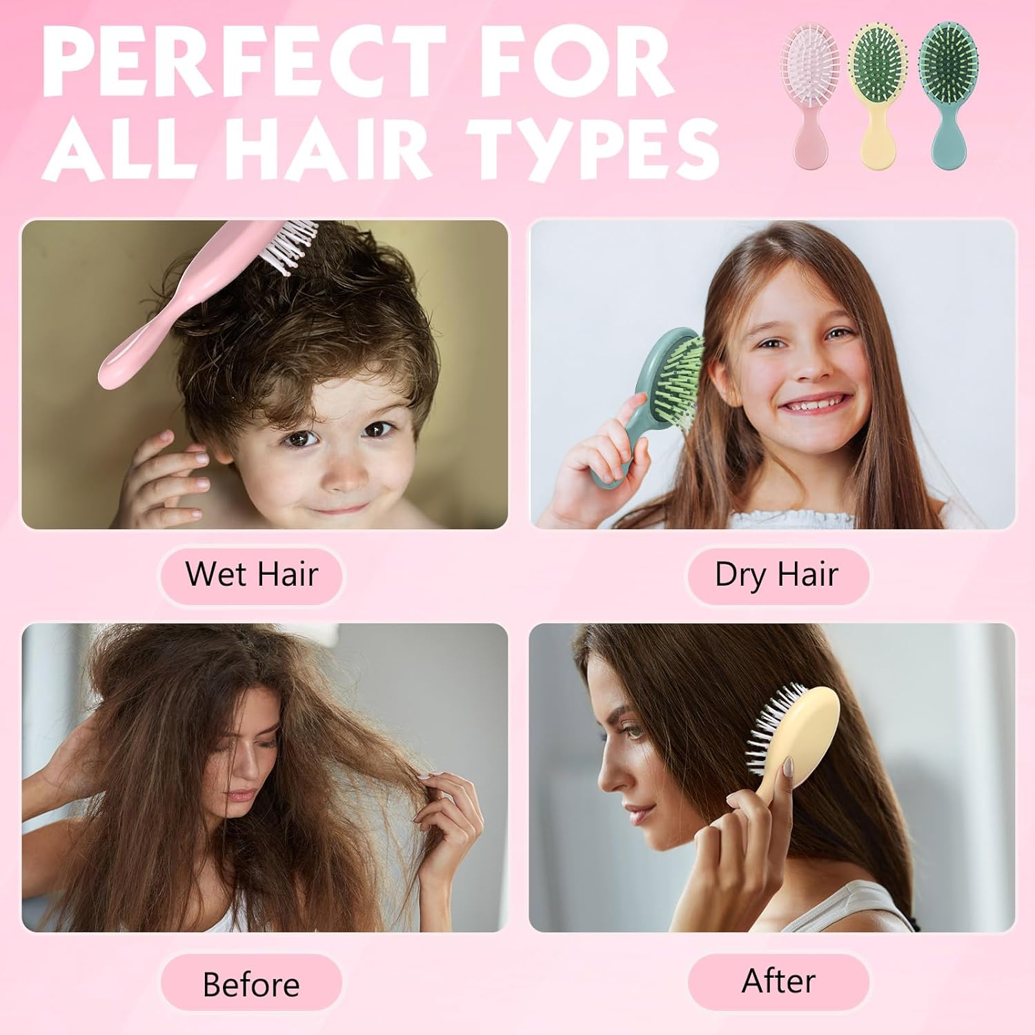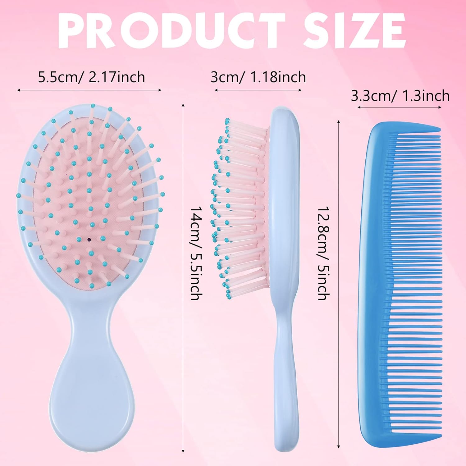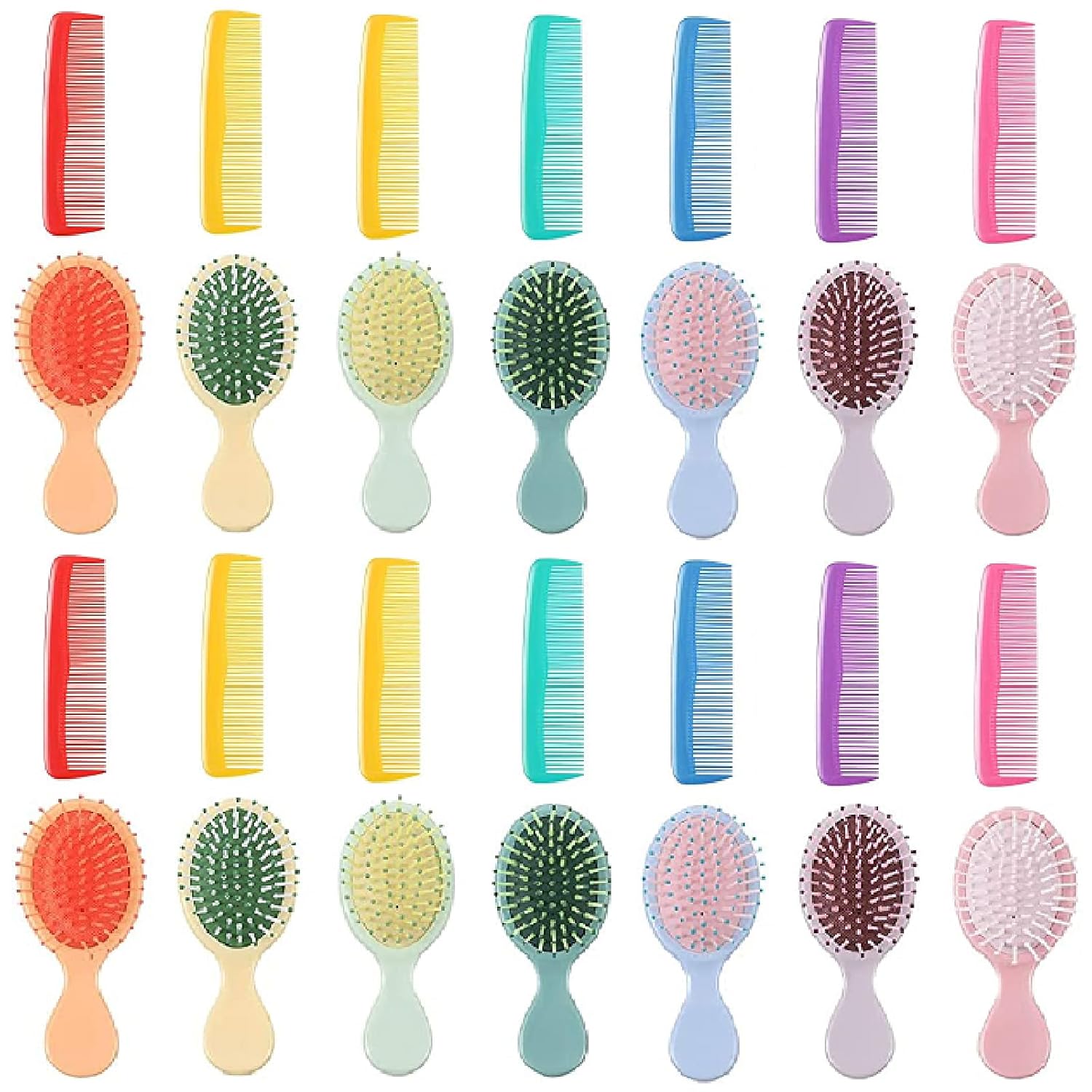 Paquete variado colorido: el juego de peine y cepillo para niños pequeños incluye 14 cepillos para el cabello y 14 peines para el cabello en varios colores; este colorido peine y cepillo aporta un toque divertido y fresco a tus rituales diarios de aseo, Material de calidad: hecho de plástico confiable, estos cepillos y peines de viaje están diseñados para un uso duradero mientras que son ligeros para un uso fácil durante el aseo del cabello, confiable y de calidad, estos peines y cepillo te dejarán una agradable experiencia de uso, Uso versátil: satisface las diversas necesidades de tu peinado con nuestros 2 estilos de cepillo y peines; ya sea desenredando, peinando o simplemente peinando en la vida cotidiana, te tenemos cubierto y te brindaremos mucha comodidad, Diseñado para la comodidad: con el juego de cepillos para bebé diseñado para un agarre cómodo y un toque suave en tu cabello, puedes esperar una experiencia de aseo suave e indolora; mantén tu cabello libre de daños con nuestros cepillos fáciles de usar, Dimensiones ideales: el cepillo húmedo y seco mide aproximadamente 5.5 x 2.17 pulgadas, y los peines son de aproximadamente 5 x 1.3 pulgadas, que son adecuados para varias longitudes y tipos de cabello; su tamaño compacto permite un fácil almacenamiento y portabilidad, y puedes llevarlos contigo fácilmente