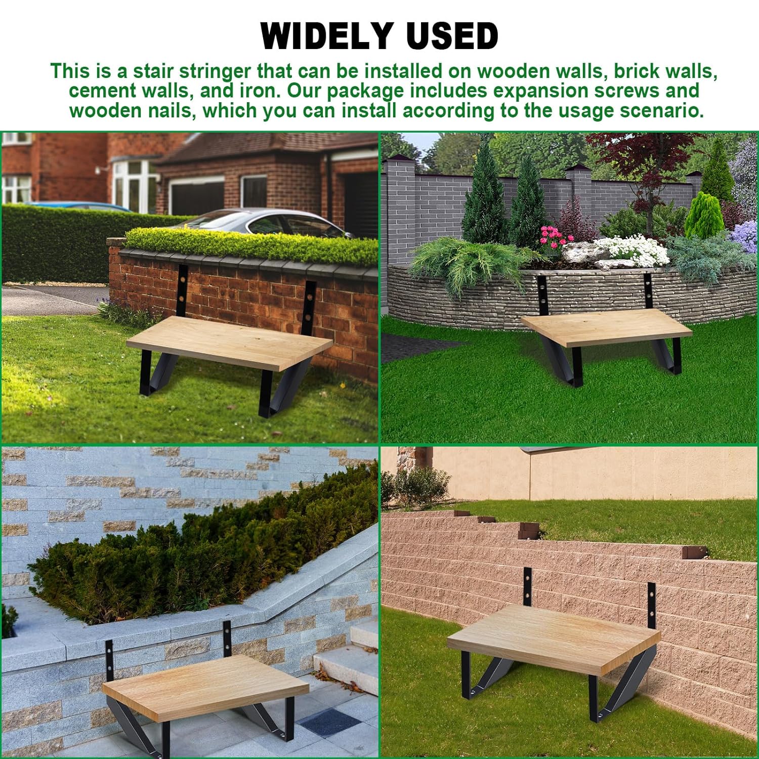 Acero galvanizado de alta resistencia: las características de este tipo de acero son su gran peso, densidad gruesa, fuerte capacidad de carga, durabilidad y resistencia al desgaste, por lo que es adecuado para uso en exteriores a largo plazo., 【Diseño de 4 agujeros】- Nuestro larguero de escalera de acero tiene 4 agujeros para pernos en cada segmento de escalera para conectar tablas de madera. Puedes elegir colocar de 1 a 4 tablas de madera, lo que hace que sea fácil encontrar las adecuadas y evitar que se aflojen., Fácil de instalar: Paso 1, posicionamiento; Paso 2, taladra agujeros con brocas de 3/8 pulgadas; Paso 3, inserta el tornillo de expansión para fijarlo; Paso 4, instala la tabla de madera., Ampliamente utilizado: este es un larguero de escalera que se puede instalar en paredes de madera, paredes de ladrillo, paredes de cemento y hierro. Nuestro paquete incluye tornillos de expansión y clavos de madera, que puedes instalar de acuerdo con el escenario de uso.