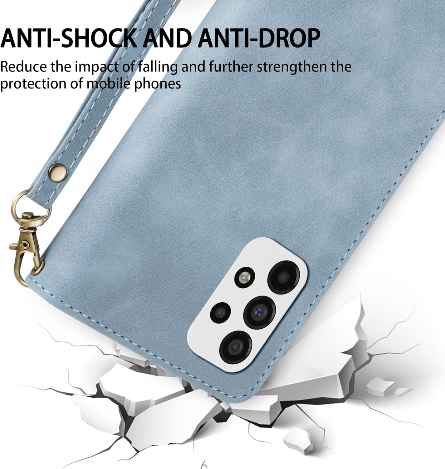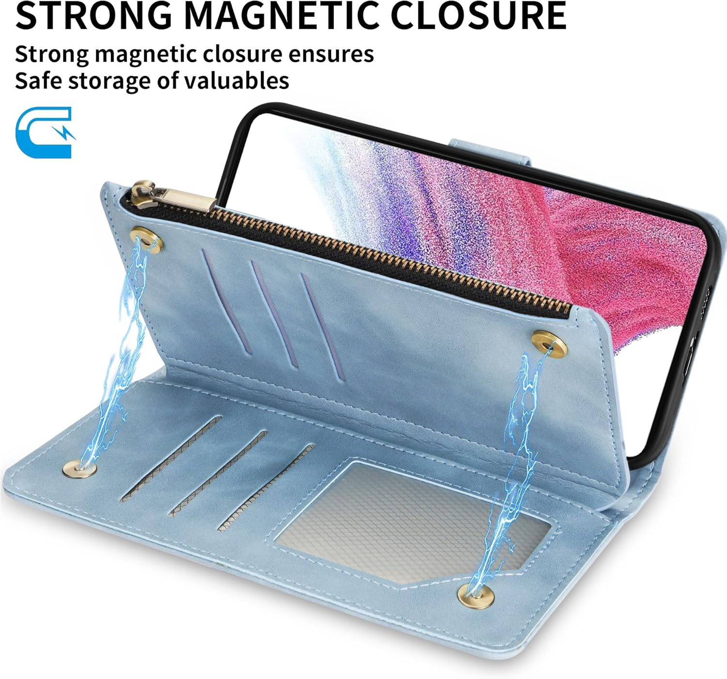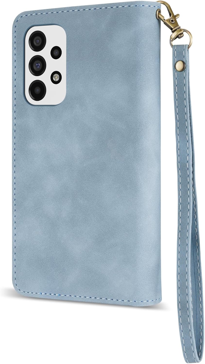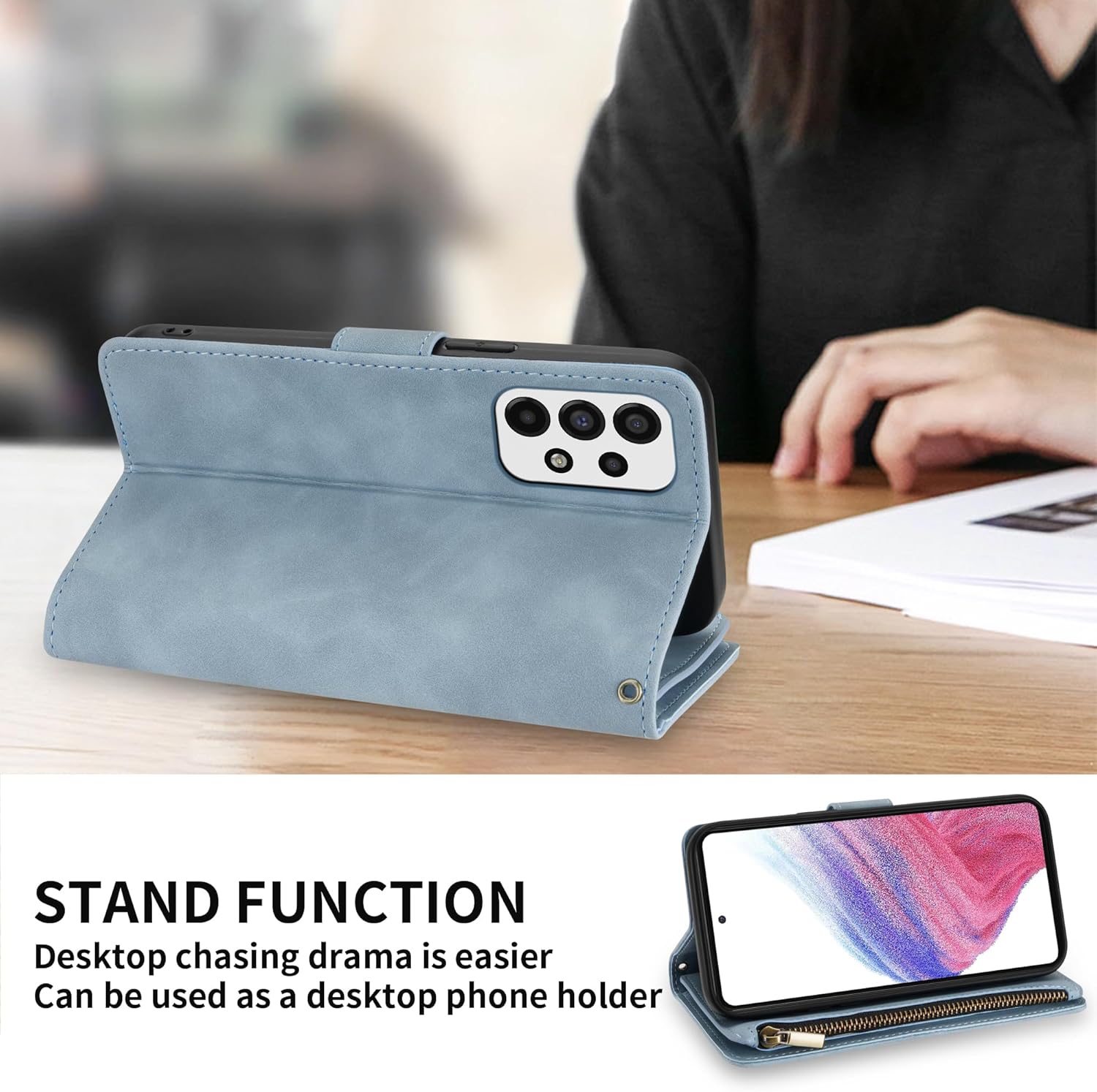 ZZXX – Funda tipo cartera compatible con Samsung A53 5G compatible con Galaxy A53 5G con soporte para ranura para tarjetas (pantalla de 6.5 pulgadas, lanzada en 2022) Color: azul claro. Alta calidad: esta funda tipo cartera está hecha de piel sintética de alta calidad, bloqueo RFID, se ve elegante y se siente natural y suave. Funda tipo cartera multifunción: múltiples ranuras para tarjetas de identificación y 1 comparación de efectivo y 1 moneda de almacenamiento con cremallera. Combinación perfecta de cartera y funda para teléfono celular. Permite un fácil acceso a todos los puertos, botones y funciones sin tener que quitar la funda. Protección completa: la funda rodea todos los bordes, cubre todo el teléfono con una protección completa en la parte delantera y trasera cuando el teléfono está en tu bolsillo y bolso, protege bien, sostiene el teléfono firmemente. El cierre magnético mantiene todos tus objetos de valor en su lugar de forma ordenada y segura, protegiéndolos contra el polvo, la suciedad y los arañazos. Diseño de vista de soporte: esta funda con soporte te permite disfrutar de tu teléfono sin sostenerlo a mano, incluso cuando haces algunas tareas domésticas, aún puedes disfrutar de tu video favorito. Diseño Elehant: está hecho de cuero seleccionado de primera calidad, que le proporciona una sensación cómoda en la mano. No importa en compras, fiestas, reuniones o visitas a clientes. Esta funda tipo cartera te dará poderes adicionales de personalidad y encanto. Además, sería un buen regalo para tu pareja, tu familia y tus amigos.