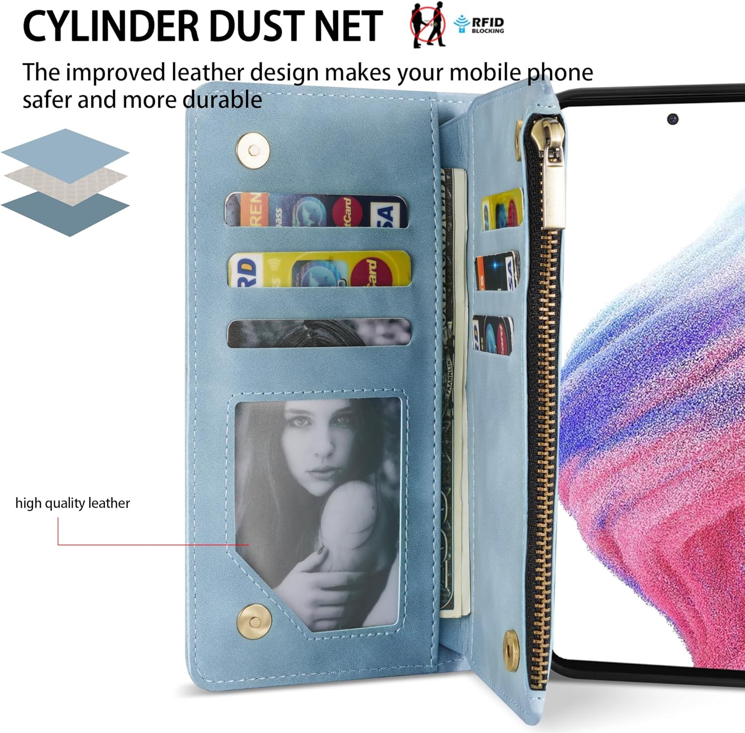 ZZXX Funda para Samsung Galaxy A53 5G con ranura para tarjeta de bloqueo RFID, piel sintética suave de alta calidad, con cremallera, con correa para