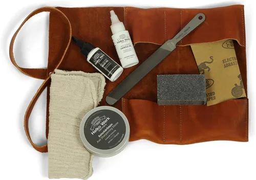 Kit completo de cuidado de hachas: este kit incluye todas las herramientas necesarias para mantener y cuidar tu hacha, ya sea en la tienda o en el campo. Todas las piezas están fabricadas en Alemania y Estados Unidos. Incluye rollo de herramientas de cuero personalizado (cuero de vaca de grano completo) – Lima de hacha de doble cara y corte único – Piedra de afilar hacha de doble cara – Bloque abrasivo de limpieza de cuchillas – 1 onza. Botella de aceite para mango de hacha – 1 onza Botella de aceite de cabeza de hacha – papel de lija de grano 150, impermeable, húmedo/seco – aceite multiusos / trapo de limpieza – 2 cuñas de anillo de acero de reparación Piedra de afilar de grano doble - Grueso (gris): grano 120 | fino (verde): grano 320. El lado grueso de la piedra de hacha debe utilizarse para restaurar bordes apagados, mientras que la fina realiza un afilado más fino con la herramienta de afilado de hachas. Esta piedra se puede utilizar en seco, o con agua o aceite como lubricante. El uso de aceite producirá los mejores resultados, pero la piedra también se puede utilizar con agua o simplemente secar. Lima de doble cara fabricada en Alemania: lima de afilar hacha de doble cara hecha de acero alemán C125W2 de alto carbono. Este afilador de hacha de archivo tiene una parte superior que es un patrón de dientes finos de un solo corte. La parte inferior es un patrón de dientes finos de doble corte. Los dientes de doble corte de la herramienta de archivo proporcionan una eliminación rápida de material más agresiva para reperfilar, o eliminar abolladuras y muescas forman un borde de hacha, y el corte único ofrece un afilado fino. Funda de cuero vacuno de grano completo: un excelente accesorio para proteger y llevar tu kit de mantenimiento Helko Werk 1844. Con el tiempo, el cuero envejecerá bien y desarrollará una pátina a través del uso.