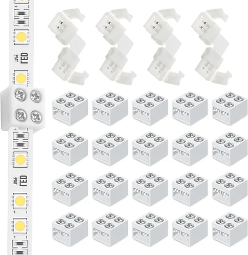 Características: estos conectores de tira de luces LED no requieren soldadura, con diseño atornillado, fácil de fijar y asegurar la luz de cinta, agradable para extender la longitud de la tira de luz LED. El conector LED de 2 pines en ángulo recto está incluido, creando una derivación rápida y una conexión sólida sin la molestia de soldar. Es fácil de operar, solo tienes que deslizar la tira de luz debajo de los pines del conector y ajustar el clip. Especificaciones: Material: plástico, metal. Color: blanco. Tamaño: como se muestra en la imagen. El paquete incluye: 20 conectores de luz de cinta LED, 4 conectores de esquina en ángulo recto. Notas: medición manual, por favor permita pequeños errores en el tamaño. El color puede variar ligeramente debido a las diferentes pantallas.