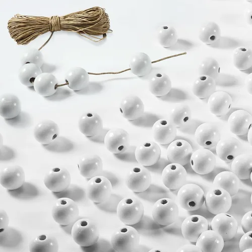 200 cuentas de madera de Navidad de 0.63 pulgadas para manualidades con cuerda de cáñamo de 3.9 pies, cuentas sueltas redondas de madera blanca para